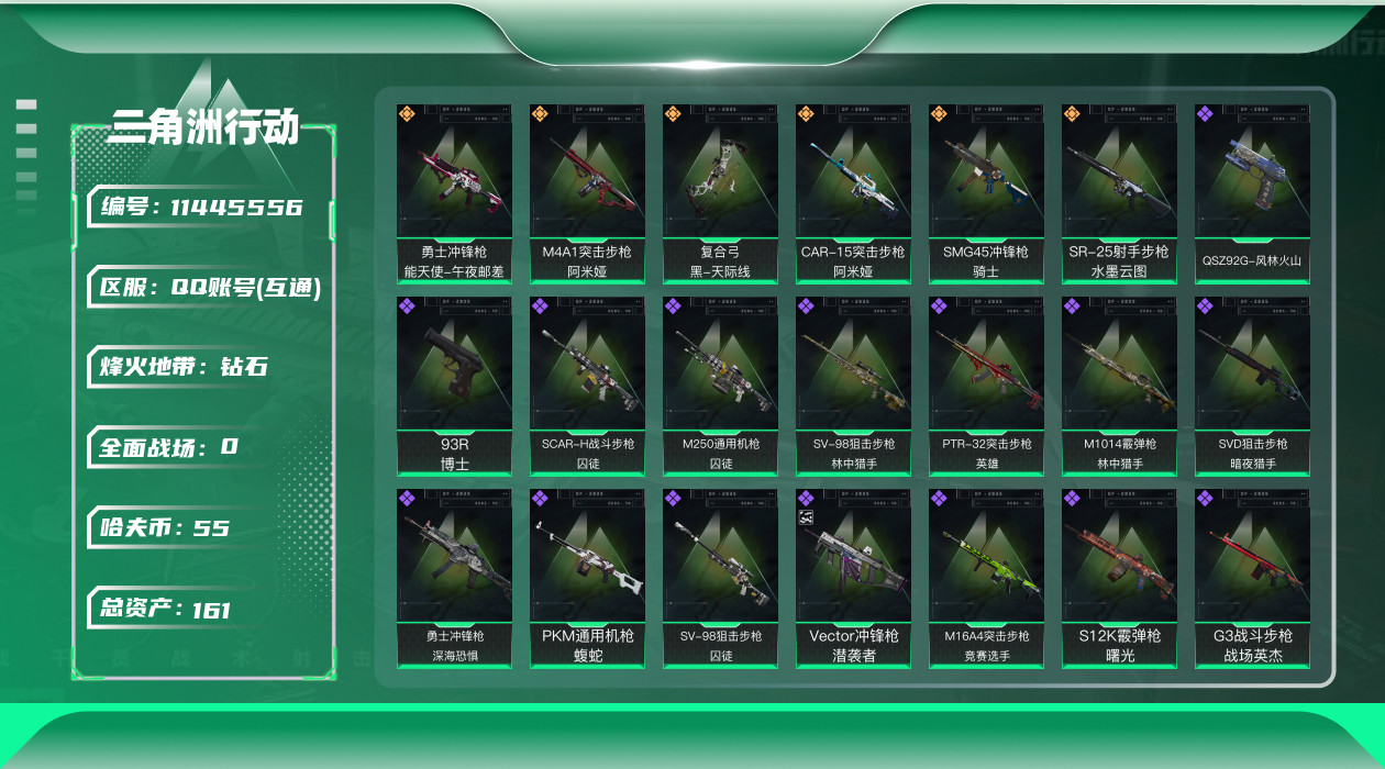 [11445556]总资产:161.3M 6传说枪械 哈夫币:55.788K 可二次 可修改实名 优质装备:顶级安全箱(3x3) 烽火地带段位:钻石 全面战场段位:尉官 传说武器皮肤:SR-25射手步枪-水墨云图,SMG45冲锋枪-骑士,M4A1突击步枪-阿米娅,CAR-15突击步枪-阿米娅,复合弓-黑-天际线,勇士冲锋枪-能天使-午夜邮差 史诗武器皮肤:Vector冲锋枪-潜袭者,PKM通用机枪-蝮蛇,G3战斗步枪-战场英杰,SVD狙击步枪-暗夜猎手,M16A4突击步枪-竞赛选手,勇士冲锋枪-深海恐惧,M1014霰弹枪-林中猎手,SV-98狙击步枪-林中猎手,PTR-32突击步枪-英雄,M250通用机枪-囚徒,SV-98狙击步枪-囚徒,SCAR-H战斗步枪-囚徒,SVD狙击步枪-阿萨拉工艺,S12K霰弹枪-曙光,QSZ92G-风林火山,93R-博士