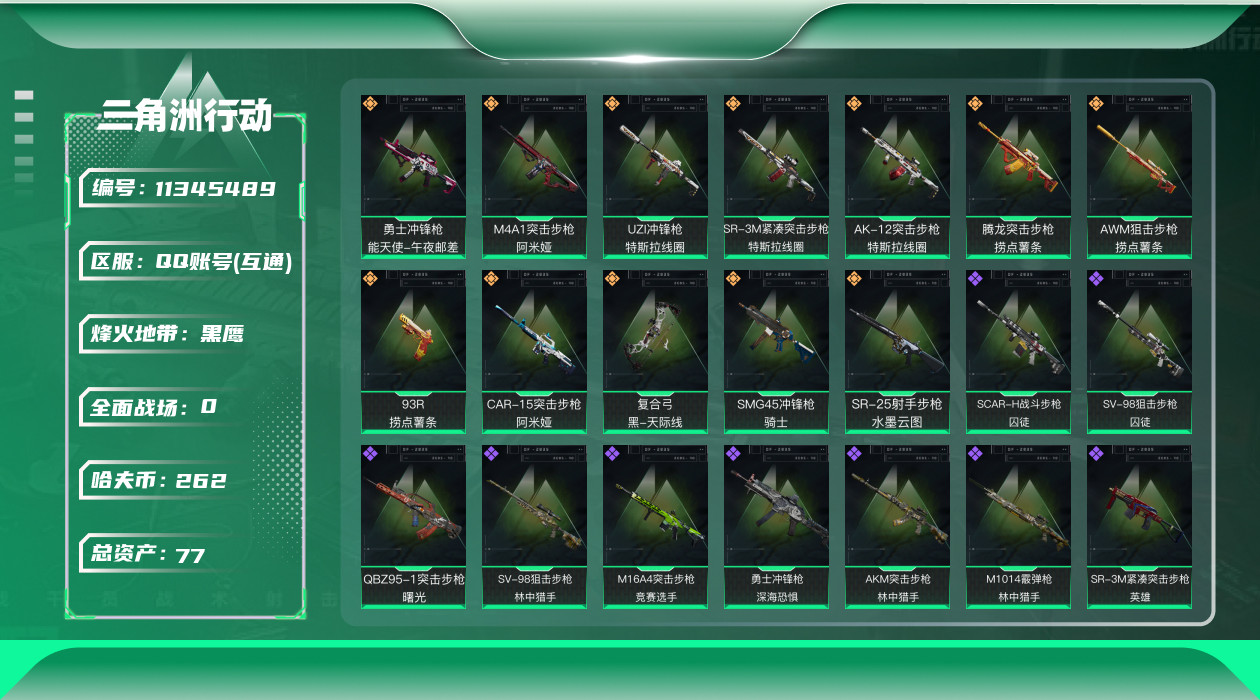 [11345489]总资产:77.9M 1干员外观 12传说枪械 哈夫币:262.281K 进阶安全箱(2×2)9.15号到期 可二次 可修改实名 烽火地带段位:黑鹰 全面战场段位:军士长 传说武器皮肤:SR-25射手步枪-水墨云图,SMG45冲锋枪-骑士,93R-捞点薯条,AWM狙击步枪-捞点薯条,腾龙突击步枪-捞点薯条,AK-12突击步枪-特斯拉线圈,CAR-15突击步枪-阿米娅,SR-3M紧凑突击步枪-特斯拉线圈,UZI冲锋枪-特斯拉线圈,勇士冲锋枪-能天使-午夜邮差,复合弓-黑-天际线,M4A1突击步枪-阿米娅 史诗武器皮肤:SR-3M紧凑突击步枪-英雄,M16A4突击步枪-竞赛选手,勇士冲锋枪-深海恐惧,AKM突击步枪-林中猎手,M1014霰弹枪-林中猎手,SV-98狙击步枪-林中猎手,SV-98狙击步枪-囚徒,SCAR-H战斗步枪-囚徒,QBZ95-1突击步枪-曙光,QSZ92G-风林火山 干员外观:露娜-黑·天际线