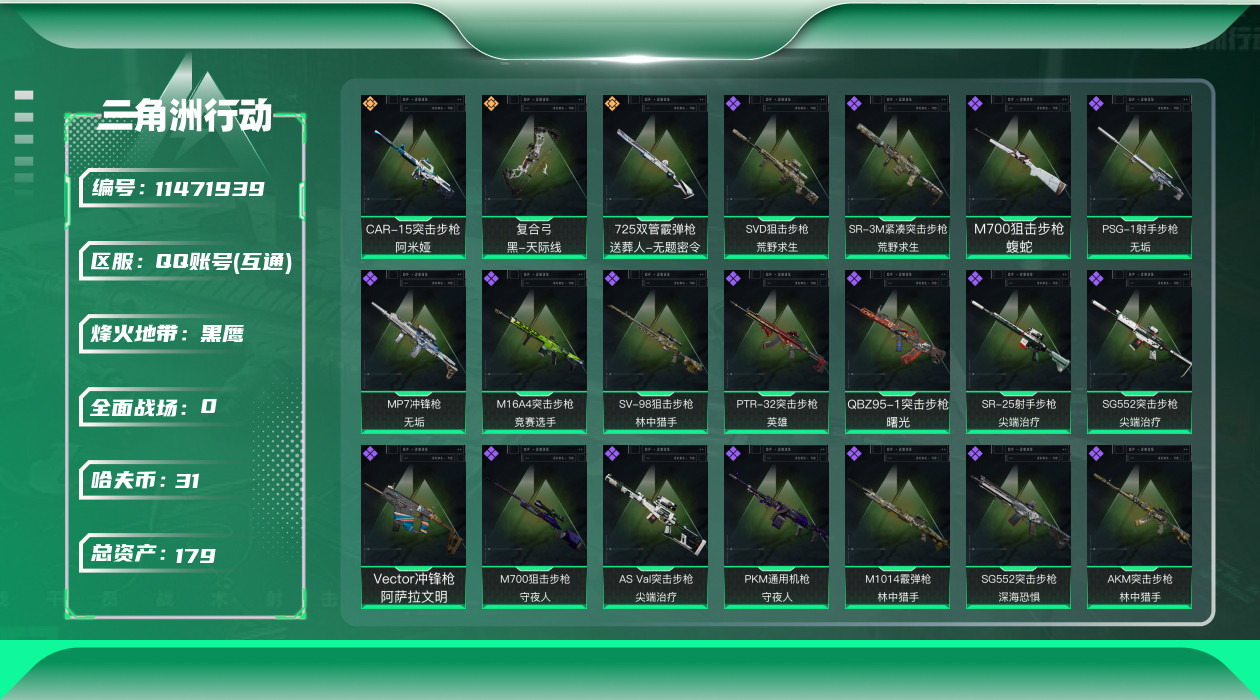 - [11687877]总资产:194M 1干员外观 1近战传说 16传说枪械 哈夫币:1.682K 可二次 可修改实名 优质装备:近战-黑海,顶级安全箱(3x3) 烽火地带段位:三角洲巅峰 全面战场段位:列兵 传说武器皮肤:SR-25射手步枪-水墨云图,SCAR-H战斗步枪-铁艺苍穹,AK-12突击步枪-夜鹰,SMG45冲锋枪-骑士,CAR-15突击步枪-阿米娅,复合弓-黑-天际线,AK-12突击步枪-特斯拉线圈,SR-3M紧凑突击步枪-特斯拉线圈,UZI冲锋枪-特斯拉线圈,勇士冲锋枪-能天使-午夜邮差,725双管霰弹枪-送葬人-无题密令,MP5冲锋枪-黑海,QJB201轻机枪-黑海,M4A1突击步枪-蚀金玫瑰,CAR-15突击步枪-黑鹰坠落 史诗武器皮肤:QBZ95-1突击步枪-ACE,M4A1突击步枪-特勤执行,AUG突击步枪-特勤执行,Vector冲锋枪-红色彗星,PTR-32战斗步枪-ACE,SKS射手步枪-ACE,M700狙击步枪-蝮蛇,PKM通用机枪-蝮蛇,G3战斗步枪-战场英杰,Ash-12战斗步枪-守夜人,SVD狙击步枪-暗夜猎手,M16A4突击步枪-竞赛选手,PKM通用机枪-守夜人,AS Val突击步枪-尖端治疗,M700狙击步枪-守夜人,SG552突击步枪-尖端治疗,SR-25射手步枪-尖端治疗,PKM通用机枪-荒野求生,MP5冲锋枪-深海恐惧,SG552突击步枪-深海恐惧,AKM突击步枪-林中猎手,SR-3M紧凑突击步枪-荒野求生,M1014霰弹枪-林中猎手,PTR-32突击步枪-英雄,SVD狙击步枪-荒野求生,AS Val突击步枪-典狱官,M250通用机枪-囚徒,SV-98狙击步枪-囚徒,SCAR-H战斗步枪-囚徒,腾龙突击步枪-无垢,MP7冲锋枪-无垢,PSG-1射手步枪-无垢,M14射手步枪-黑鹰坠落,QBZ95-1突击步枪-曙光,沙漠之鹰-曙光,Vector冲锋枪-阿萨拉文明,SVD狙击步枪-阿萨拉工艺,S12K霰弹枪-曙光 干员外观:红狼-蚀金玫瑰
