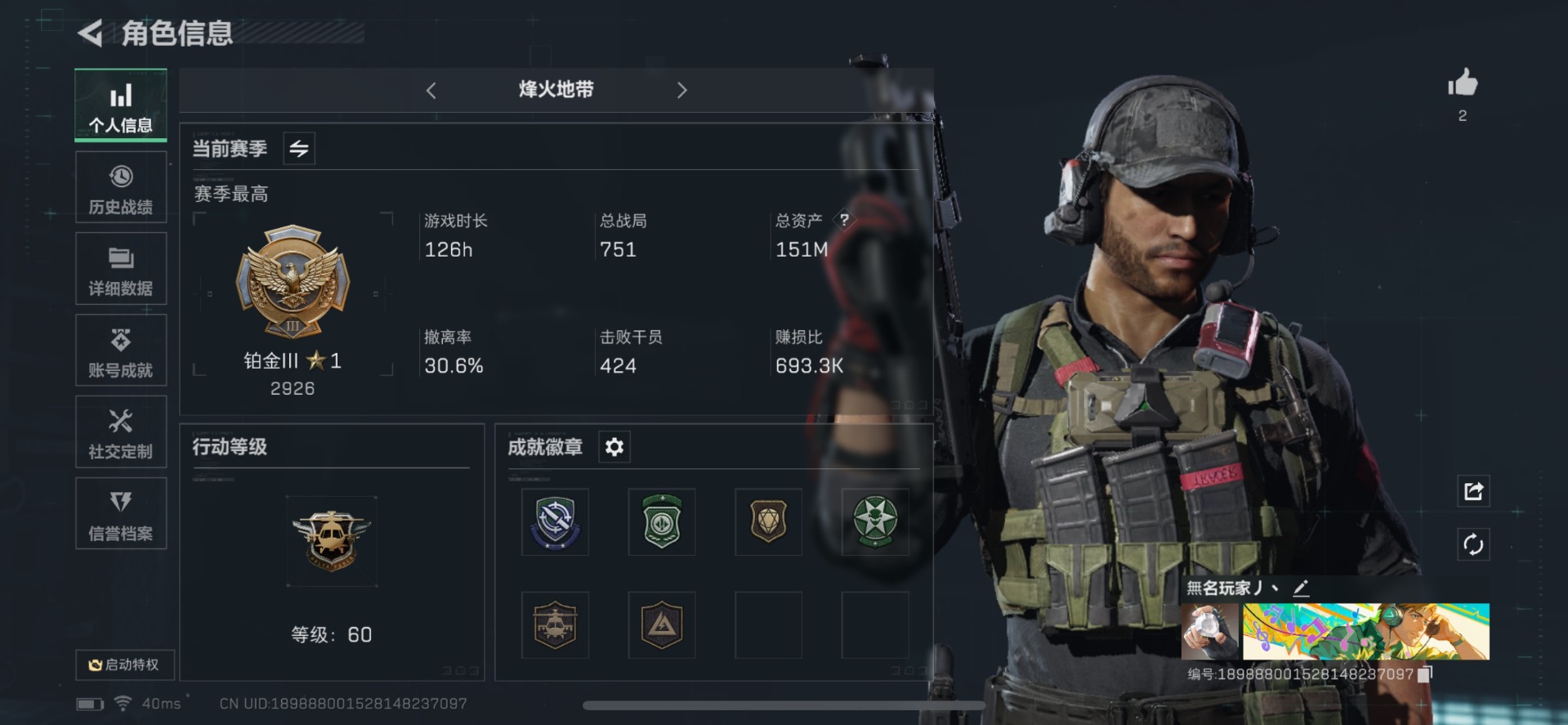 [11306068]总资产:151M 5传说枪械 哈夫币:20.407K 高级安全箱(2×3)9.15号到期 可二次 可修改实名 烽火地带段位:铂金 全面战场段位:校官 传说武器皮肤:M4A1突击步枪-阿米娅,AWM狙击步枪-捞点薯条,腾龙突击步枪-捞点薯条,93R-捞点薯条,勇士冲锋枪-能天使-午夜邮差
