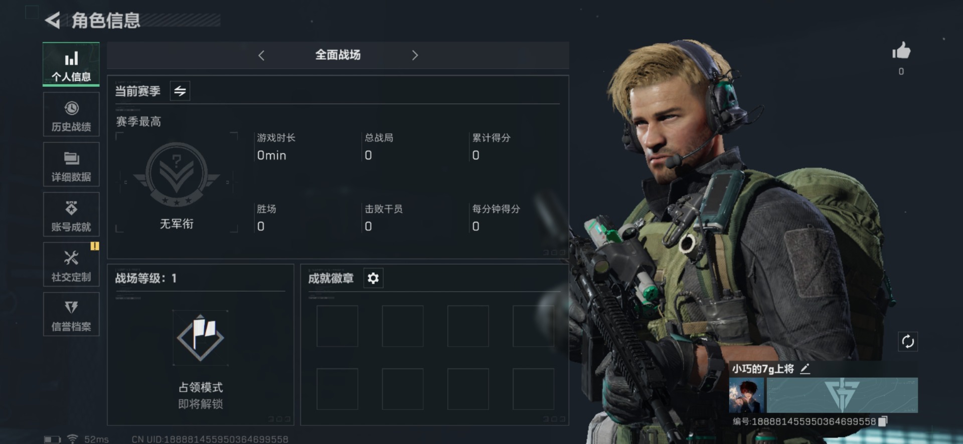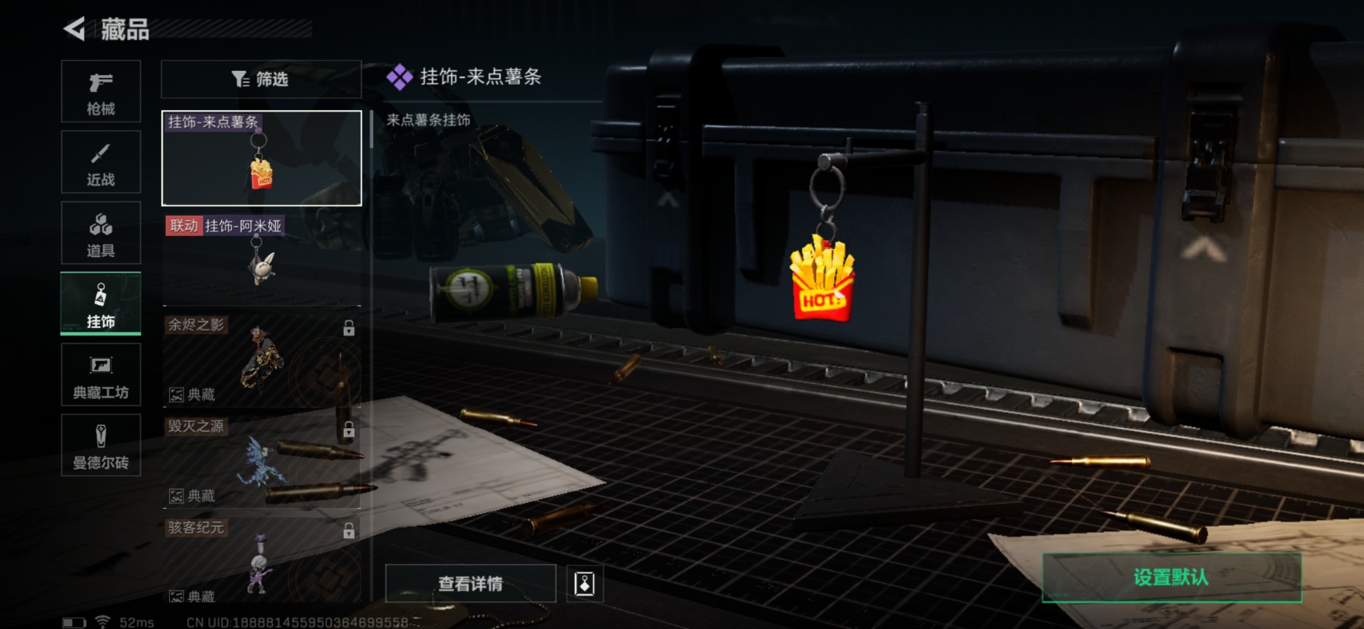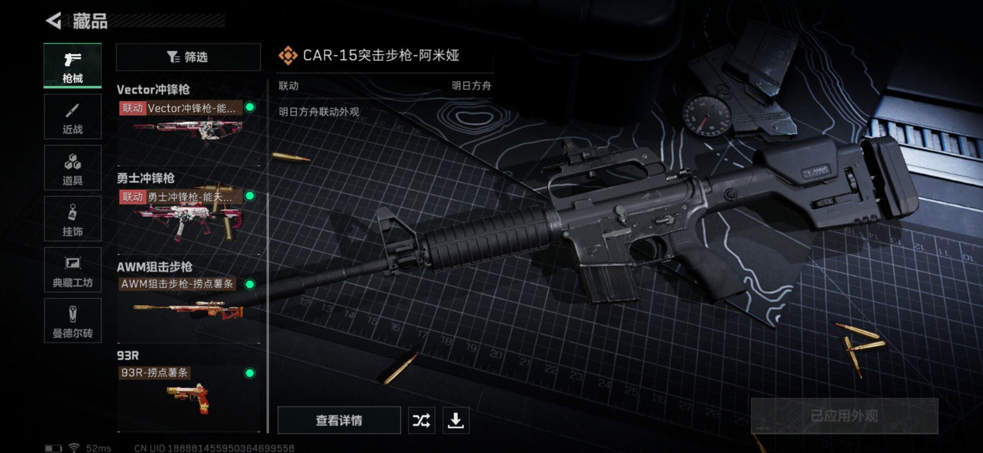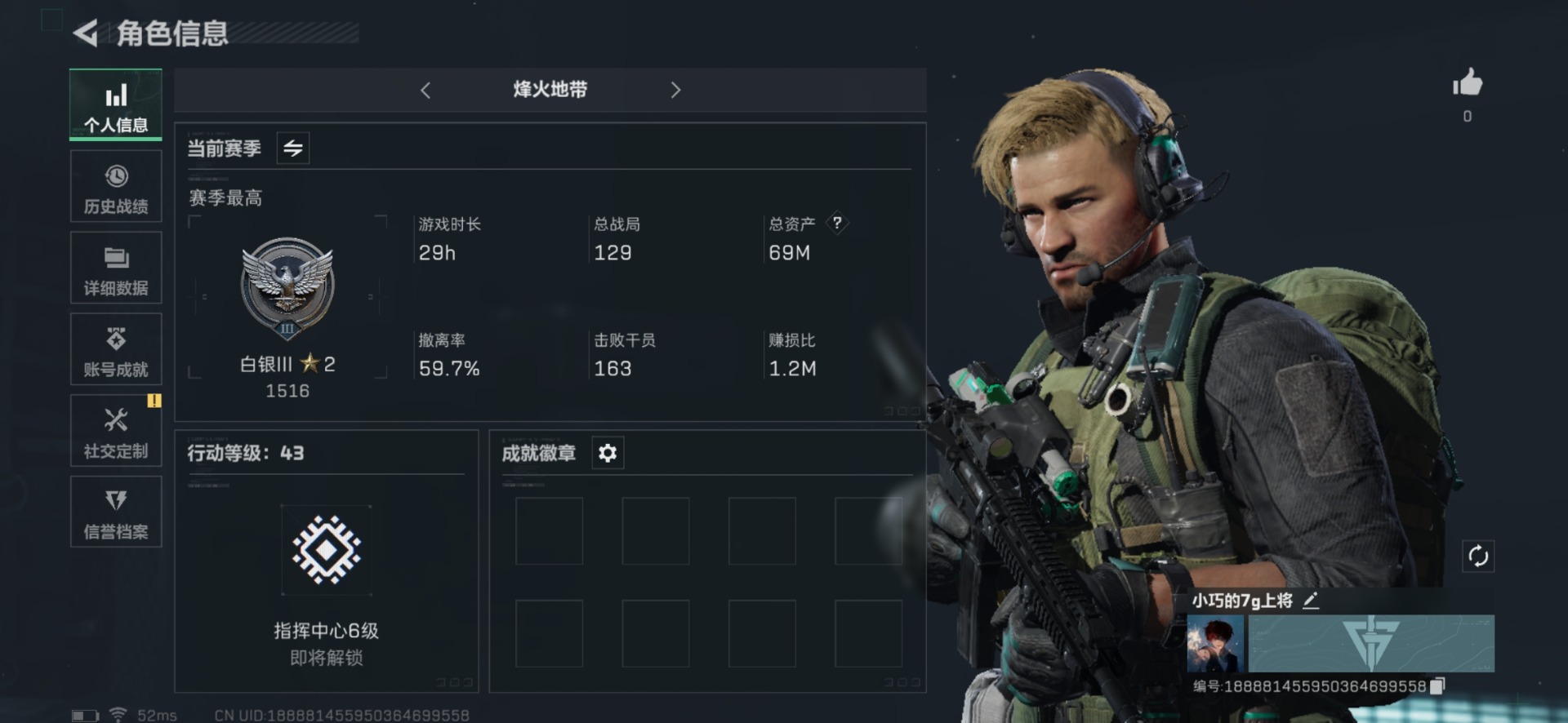 [11414138]总资产:69M 6传说枪械 哈夫币:60.074K 可二次 可修改实名 烽火地带段位:白银 全面战场段位:无段位 传说武器皮肤:93R-捞点薯条,AWM狙击步枪-捞点薯条,腾龙突击步枪-捞点薯条,CAR-15突击步枪-阿米娅,勇士冲锋枪-能天使-午夜邮差,Vector冲锋枪-能天使-午夜邮差