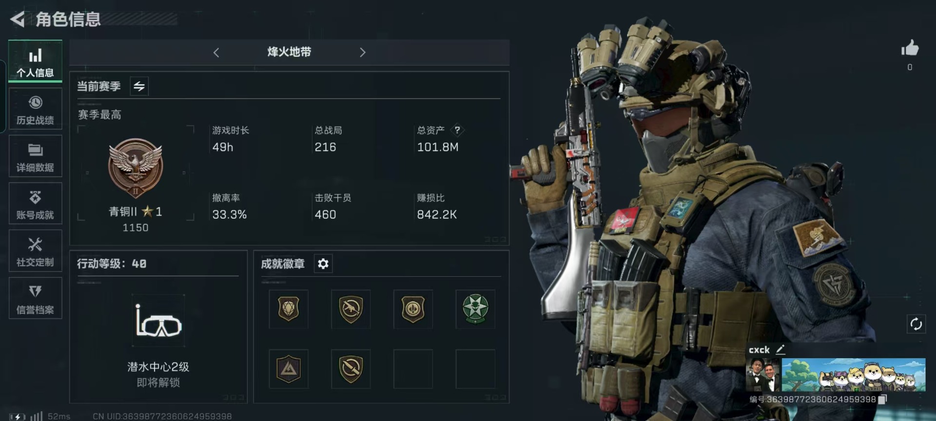 - [12086075]总资产:107.3 1干员外观 3传说枪械 可二次 可修改实名 烽火地带段位:无段位 全面战场段位:无段位 哈夫币:7.301 传说武器皮肤:AK-12突击步枪-夜鹰,复合弓-黑-天际线,725双管霰弹枪-送葬人-无题密令 史诗武器皮肤:SR-25射手步枪-尖端治疗,MP5冲锋枪-深海恐惧,SR-3M紧凑突击步枪-荒野求生,勇士冲锋枪-深海恐惧,AKM突击步枪-林中猎手,.357左轮-幸运时刻,SVD狙击步枪-暗夜猎手,M16A4突击步枪-竞赛选手,M1014霰弹枪-林中猎手,SV-98狙击步枪-林中猎手,PTR-32突击步枪-英雄,PSG-1射手步枪-无垢,M250通用机枪-囚徒,SV-98狙击步枪-囚徒,S12K霰弹枪-曙光,M14射手步枪-黑鹰坠落 干员外观:露娜-黑·天际线
