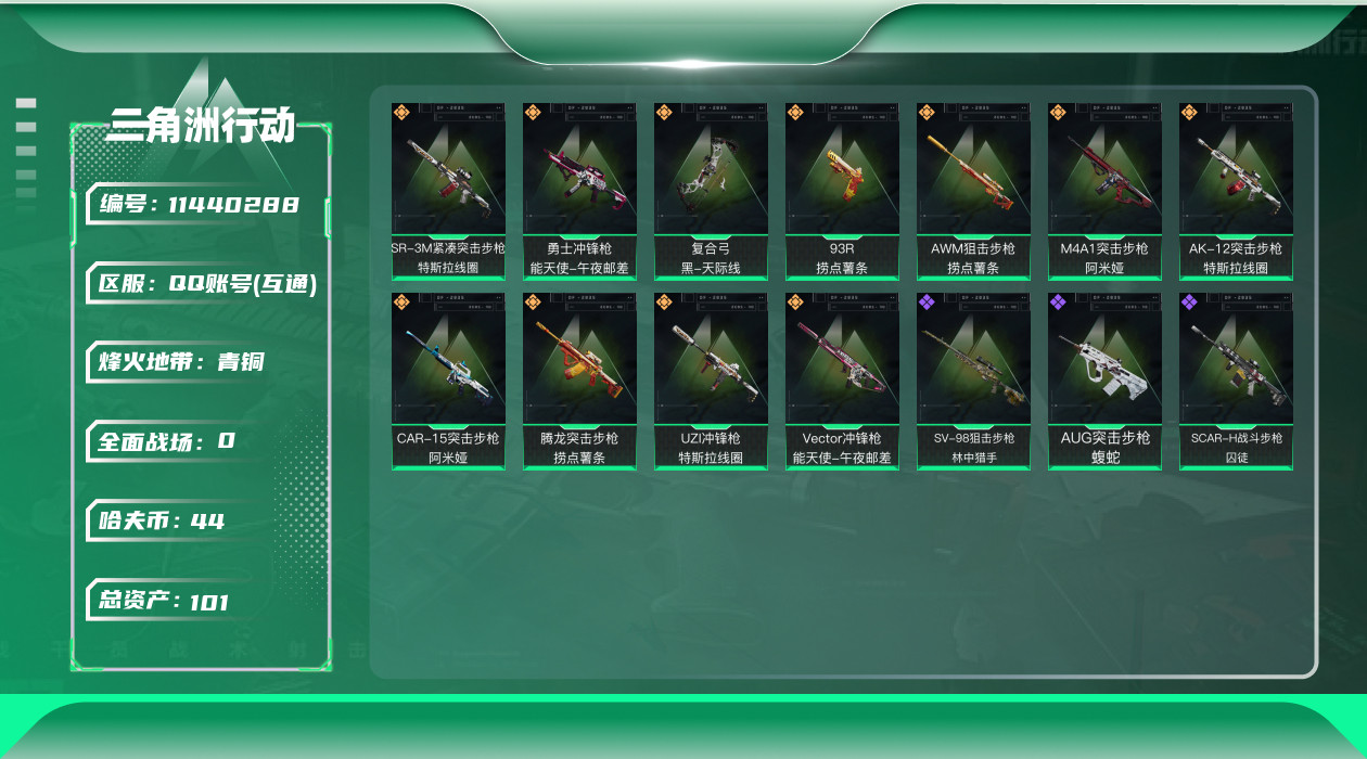 [11440288]总资产:101.8M 11传说枪械 哈夫币:44.396K 可二次 可修改实名 烽火地带段位:青铜 全面战场段位:无段位 传说武器皮肤:93R-捞点薯条,AWM狙击步枪-捞点薯条,腾龙突击步枪-捞点薯条,AK-12突击步枪-特斯拉线圈,CAR-15突击步枪-阿米娅,SR-3M紧凑突击步枪-特斯拉线圈,UZI冲锋枪-特斯拉线圈,勇士冲锋枪-能天使-午夜邮差,Vector冲锋枪-能天使-午夜邮差,复合弓-黑-天际线,M4A1突击步枪-阿米娅 史诗武器皮肤:AUG突击步枪-蝮蛇,SV-98狙击步枪-林中猎手,SCAR-H战斗步枪-囚徒