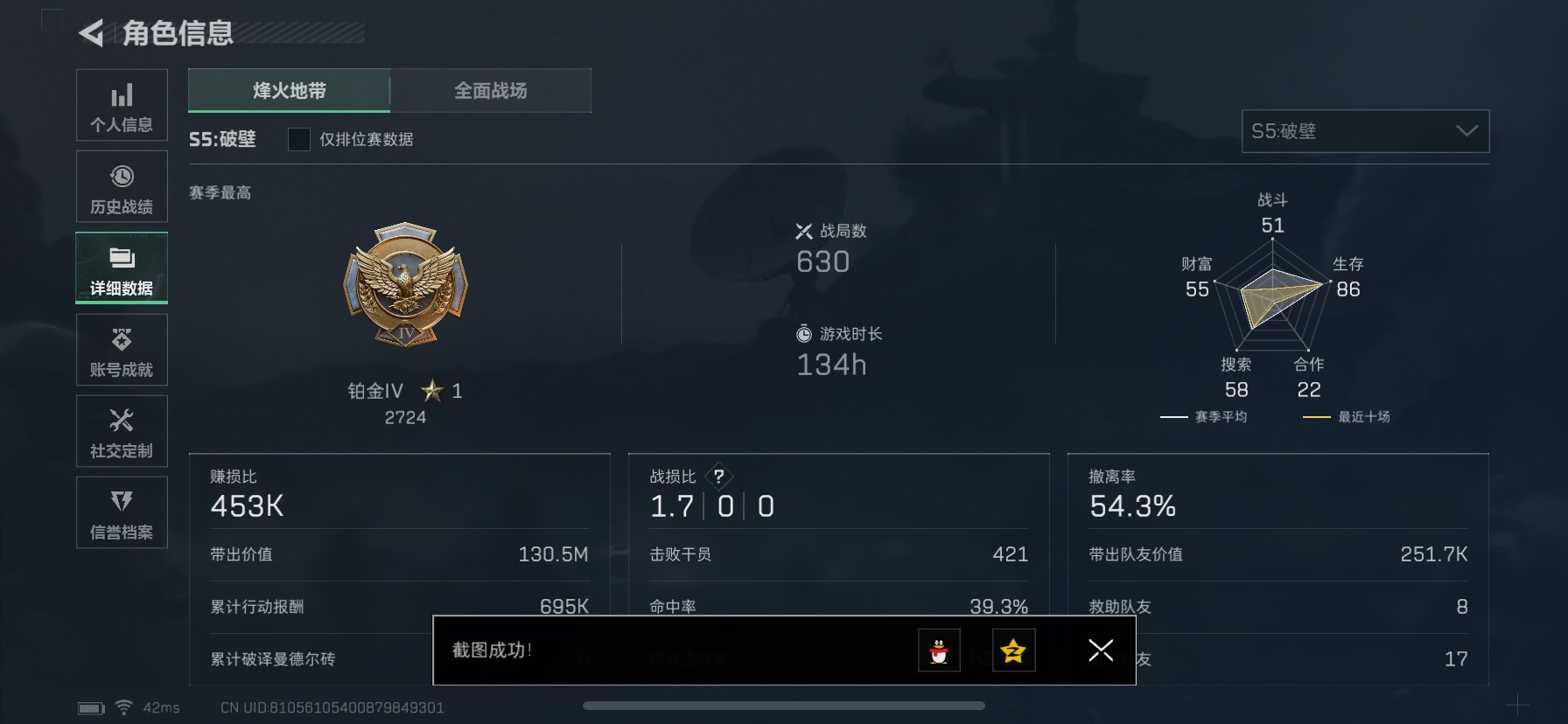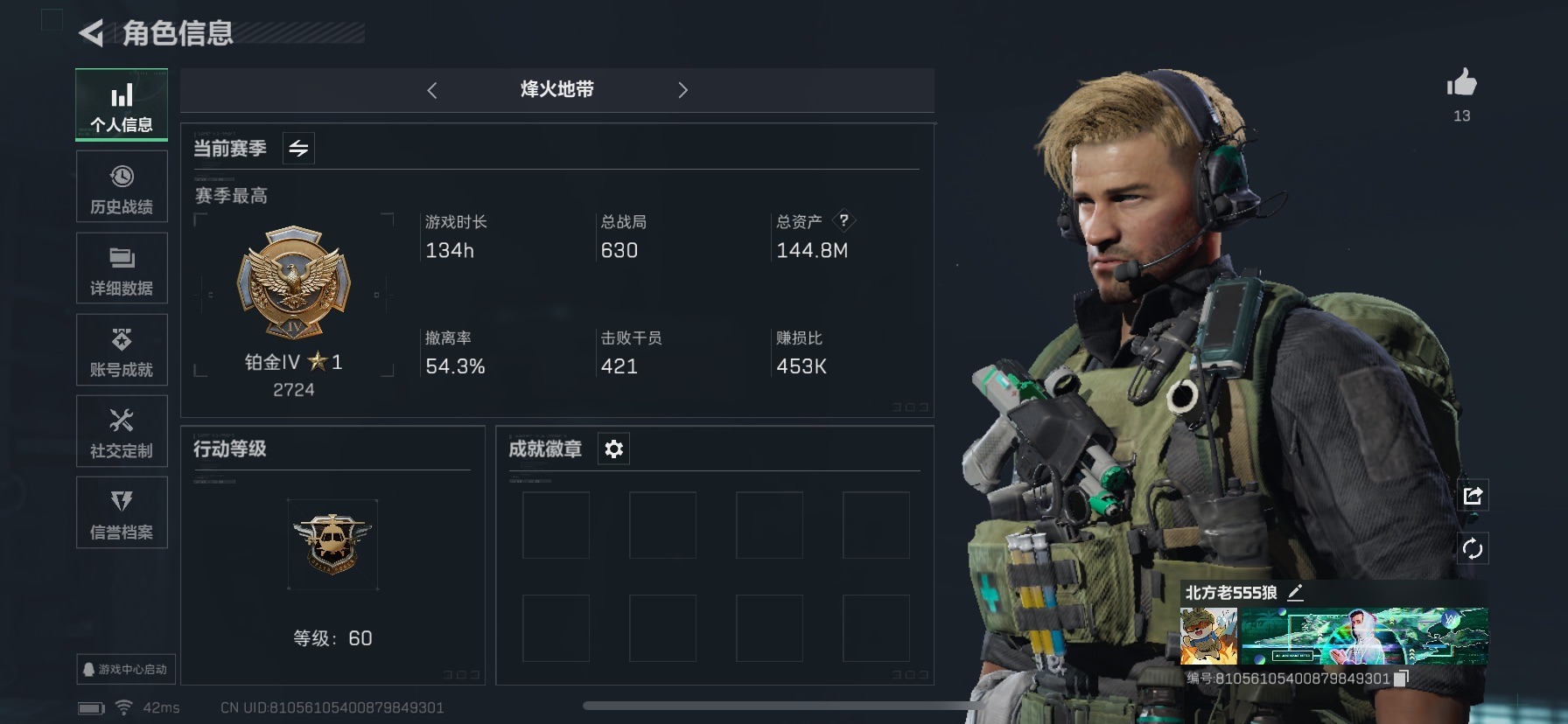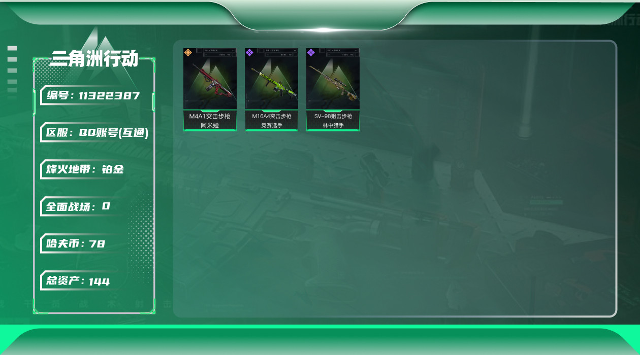 [11322387]总资产:144.8M 1传说枪械 哈夫币:78.079K 进阶安全箱(9.17到期) 可二次 可修改实名 烽火地带段位:铂金 全面战场段位:无段位 传说武器皮肤:M4A1突击步枪-阿米娅 史诗武器皮肤:M16A4突击步枪-竞赛选手,SV-98狙击步枪-林中猎手