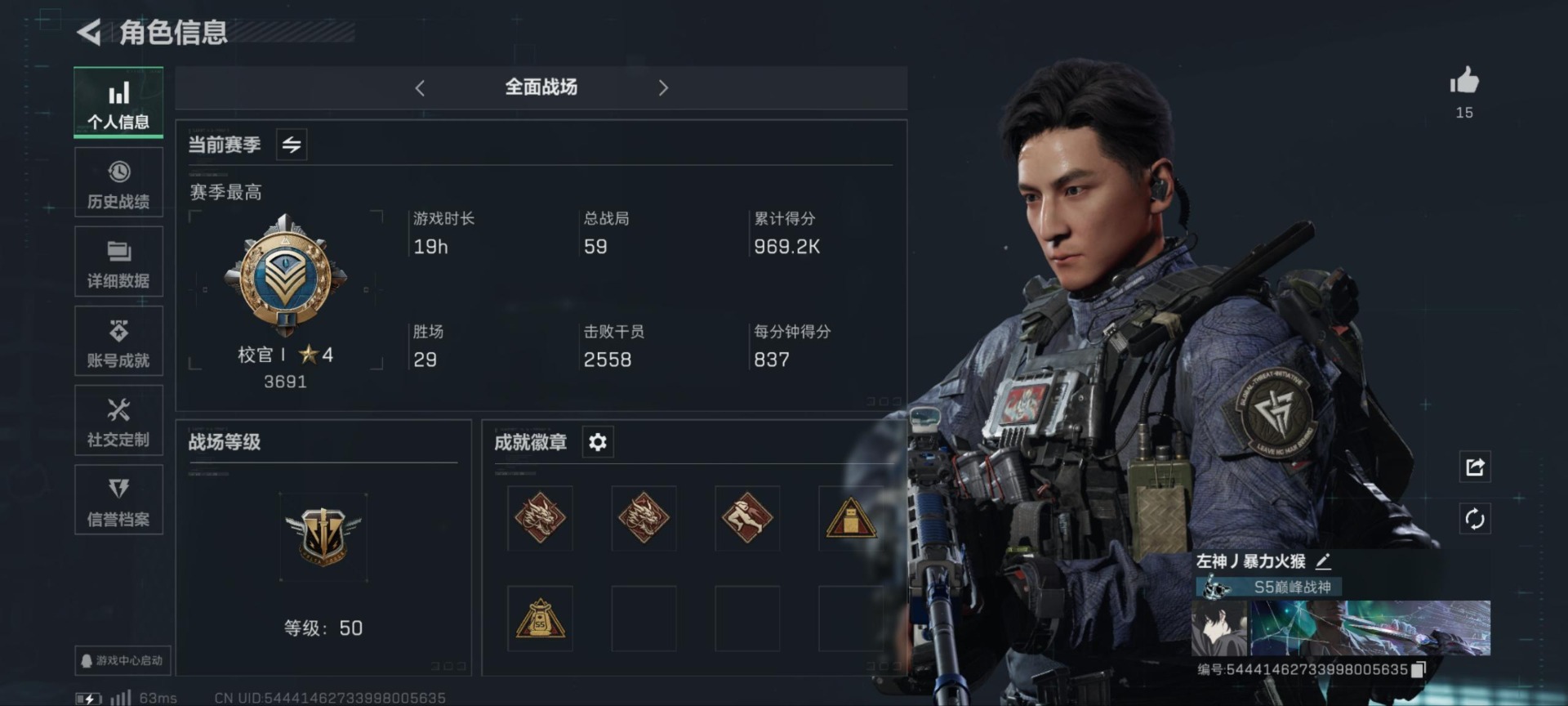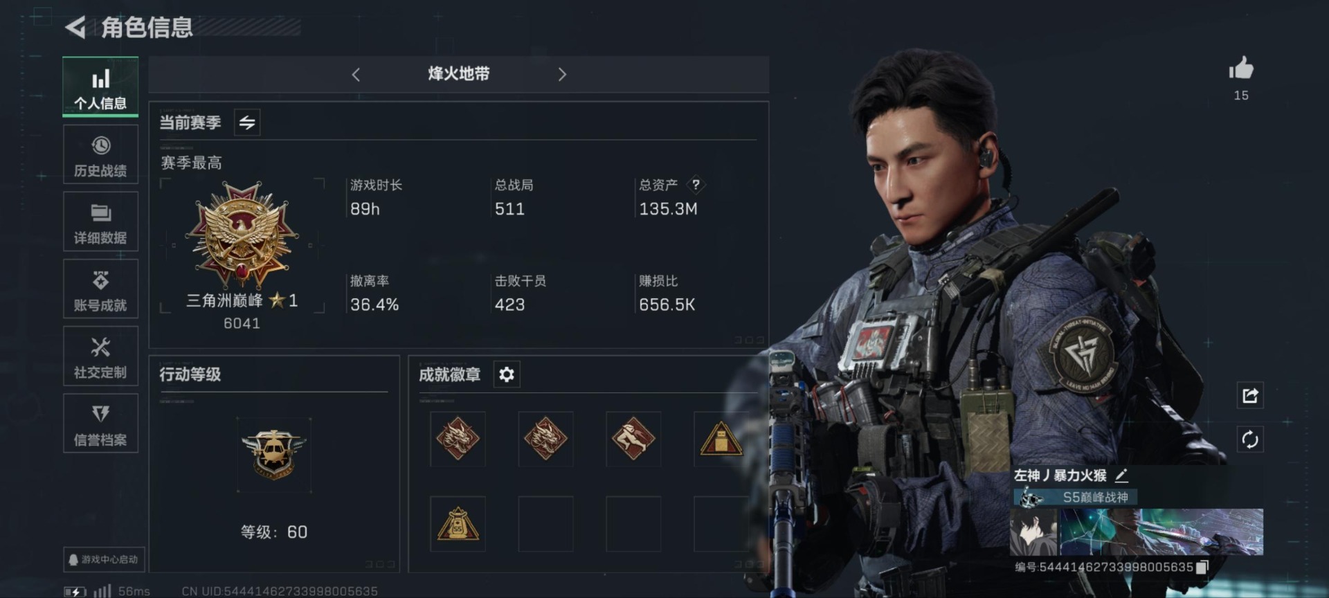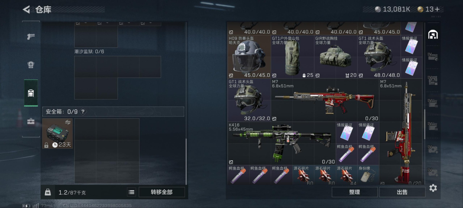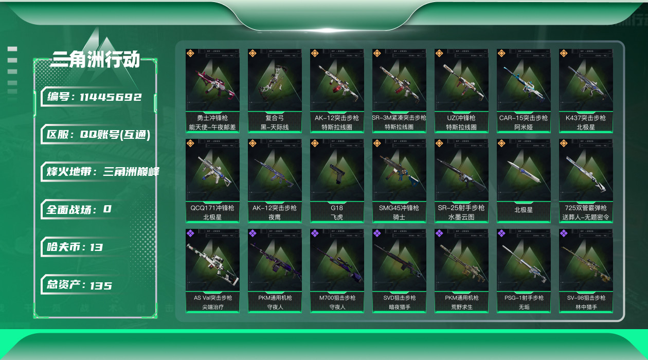 [11445692]总资产:135.3M 1干员外观 1近战传说 14传说枪械 哈夫币:13.081K 可二次 可修改实名 优质装备:近战-北极星,顶级安全箱(3x3) 烽火地带段位:三角洲巅峰 全面战场段位:校官 传说武器皮肤:SR-25射手步枪-水墨云图,AK-12突击步枪-夜鹰,G18-飞虎,SMG45冲锋枪-骑士,CAR-15突击步枪-阿米娅,复合弓-黑-天际线,QCQ171冲锋枪-北极星,AK-12突击步枪-特斯拉线圈,SR-3M紧凑突击步枪-特斯拉线圈,UZI冲锋枪-特斯拉线圈,勇士冲锋枪-能天使-午夜邮差,725双管霰弹枪-送葬人-无题密令,K437突击步枪-北极星 史诗武器皮肤:AUG突击步枪-蝮蛇,M700狙击步枪-蝮蛇,PKM通用机枪-蝮蛇,Ash-12战斗步枪-守夜人,SVD狙击步枪-暗夜猎手,M16A4突击步枪-竞赛选手,PKM通用机枪-守夜人,AS Val突击步枪-尖端治疗,M700狙击步枪-守夜人,SG552突击步枪-尖端治疗,SR-25射手步枪-尖端治疗,PKM通用机枪-荒野求生,MP5冲锋枪-深海恐惧,AKM突击步枪-林中猎手,SR-3M紧凑突击步枪-荒野求生,M1014霰弹枪-林中猎手,SV-98狙击步枪-林中猎手,PTR-32突击步枪-英雄,AS Val突击步枪-典狱官,M250通用机枪-囚徒,SV-98狙击步枪-囚徒,腾龙突击步枪-无垢,MP7冲锋枪-无垢,PSG-1射手步枪-无垢,QBZ95-1突击步枪-曙光,Vector冲锋枪-阿萨拉文明,S12K霰弹枪-曙光 干员外观:威龙-飞虎