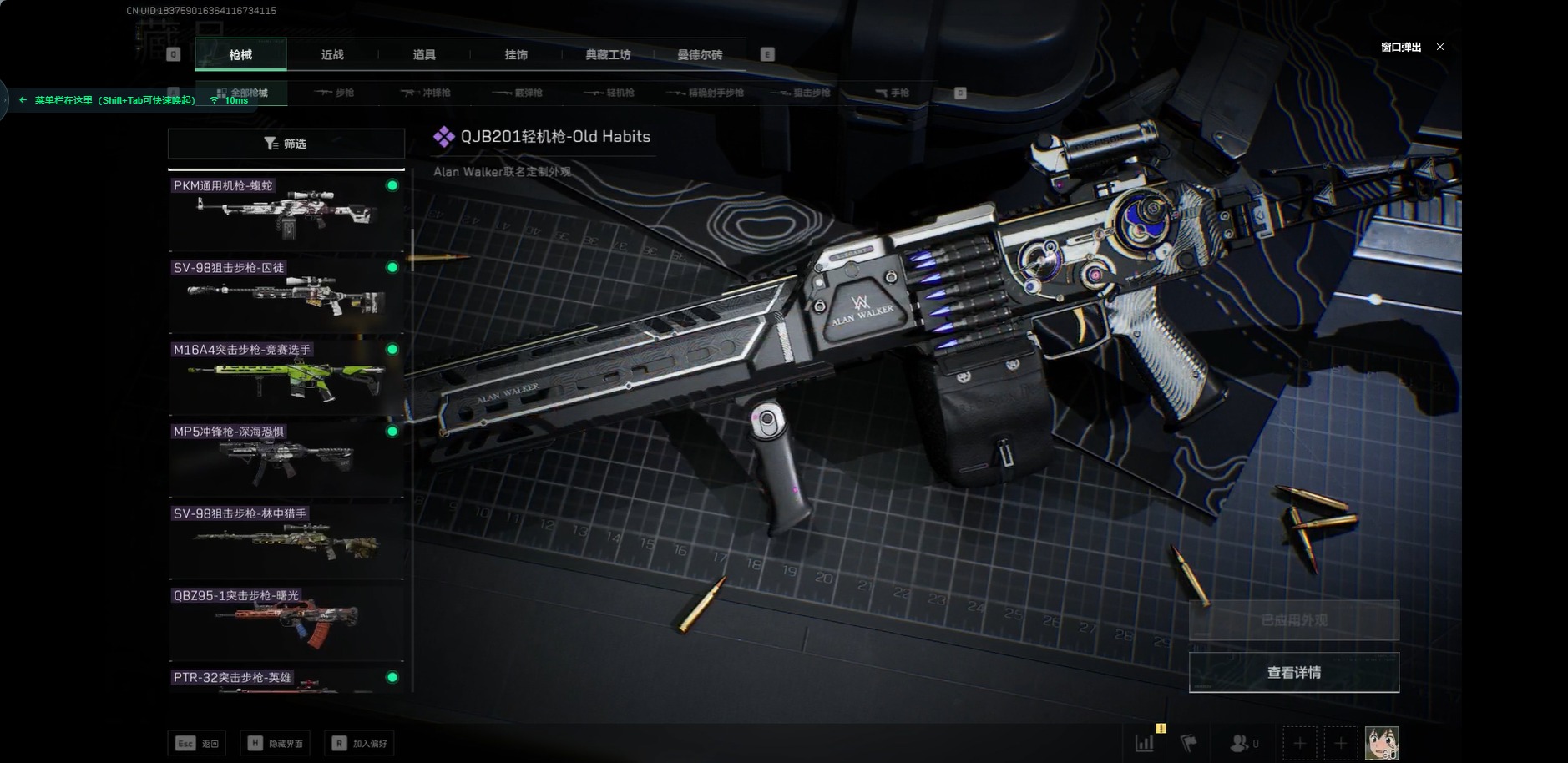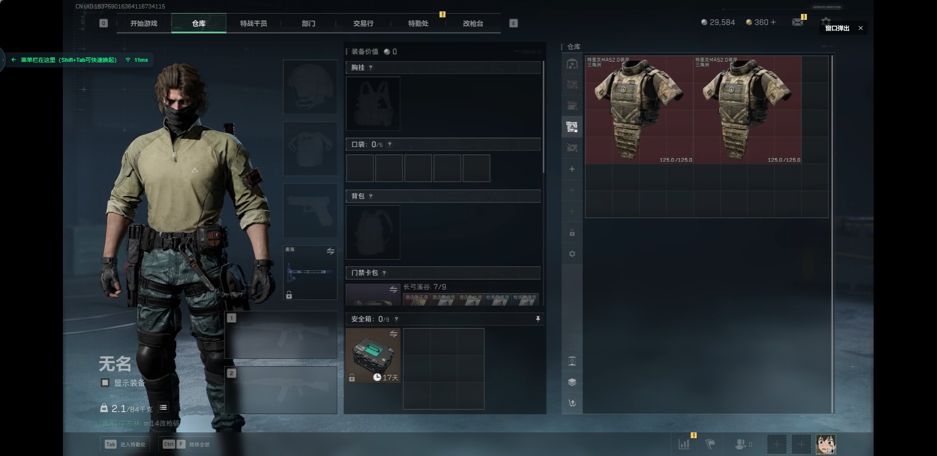 - [11680726]总资产:102.7 2传说枪械 高级安全箱(9.17到期) 可二次 可修改实名 烽火地带段位:钻石 全面战场段位:无段位 哈夫币:86.001 传说武器皮肤:复合弓-黑-天际线,725双管霰弹枪-送葬人-无题密令 史诗武器皮肤:PKM通用机枪-荒野求生,M16A4突击步枪-竞赛选手,SV-98狙击步枪-林中猎手,PSG-1射手步枪-无垢,SCAR-H战斗步枪-囚徒
