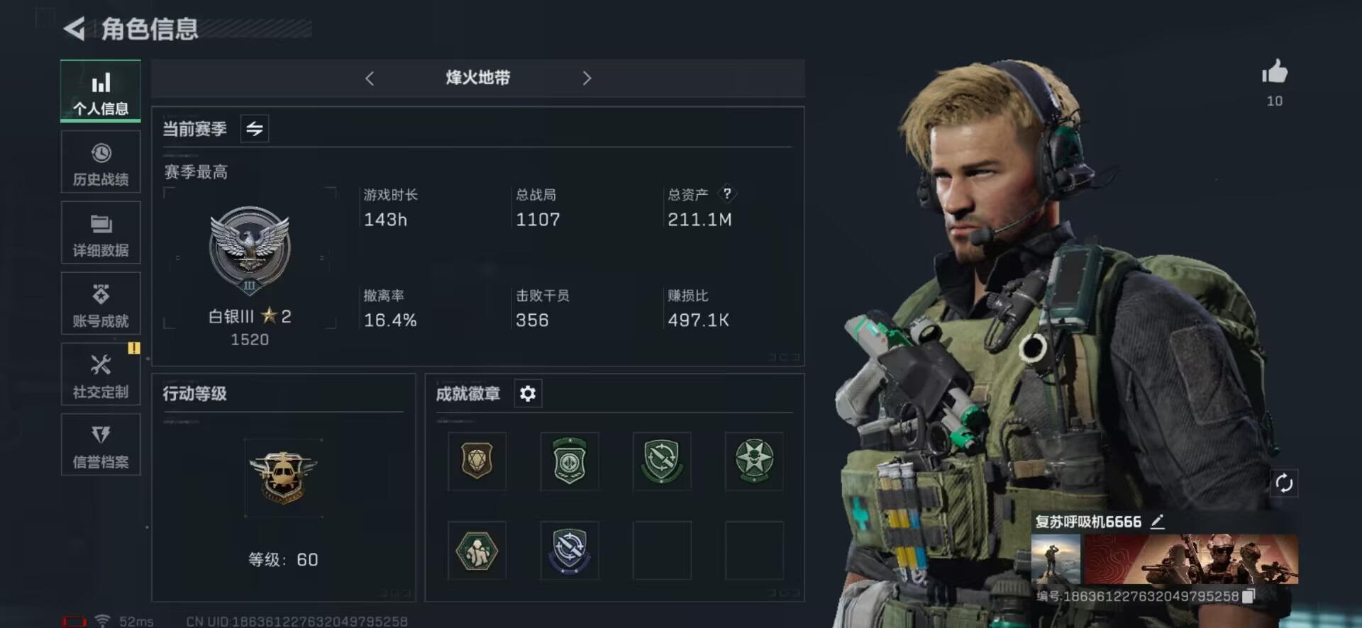 [11343961]总资产:211.1M 10传说枪械 哈夫币:630.747K 进阶安全箱(2×2)9.15号到期 可二次 可修改实名 烽火地带段位:白银 全面战场段位:尉官 传说武器皮肤:Vector冲锋枪-狩猎时刻,G3战斗步枪-狩猎时刻,M16A4突击步枪-狩猎时刻,AK-12突击步枪-特斯拉线圈,CAR-15突击步枪-阿米娅,SR-3M紧凑突击步枪-特斯拉线圈,UZI冲锋枪-特斯拉线圈,勇士冲锋枪-能天使-午夜邮差,复合弓-黑-天际线,M4A1突击步枪-阿米娅 史诗武器皮肤:AKM突击步枪-林中猎手,M1014霰弹枪-林中猎手,SV-98狙击步枪-林中猎手,SV-98狙击步枪-囚徒,SCAR-H战斗步枪-囚徒