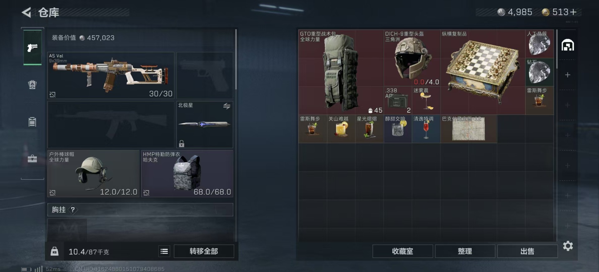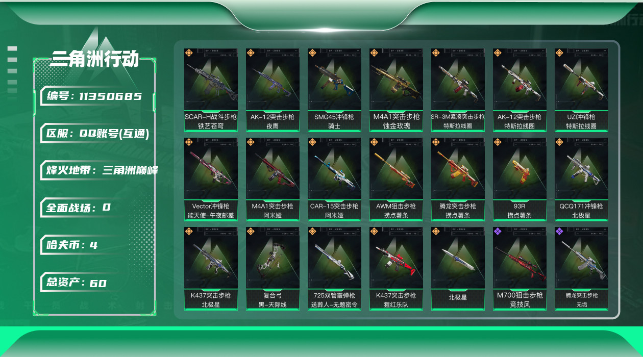 [11350685]总资产:60.1M 2干员外观 1近战传说 19传说枪械 哈夫币:4.985K 顶级安全箱(3×3)9.15号到期 可二次 可修改实名 优质装备:近战-北极星,顶级安全箱(3x3) 烽火地带段位:三角洲巅峰 全面战场段位:军士长 传说武器皮肤:SCAR-H战斗步枪-铁艺苍穹,AK-12突击步枪-夜鹰,SMG45冲锋枪-骑士,M4A1突击步枪-阿米娅,CAR-15突击步枪-阿米娅,复合弓-黑-天际线,AWM狙击步枪-捞点薯条,QCQ171冲锋枪-北极星,腾龙突击步枪-捞点薯条,93R-捞点薯条,AK-12突击步枪-特斯拉线圈,SR-3M紧凑突击步枪-特斯拉线圈,UZI冲锋枪-特斯拉线圈,725双管霰弹枪-送葬人-无题密令,K437突击步枪-北极星,K437突击步枪-猩红乐队,M4A1突击步枪-蚀金玫瑰,Vector冲锋枪-能天使-午夜邮差 史诗武器皮肤:SVD狙击步枪-荒野求生,SCAR-H战斗步枪-囚徒,腾龙突击步枪-无垢,MP7冲锋枪-无垢,M700狙击步枪-竞技风 干员外观:红狼-蚀金玫瑰,露娜-黑·天际线