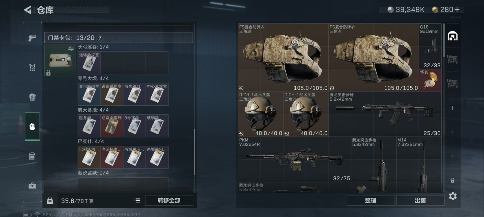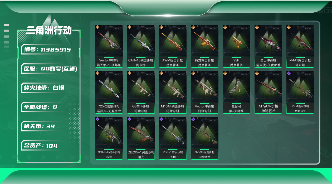 [11385915]总资产:104.3M 13传说枪械 哈夫币:39.348K 高级安全箱(2×3)9.15号到期 可二次 可修改实名 烽火地带段位:白银 全面战场段位:军士长 传说武器皮肤:93R-捞点薯条,Vector冲锋枪-狩猎时刻,G3战斗步枪-狩猎时刻,M16A4突击步枪-狩猎时刻,AWM狙击步枪-捞点薯条,腾龙突击步枪-捞点薯条,CAR-15突击步枪-阿米娅,勇士冲锋枪-能天使-午夜邮差,Vector冲锋枪-能天使-午夜邮差,复合弓-黑-天际线,M4A1突击步枪-阿米娅,725双管霰弹枪-送葬人-无题密令,M7战斗步枪-神秘艺术 史诗武器皮肤:PKM通用机枪-荒野求生,SV-98狙击步枪-林中猎手,SCAR-H战斗步枪-囚徒,PSG-1射手步枪-无垢,QBZ95-1突击步枪-曙光