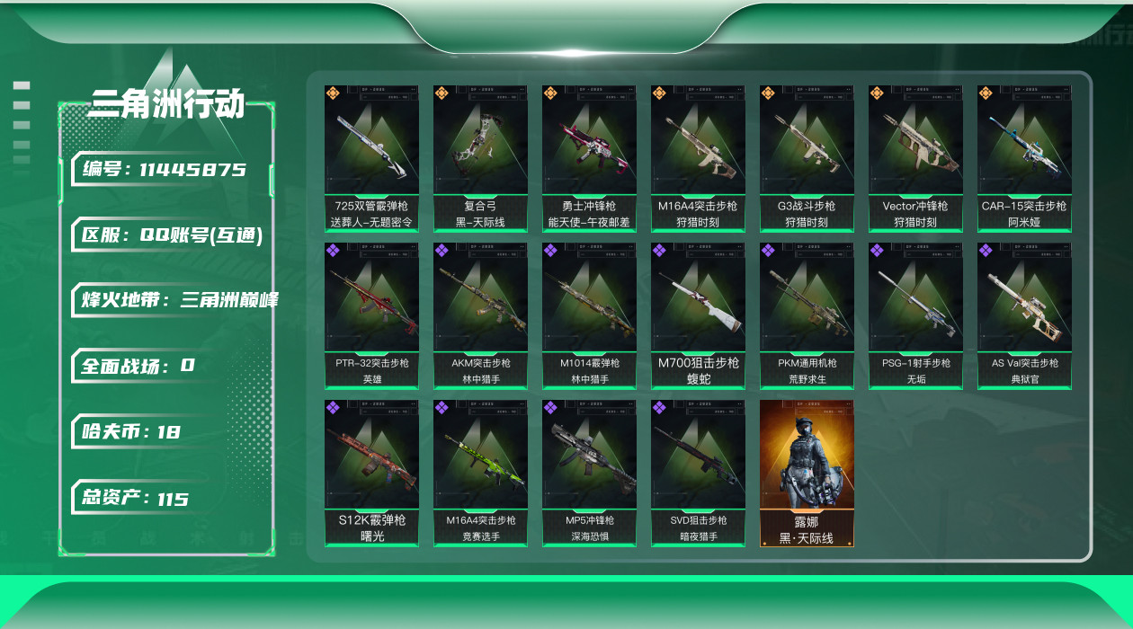 [11445875]总资产:115.5M 1干员外观 7传说枪械 哈夫币:18.089K 高级安全箱(9.17到期) 可二次 可修改实名 烽火地带段位:三角洲巅峰 全面战场段位:军士长 传说武器皮肤:M16A4突击步枪-狩猎时刻,CAR-15突击步枪-阿米娅,复合弓-黑-天际线,Vector冲锋枪-狩猎时刻,G3战斗步枪-狩猎时刻,勇士冲锋枪-能天使-午夜邮差,725双管霰弹枪-送葬人-无题密令 史诗武器皮肤:M700狙击步枪-蝮蛇,SVD狙击步枪-暗夜猎手,M16A4突击步枪-竞赛选手,PKM通用机枪-荒野求生,MP5冲锋枪-深海恐惧,AKM突击步枪-林中猎手,M1014霰弹枪-林中猎手,PTR-32突击步枪-英雄,AS Val突击步枪-典狱官,PSG-1射手步枪-无垢,S12K霰弹枪-曙光 干员外观:露娜-黑·天际线