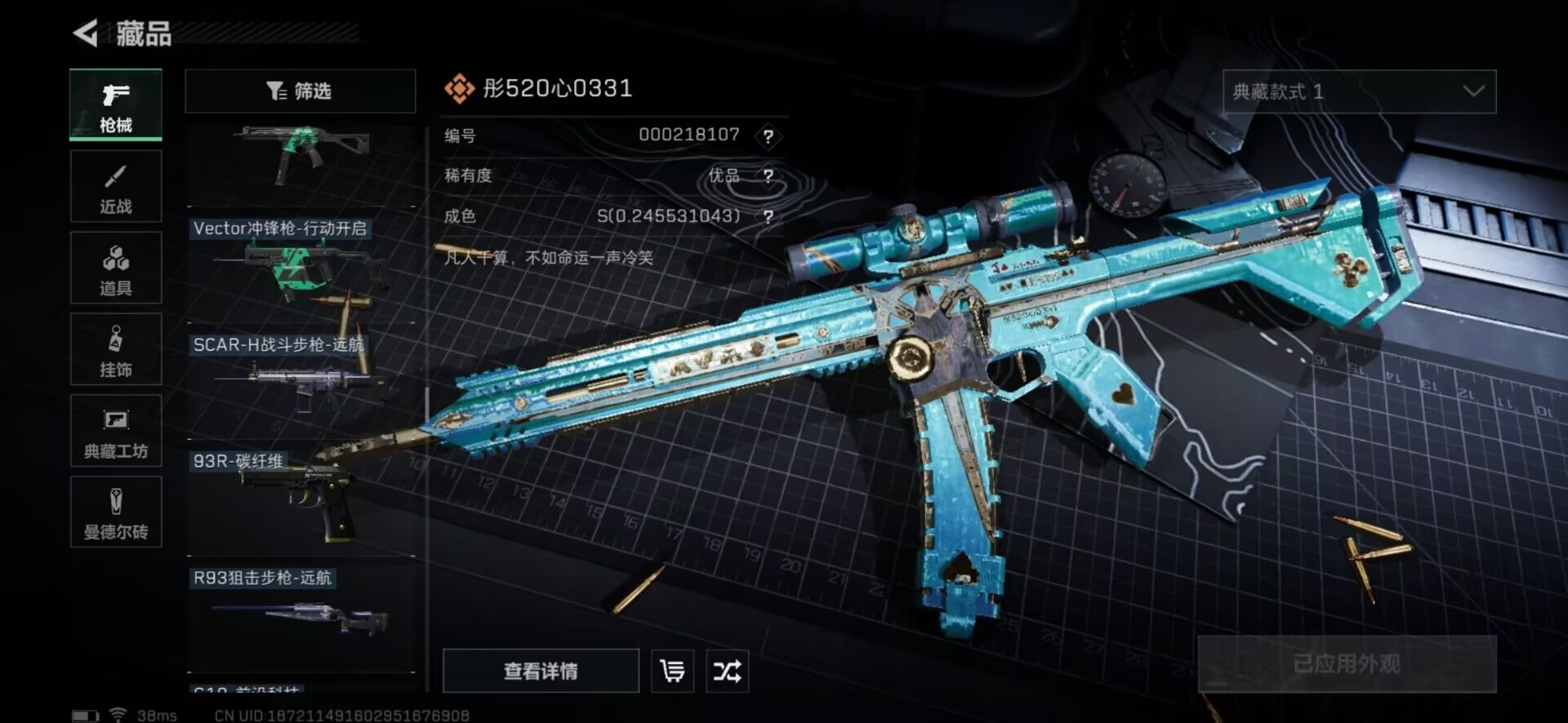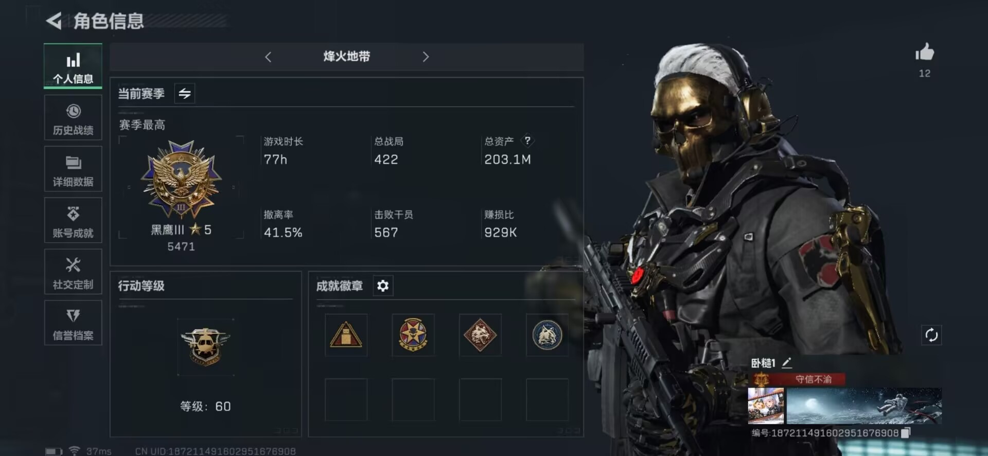 [11446225]总资产:203.1 5干员外观 2近战传说 18传说枪械 高级安全箱(2×3)9.15号到期 可二次 可修改实名 优质装备:近战-黑海,近战-北极星,K416突击步枪-命运(典藏),M4A1突击步枪-棱镜攻势(典藏),SCAR-H战斗步枪-电玩高手 烽火地带段位:黑鹰 全面战场段位:列兵 哈夫币:92.305 传说武器皮肤:SCAR-H战斗步枪-水墨云图,AK-12突击步枪-夜鹰,G18-飞虎,SMG45冲锋枪-骑士,CAR-15突击步枪-阿米娅,复合弓-黑-天际线,QCQ171冲锋枪-北极星,勇士冲锋枪-能天使-午夜邮差,725双管霰弹枪-送葬人-无题密令,K437突击步枪-北极星,MP5冲锋枪-黑海,QJB201轻机枪-黑海,M4A1突击步枪-蚀金玫瑰 史诗武器皮肤:AUG突击步枪-蝮蛇,M700狙击步枪-蝮蛇,PKM通用机枪-荒野求生,AS Val突击步枪-尖端治疗,SR-3M紧凑突击步枪-荒野求生,AKM突击步枪-林中猎手,M16A4突击步枪-竞赛选手,PKM通用机枪-守夜人,SV-98狙击步枪-林中猎手,PSG-1射手步枪-无垢,AS Val突击步枪-典狱官,M250通用机枪-囚徒,SCAR-H战斗步枪-囚徒,Vector冲锋枪-阿萨拉文明,M700狙击步枪-竞技风 干员外观:红狼-蚀金玫瑰,骇爪-水墨云图,无名-夜鹰,威龙-飞虎,露娜-黑·天际线