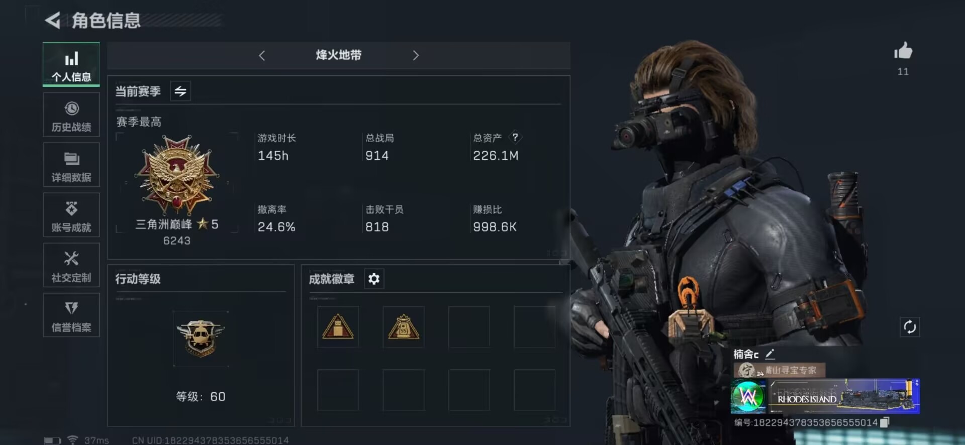 [11317584]总资产:226.1M 10传说枪械 哈夫币:41.432K 可二次 可修改实名 优质装备:顶级安全箱(3x3) 烽火地带段位:三角洲巅峰 全面战场段位:列兵 传说武器皮肤:M4A1突击步枪-阿米娅,CAR-15突击步枪-阿米娅,复合弓-黑-天际线,AWM狙击步枪-捞点薯条,腾龙突击步枪-捞点薯条,93R-捞点薯条,AK-12突击步枪-特斯拉线圈,SR-3M紧凑突击步枪-特斯拉线圈,UZI冲锋枪-特斯拉线圈,勇士冲锋枪-能天使-午夜邮差 史诗武器皮肤:M16A4突击步枪-竞赛选手,MP5冲锋枪-深海恐惧,SV-98狙击步枪-林中猎手,沙漠之鹰-曙光