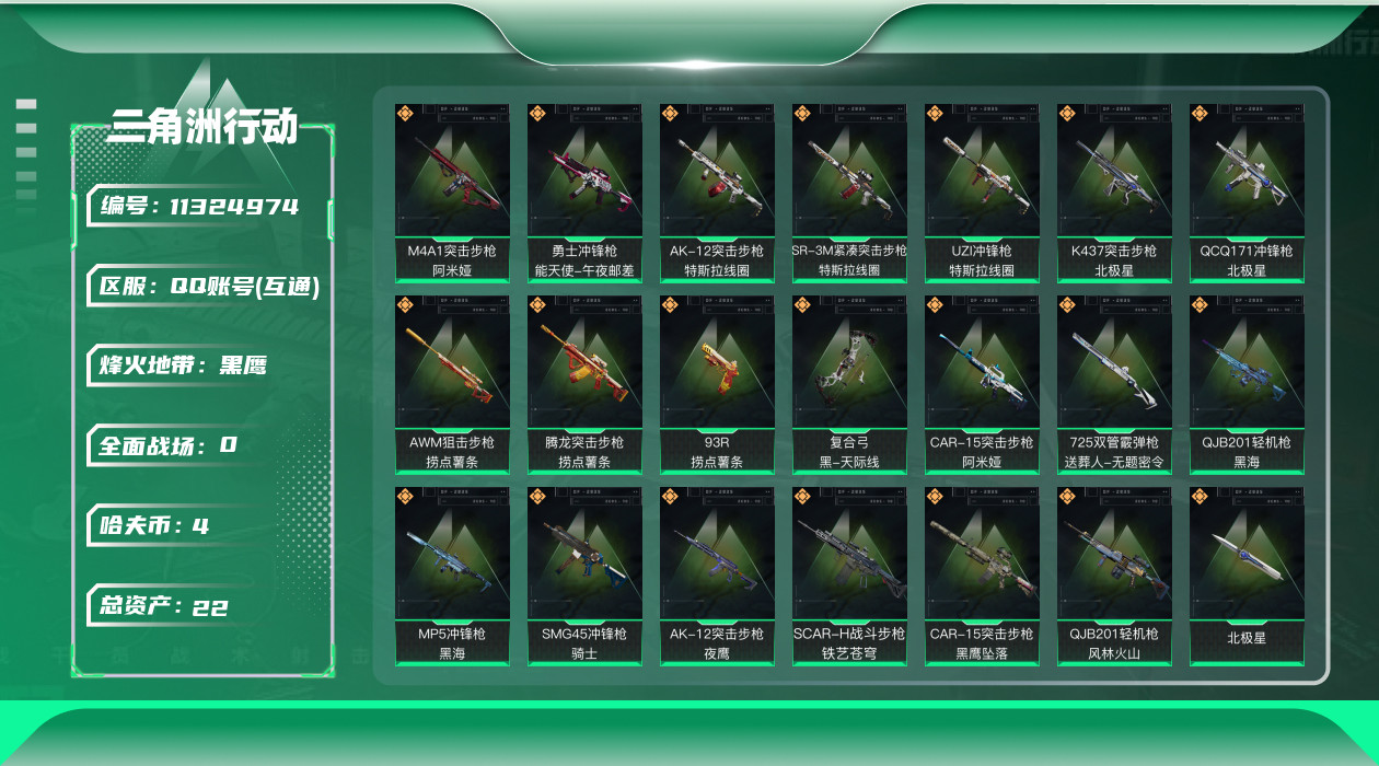 [11324974]总资产:22.1M 2近战传说 22传说枪械 哈夫币:4.521K 高级安全箱(2×3)9.15号到期 可二次 可修改实名 优质装备:近战-黑海,近战-北极星 烽火地带段位:黑鹰 全面战场段位:上等兵 传说武器皮肤:QJB201轻机枪-风林火山,SCAR-H战斗步枪-铁艺苍穹,AK-12突击步枪-夜鹰,SMG45冲锋枪-骑士,M4A1突击步枪-阿米娅,CAR-15突击步枪-阿米娅,复合弓-黑-天际线,AWM狙击步枪-捞点薯条,QCQ171冲锋枪-北极星,腾龙突击步枪-捞点薯条,93R-捞点薯条,AK-12突击步枪-特斯拉线圈,SR-3M紧凑突击步枪-特斯拉线圈,UZI冲锋枪-特斯拉线圈,勇士冲锋枪-能天使-午夜邮差,725双管霰弹枪-送葬人-无题密令,K437突击步枪-北极星,MP5冲锋枪-黑海,QJB201轻机枪-黑海,CAR-15突击步枪-黑鹰坠落 史诗武器皮肤:PKM通用机枪-荒野求生,SR-3M紧凑突击步枪-荒野求生,SVD狙击步枪-荒野求生,MP7冲锋枪-无垢,沙漠之鹰-曙光