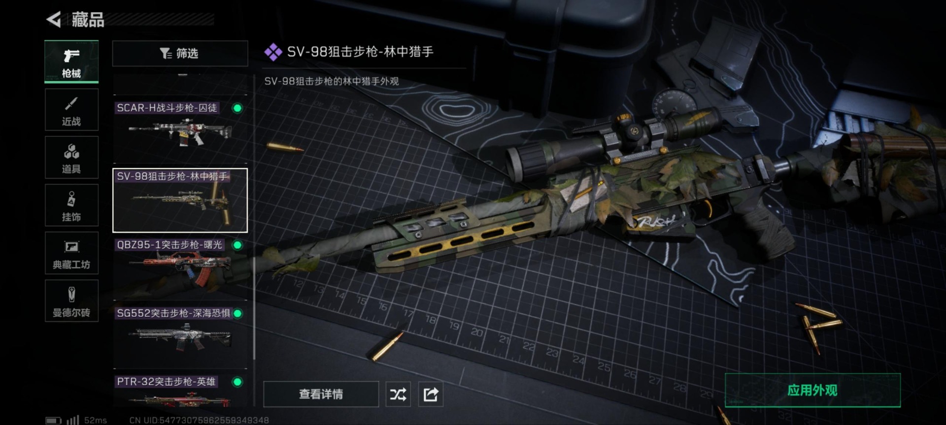 [11374804]总资产:221.8M 6传说枪械 哈夫币:144K 顶级安全箱(3×3)9.15号到期 可二次 可修改实名 优质装备:顶级安全箱(3x3) 烽火地带段位:黄金 全面战场段位:无段位 传说武器皮肤:M16A4突击步枪-狩猎时刻,M4A1突击步枪-阿米娅,CAR-15突击步枪-阿米娅,Vector冲锋枪-狩猎时刻,G3战斗步枪-狩猎时刻,勇士冲锋枪-能天使-午夜邮差 史诗武器皮肤:PKM通用机枪-蝮蛇,SG552突击步枪-深海恐惧,AKM突击步枪-林中猎手,M1014霰弹枪-林中猎手,SV-98狙击步枪-林中猎手,PTR-32突击步枪-英雄,M250通用机枪-囚徒,SV-98狙击步枪-囚徒,SCAR-H战斗步枪-囚徒,QBZ95-1突击步枪-曙光
