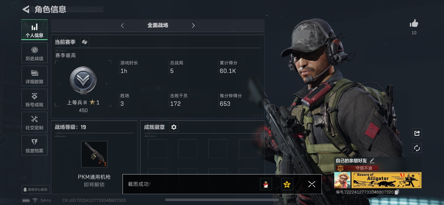 - [11235300]总资产:84.7 可二次 可修改实名 烽火地带段位:白银 全面战场段位:无段位 哈夫币:51.088 史诗武器皮肤:SV-98狙击步枪-林中猎手,SV-98狙击步枪-囚徒,SCAR-H战斗步枪-囚徒
