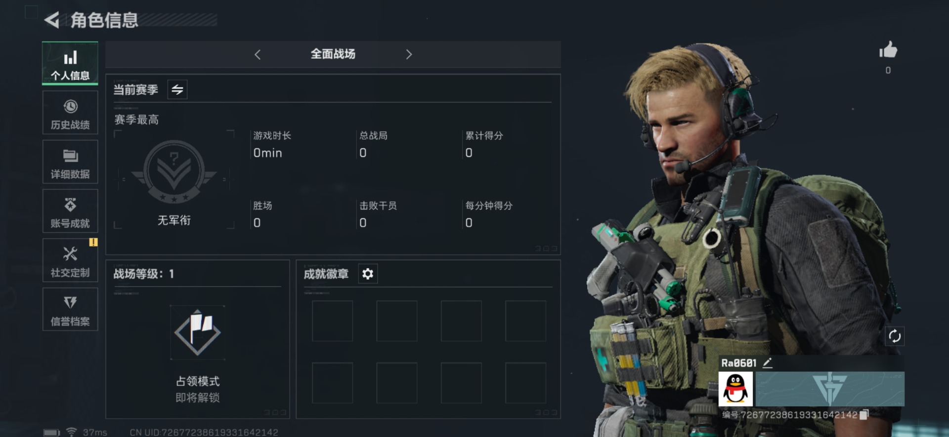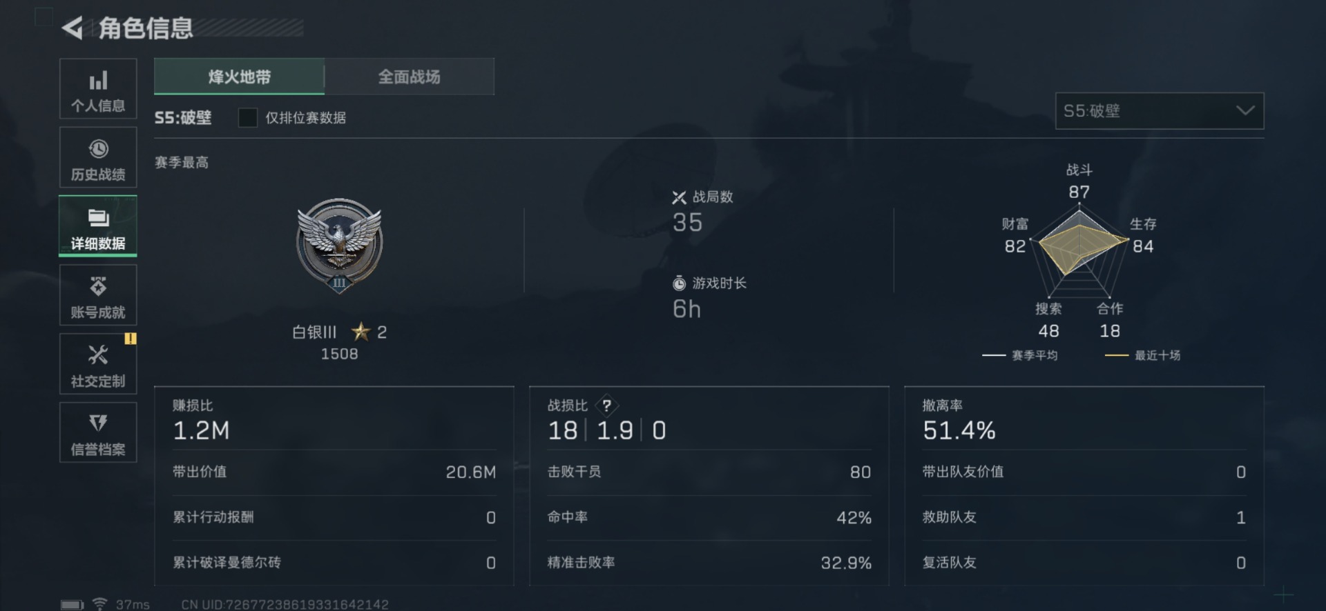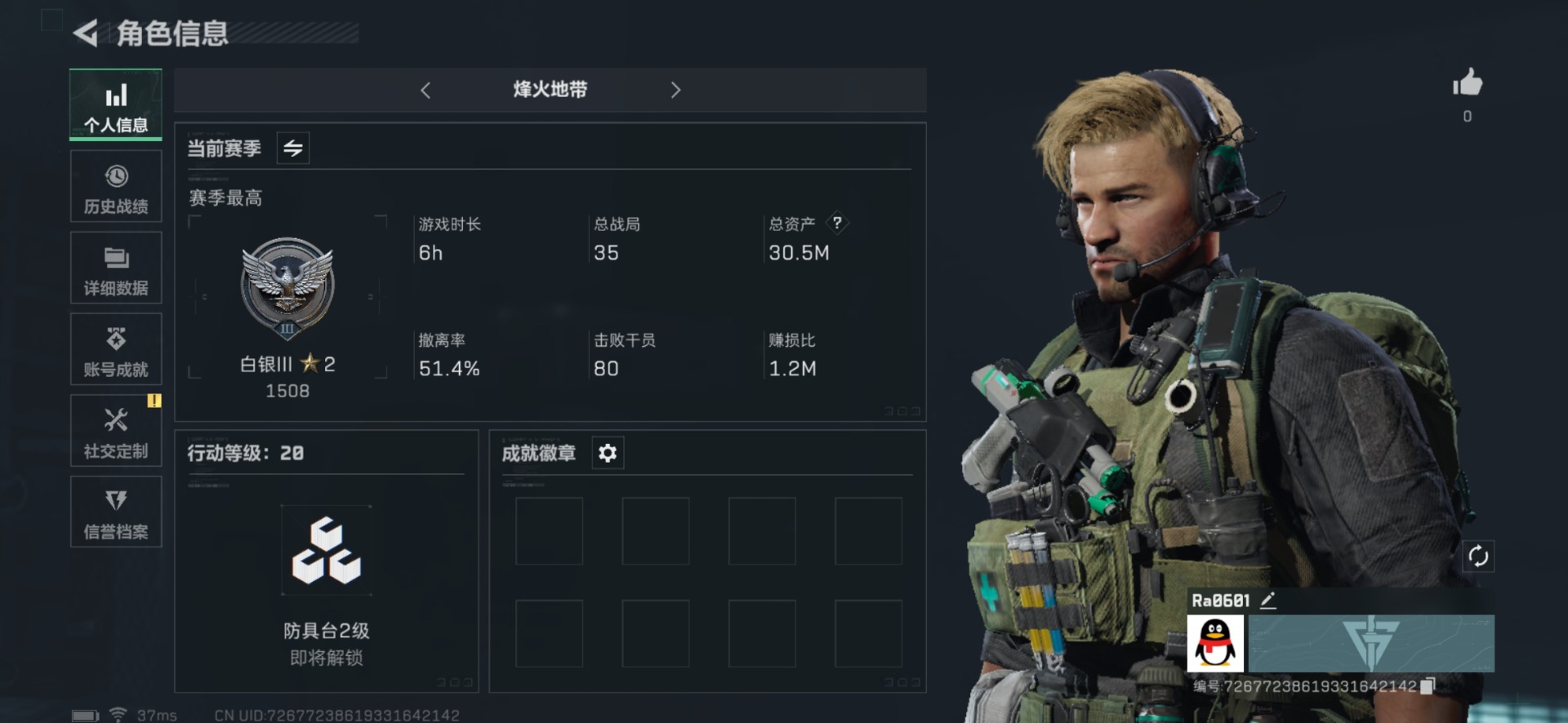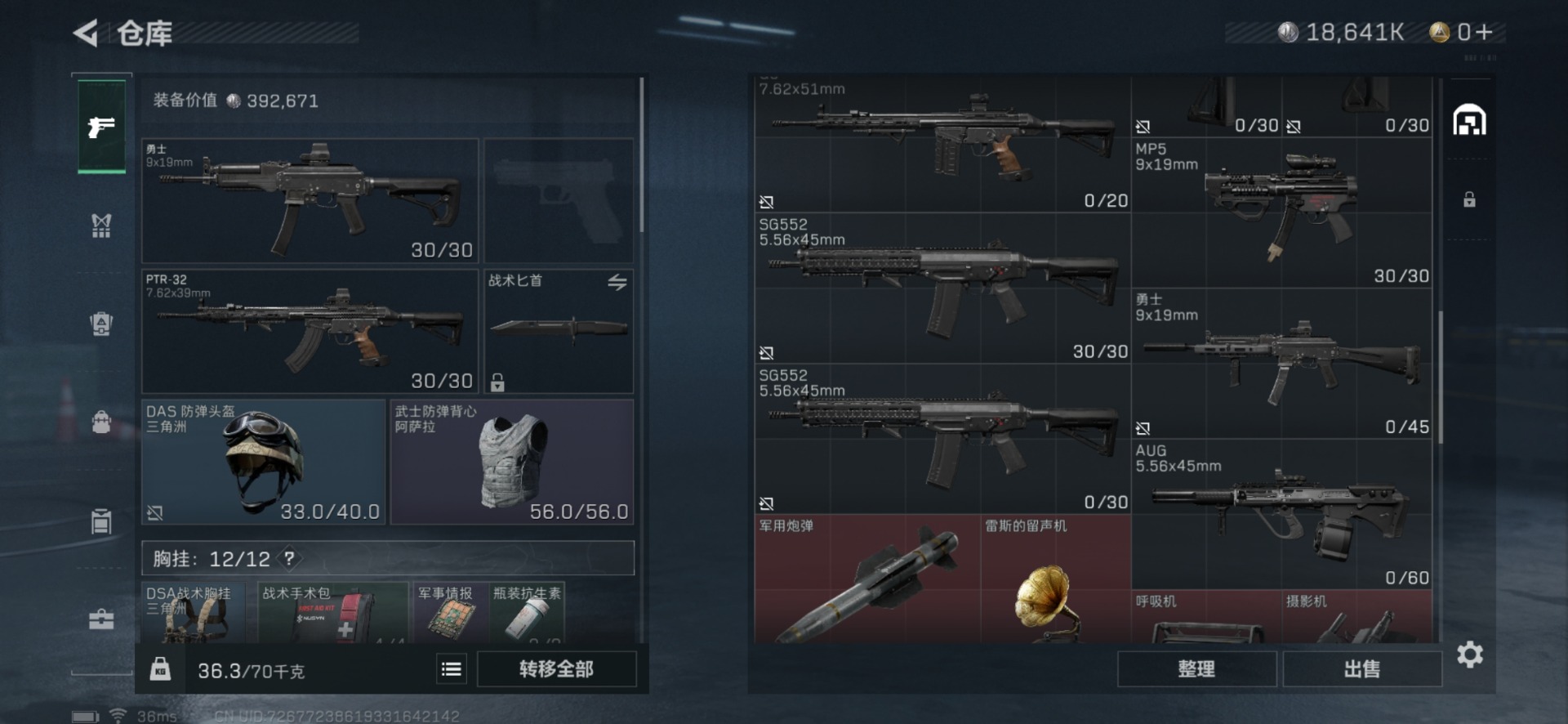 - [11684714]总资产:243.1 1干员外观 0近战传说 6传说枪械 顶级安全箱(3×3)9.15号到期 段位:无段位 可二次 可修改实名 烽火地带段位:钻石 全面战场段位:无段位 哈夫币:147 传说武器皮肤:SCAR-H战斗步枪-水墨云图,AK-12突击步枪-夜鹰,SMG45冲锋枪-骑士,复合弓-黑-天际线,CAR-15突击步枪-阿米娅,M4A1突击步枪-蚀金玫瑰 史诗武器皮肤:AUG突击步枪-蝮蛇,SR-25射手步枪-尖端治疗,AS Val突击步枪-尖端治疗,M700狙击步枪-守夜人,SG552突击步枪-尖端治疗,Ash-12战斗步枪-守夜人,MP5冲锋枪-深海恐惧,勇士冲锋枪-深海恐惧,SG552突击步枪-深海恐惧,AKM突击步枪-林中猎手,M16A4突击步枪-竞赛选手,PKM通用机枪-守夜人,M1014霰弹枪-林中猎手,SR-3M紧凑突击步枪-纷争,SV-98狙击步枪-林中猎手,PTR-32突击步枪-英雄,M250通用机枪-囚徒,SVD狙击步枪-阿萨拉工艺 干员外观:骇爪-水墨云图