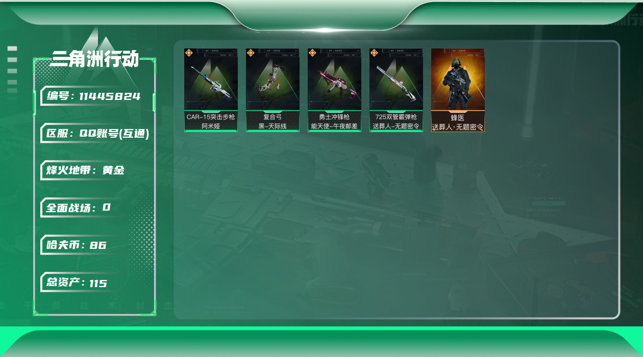 [11445824]总资产:115.7M 1干员外观 4传说枪械 哈夫币:86.399K 高级安全箱(2×3)9.15号到期 可二次 可修改实名 烽火地带段位:黄金 全面战场段位:无段位 传说武器皮肤:CAR-15突击步枪-阿米娅,复合弓-黑-天际线,勇士冲锋枪-能天使-午夜邮差,725双管霰弹枪-送葬人-无题密令 干员外观:蜂医-送葬人·无题密令(S5)