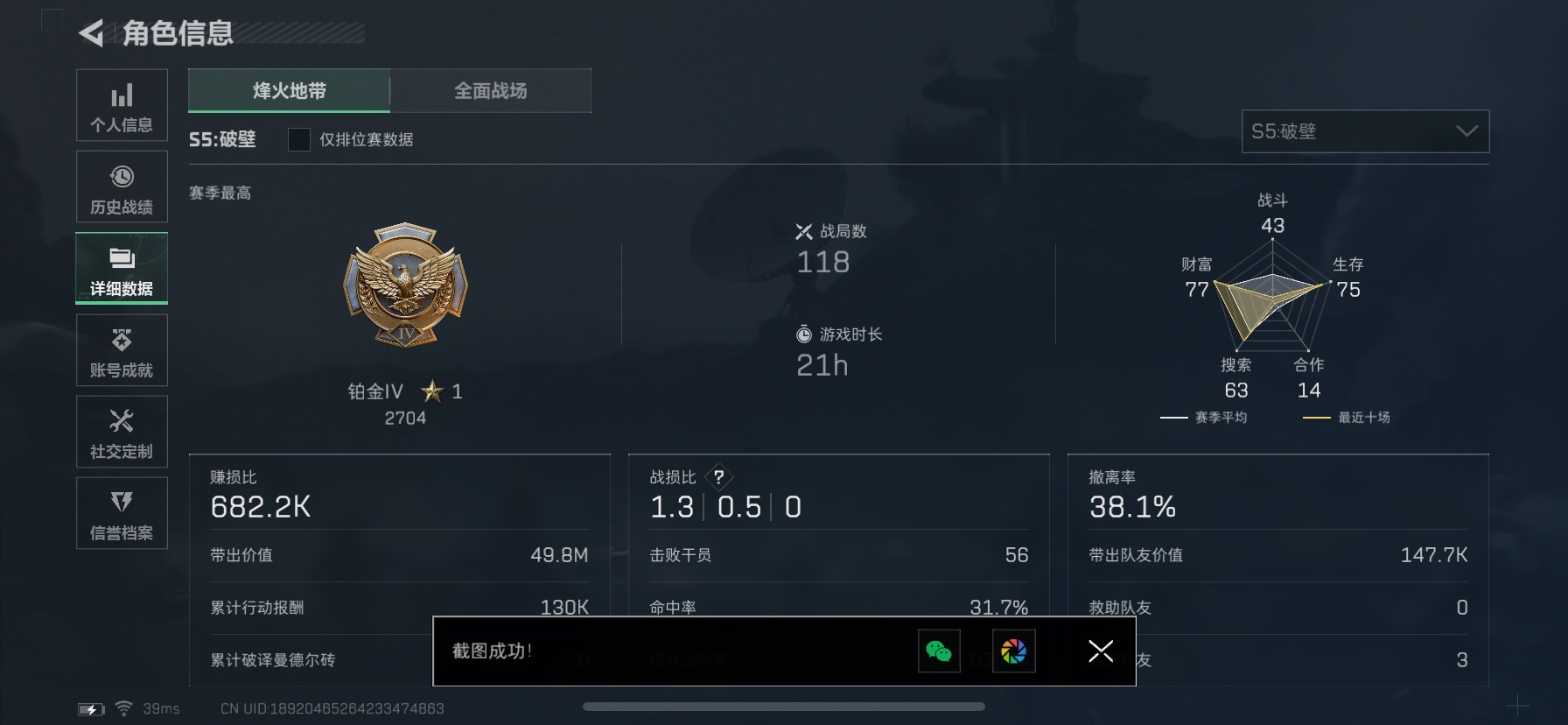 [11307680]总资产:63M 5传说枪械 哈夫币:12.074K 可二次 可修改实名 安全保护中 烽火地带段位:铂金 全面战场段位:无段位 传说武器皮肤:M4A1突击步枪-阿米娅,AK-12突击步枪-特斯拉线圈,SR-3M紧凑突击步枪-特斯拉线圈,UZI冲锋枪-特斯拉线圈,勇士冲锋枪-能天使-午夜邮差 史诗武器皮肤:SV-98狙击步枪-林中猎手,SCAR-H战斗步枪-囚徒