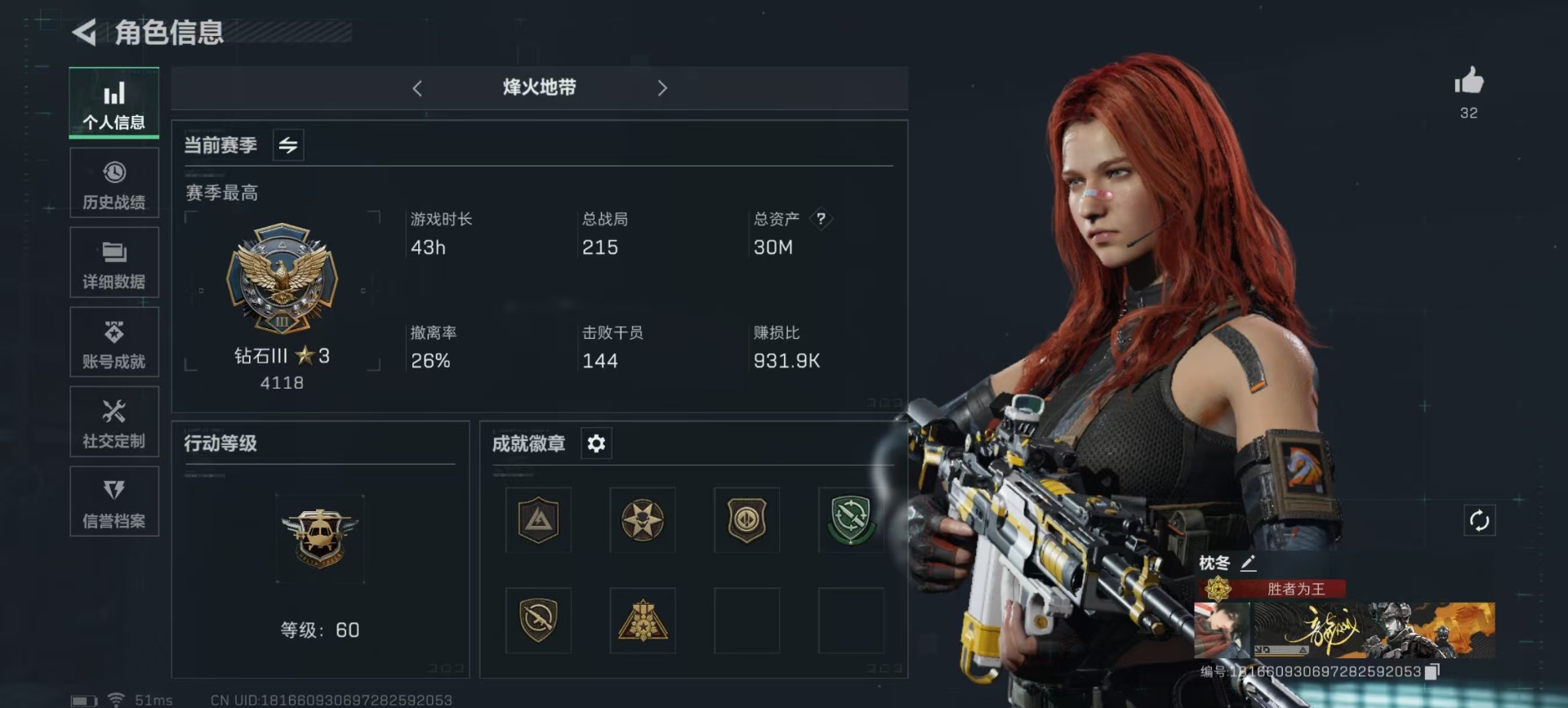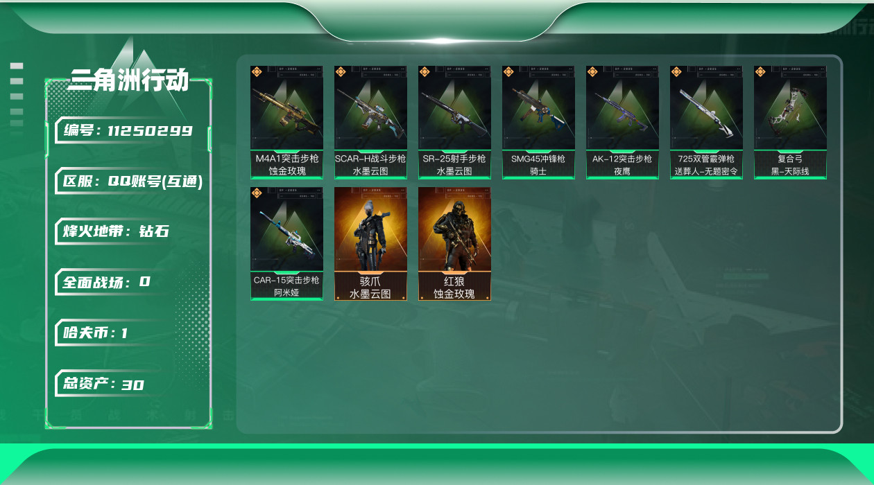 [11250299]可二次 可修改实名 实名:可修改 高级安全箱(2×3)9.15号到期 烽火地带段位:钻石 全面战场段位:尉官 总资产:30 哈夫币:1.769 传说武器皮肤:SCAR-H战斗步枪-水墨云图,SR-25射手步枪-水墨云图,AK-12突击步枪-夜鹰,SMG45冲锋枪-骑士,复合弓-黑-天际线,CAR-15突击步枪-阿米娅,725双管霰弹枪-送葬人-无题密令,M4A1突击步枪-蚀金玫瑰 干员外观:红狼-蚀金玫瑰,骇爪-水墨云图