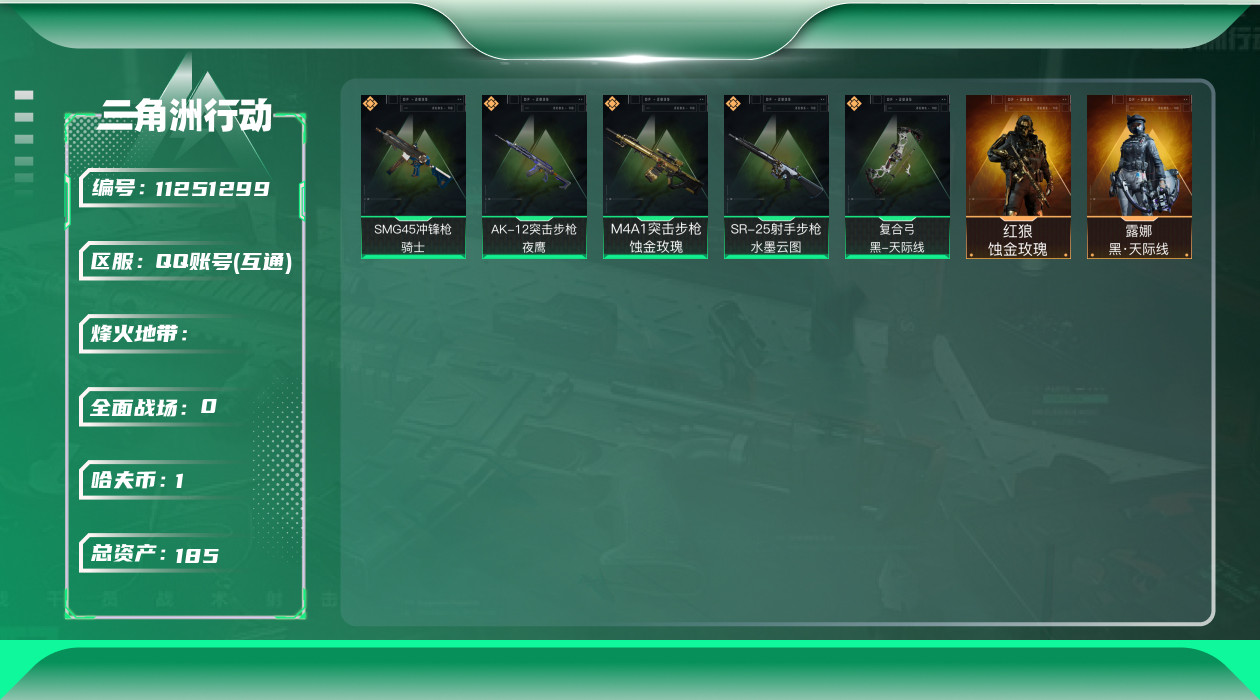 [11251299]可二次 可修改实名 实名:可修改 总资产:185.7 哈夫币:1.407 传说武器皮肤:SR-25射手步枪-水墨云图,AK-12突击步枪-夜鹰,SMG45冲锋枪-骑士,复合弓-黑-天际线,M4A1突击步枪-蚀金玫瑰 干员外观:红狼-蚀金玫瑰,露娜-黑·天际线