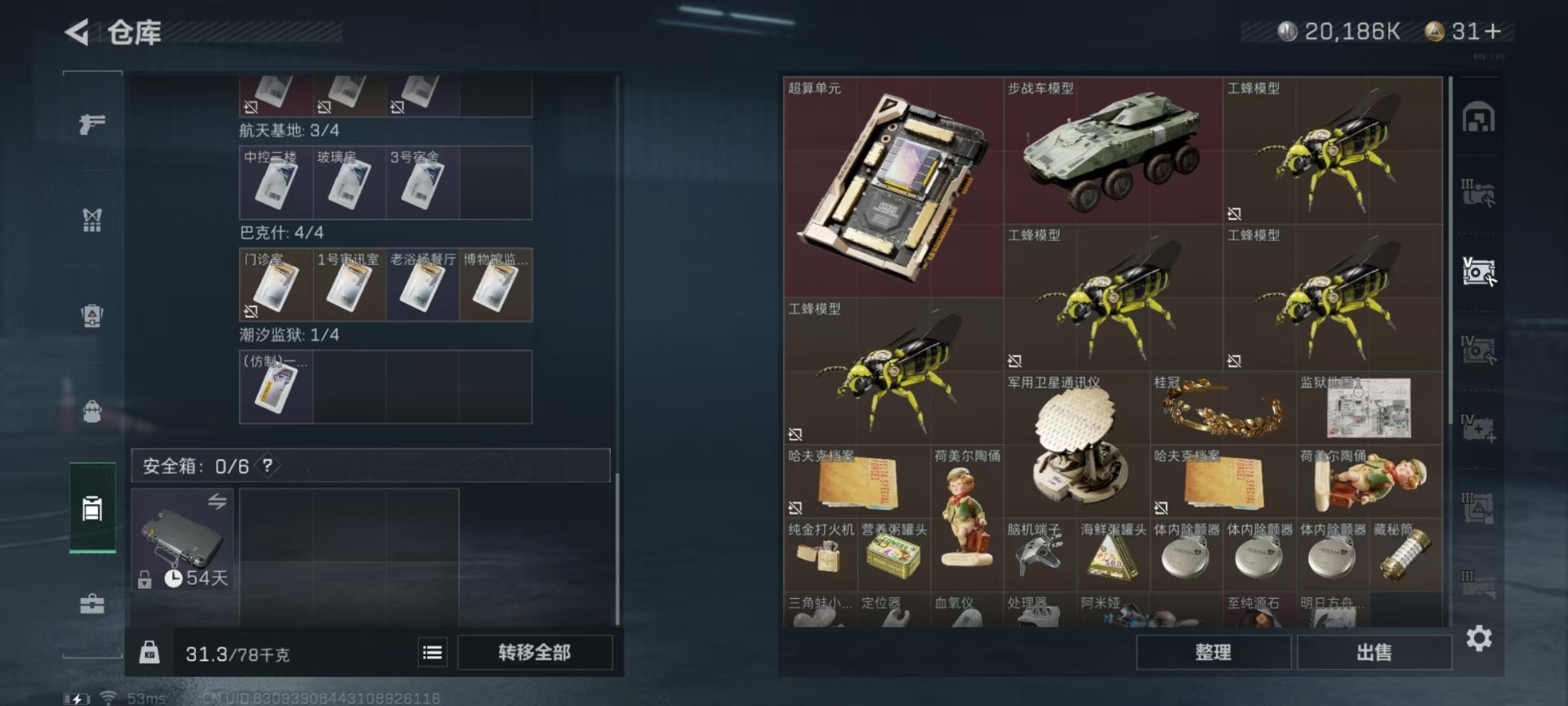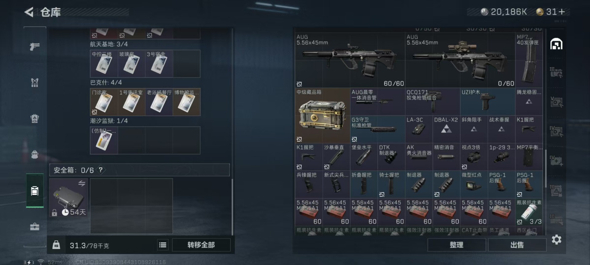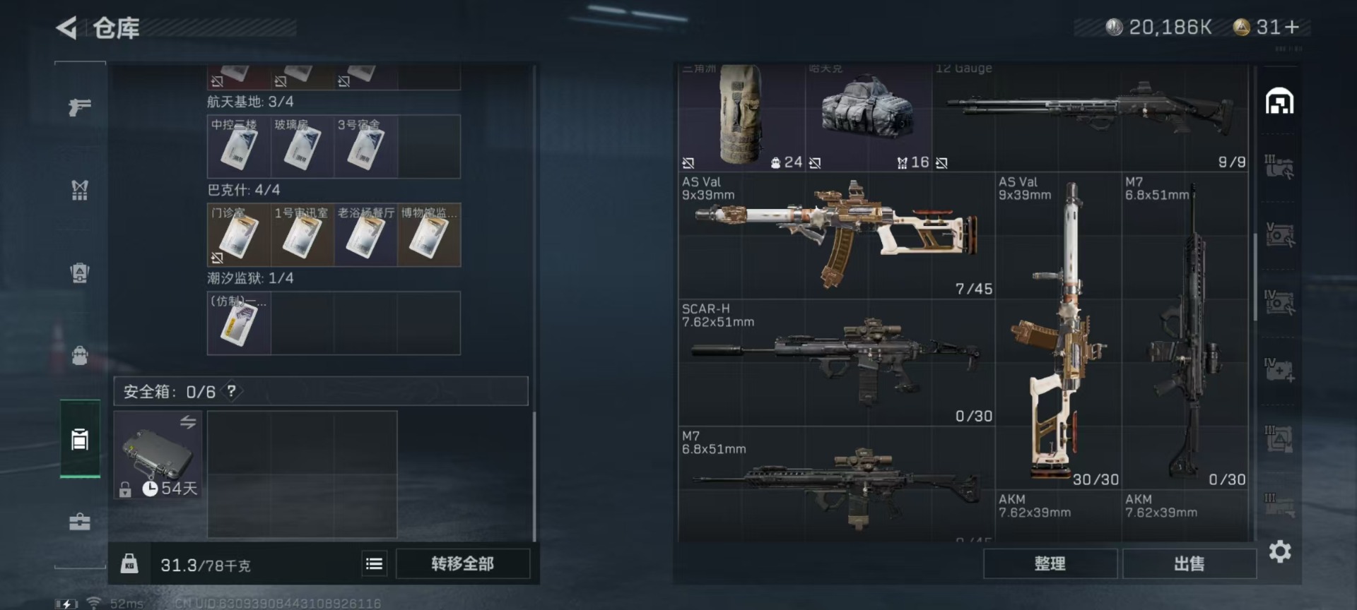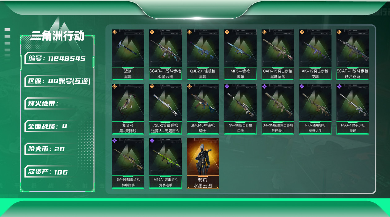 [11248545]可二次 可修改实名 实名:可修改 高级安全箱(2×3)9.15号到期 总资产:106.7 哈夫币:20.186 传说武器皮肤:近战-黑海,SCAR-H战斗步枪-水墨云图,SCAR-H战斗步枪-铁艺苍穹,AK-12突击步枪-夜鹰,SMG45冲锋枪-骑士,QJB201轻机枪-黑海,MP5冲锋枪-黑海,复合弓-黑-天际线,725双管霰弹枪-送葬人-无题密令,CAR-15突击步枪-黑鹰坠落 史诗武器皮肤:PKM通用机枪-荒野求生,SR-3M紧凑突击步枪-荒野求生,M16A4突击步枪-竞赛选手,SV-98狙击步枪-林中猎手,PSG-1射手步枪-无垢,SV-98狙击步枪-囚徒 干员外观:骇爪-水墨云图