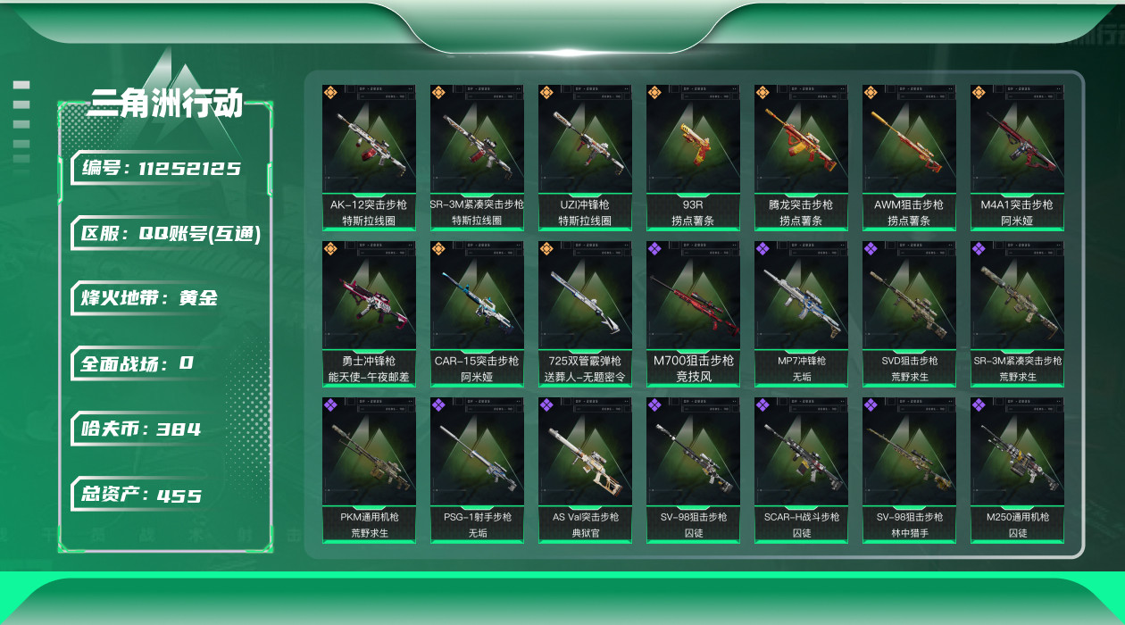 [11252125]总资产:455.4M 10传说枪械 哈夫币:384K 可二次 可修改实名 优质装备:非洲之心 烽火地带段位:黄金 全面战场段位:上等兵 传说武器皮肤:M4A1突击步枪-阿米娅,CAR-15突击步枪-阿米娅,AWM狙击步枪-捞点薯条,腾龙突击步枪-捞点薯条,93R-捞点薯条,AK-12突击步枪-特斯拉线圈,SR-3M紧凑突击步枪-特斯拉线圈,UZI冲锋枪-特斯拉线圈,勇士冲锋枪-能天使-午夜邮差,725双管霰弹枪-送葬人-无题密令 史诗武器皮肤:PKM通用机枪-荒野求生,SR-3M紧凑突击步枪-荒野求生,SV-98狙击步枪-林中猎手,SVD狙击步枪-荒野求生,AS Val突击步枪-典狱官,M250通用机枪-囚徒,SV-98狙击步枪-囚徒,SCAR-H战斗步枪-囚徒,腾龙突击步枪-无垢,MP7冲锋枪-无垢,PSG-1射手步枪-无垢,M700狙击步枪-竞技风