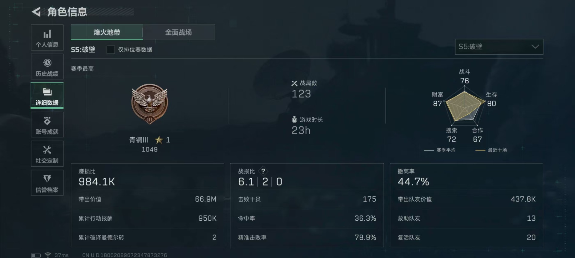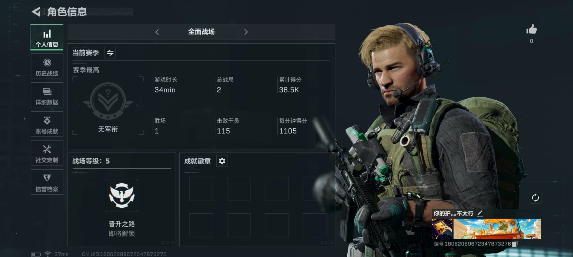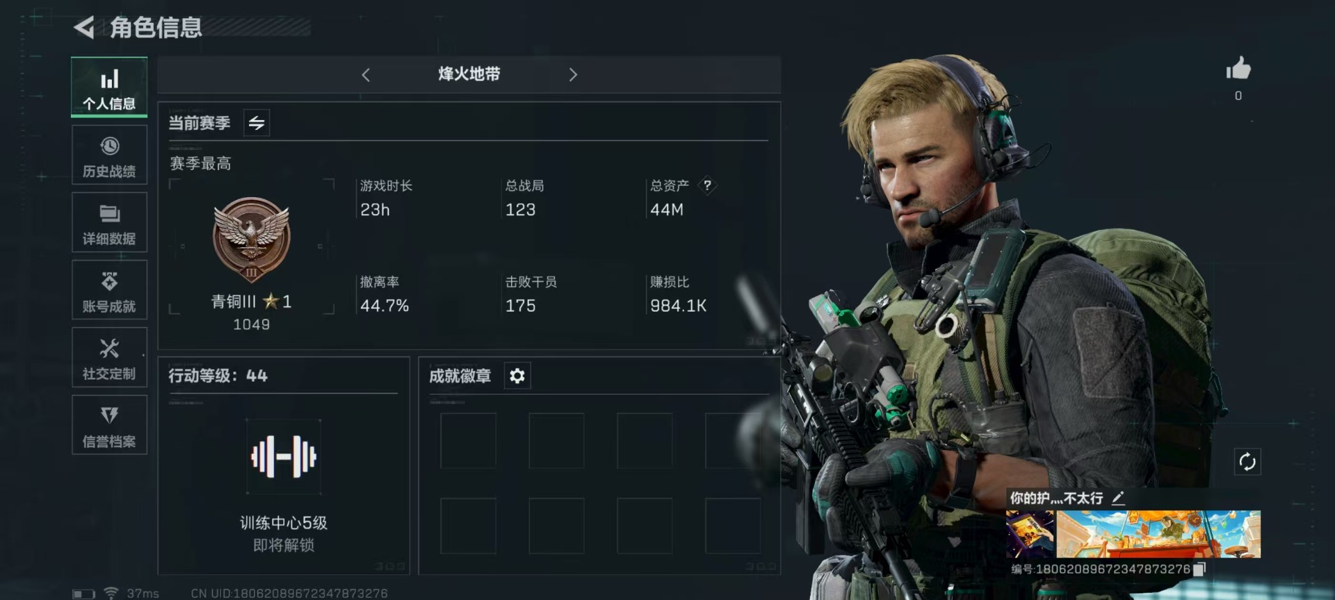 [11253643]总资产:44M 2传说枪械 哈夫币:20.874K 进阶安全箱(2×2)9.15号到期 可二次 可修改实名 烽火地带段位:青铜 全面战场段位:无段位 传说武器皮肤:复合弓-黑-天际线,勇士冲锋枪-能天使-午夜邮差 史诗武器皮肤:SV-98狙击步枪-林中猎手,SV-98狙击步枪-囚徒