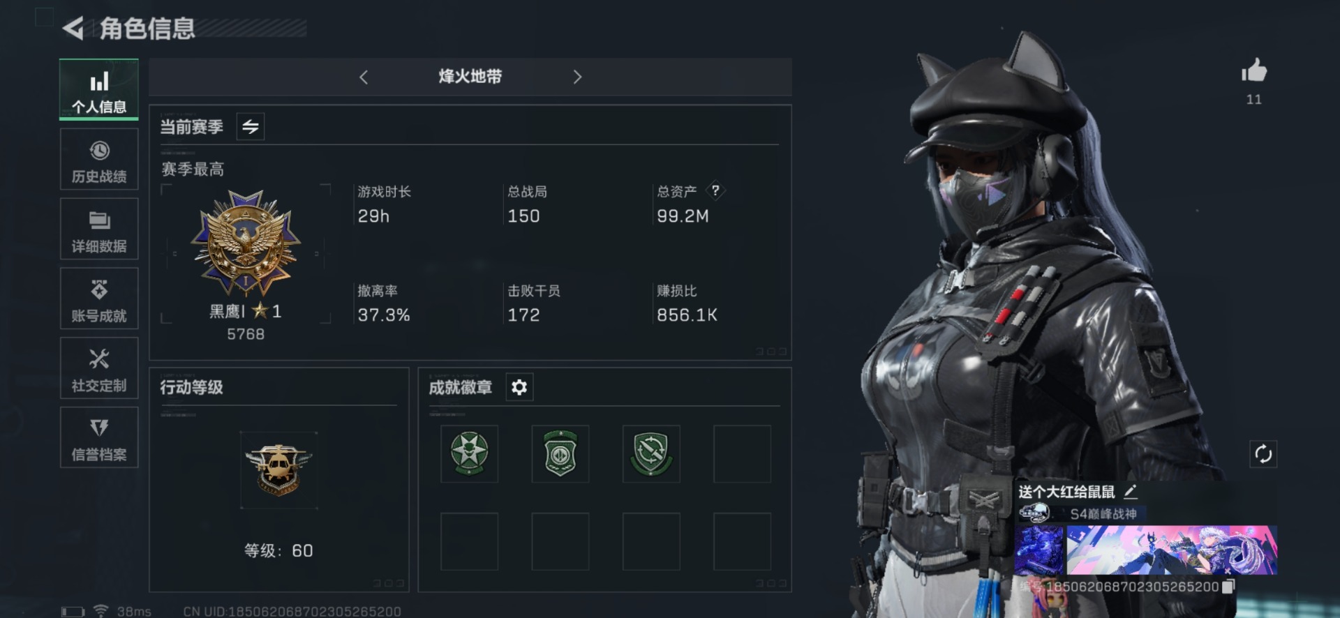 [11274919]总资产:99.2 1干员外观 5传说枪械 高级安全箱(2×3)9.15号到期 可二次 可修改实名 烽火地带段位:黑鹰 全面战场段位:无段位 哈夫币:25.895 传说武器皮肤:AK-12突击步枪-夜鹰,SMG45冲锋枪-骑士,复合弓-黑-天际线,CAR-15突击步枪-阿米娅,725双管霰弹枪-送葬人-无题密令 干员外观:露娜-黑·天际线