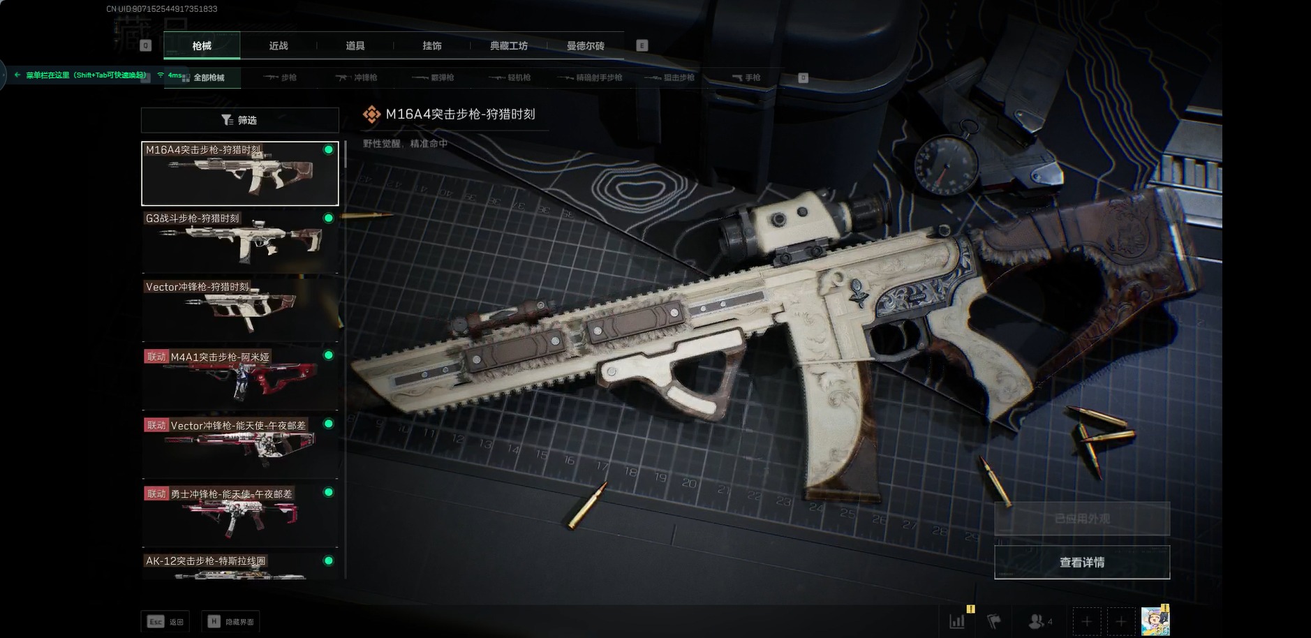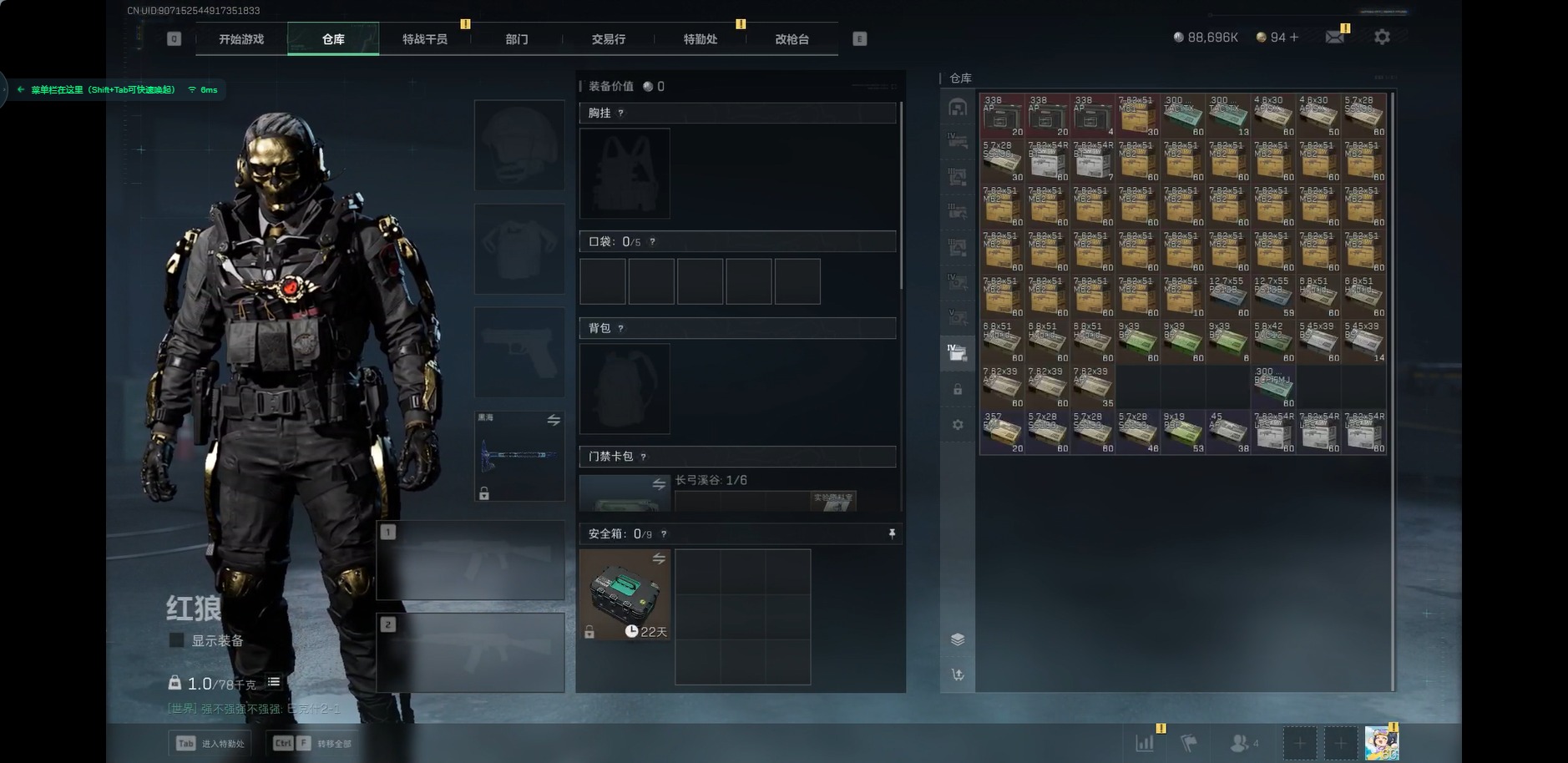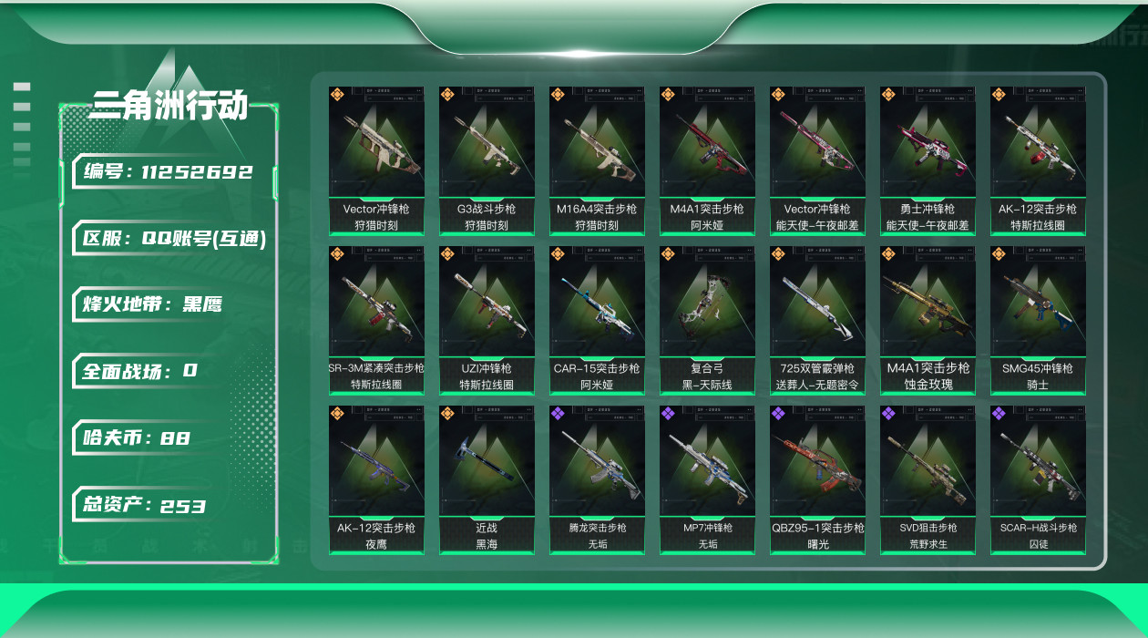 [11252692]总资产:253.6M 1干员外观 1近战传说 16传说枪械 哈夫币:88.696K 可二次 可修改实名 靓号2025年12月11日到期 优质装备:近战-黑海,顶级安全箱(3x3) 烽火地带段位:黑鹰 全面战场段位:军士长 传说武器皮肤:AK-12突击步枪-夜鹰,SMG45冲锋枪-骑士,M16A4突击步枪-狩猎时刻,M4A1突击步枪-阿米娅,CAR-15突击步枪-阿米娅,复合弓-黑-天际线,Vector冲锋枪-狩猎时刻,G3战斗步枪-狩猎时刻,AK-12突击步枪-特斯拉线圈,SR-3M紧凑突击步枪-特斯拉线圈,UZI冲锋枪-特斯拉线圈,勇士冲锋枪-能天使-午夜邮差,725双管霰弹枪-送葬人-无题密令,M4A1突击步枪-蚀金玫瑰,Vector冲锋枪-能天使-午夜邮差 史诗武器皮肤:Ash-12战斗步枪-守夜人,M16A4突击步枪-竞赛选手,PKM通用机枪-守夜人,AS Val突击步枪-尖端治疗,M700狙击步枪-守夜人,SG552突击步枪-尖端治疗,SR-25射手步枪-尖端治疗,PKM通用机枪-荒野求生,SG552突击步枪-深海恐惧,AKM突击步枪-林中猎手,M1014霰弹枪-林中猎手,SV-98狙击步枪-林中猎手,PTR-32突击步枪-英雄,SVD狙击步枪-荒野求生,M250通用机枪-囚徒,SCAR-H战斗步枪-囚徒,腾龙突击步枪-无垢,MP7冲锋枪-无垢,PSG-1射手步枪-无垢,QBZ95-1突击步枪-曙光,SVD狙击步枪-阿萨拉工艺,S12K霰弹枪-曙光 干员外观:红狼-蚀金玫瑰