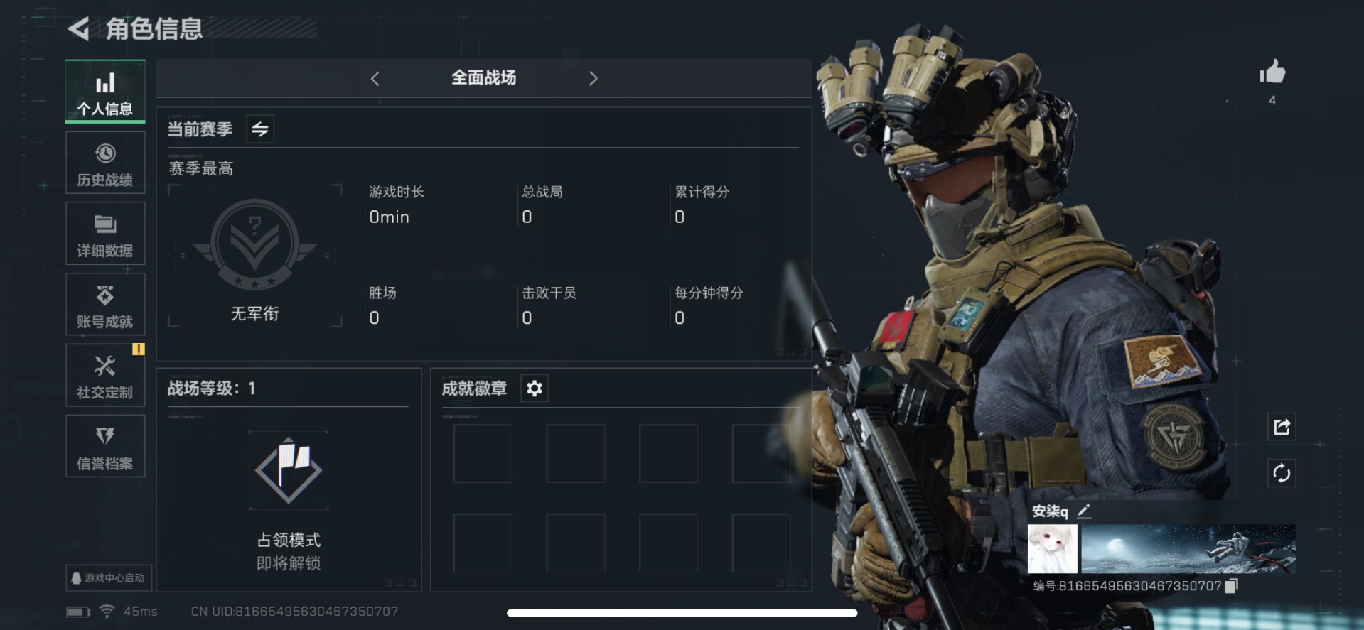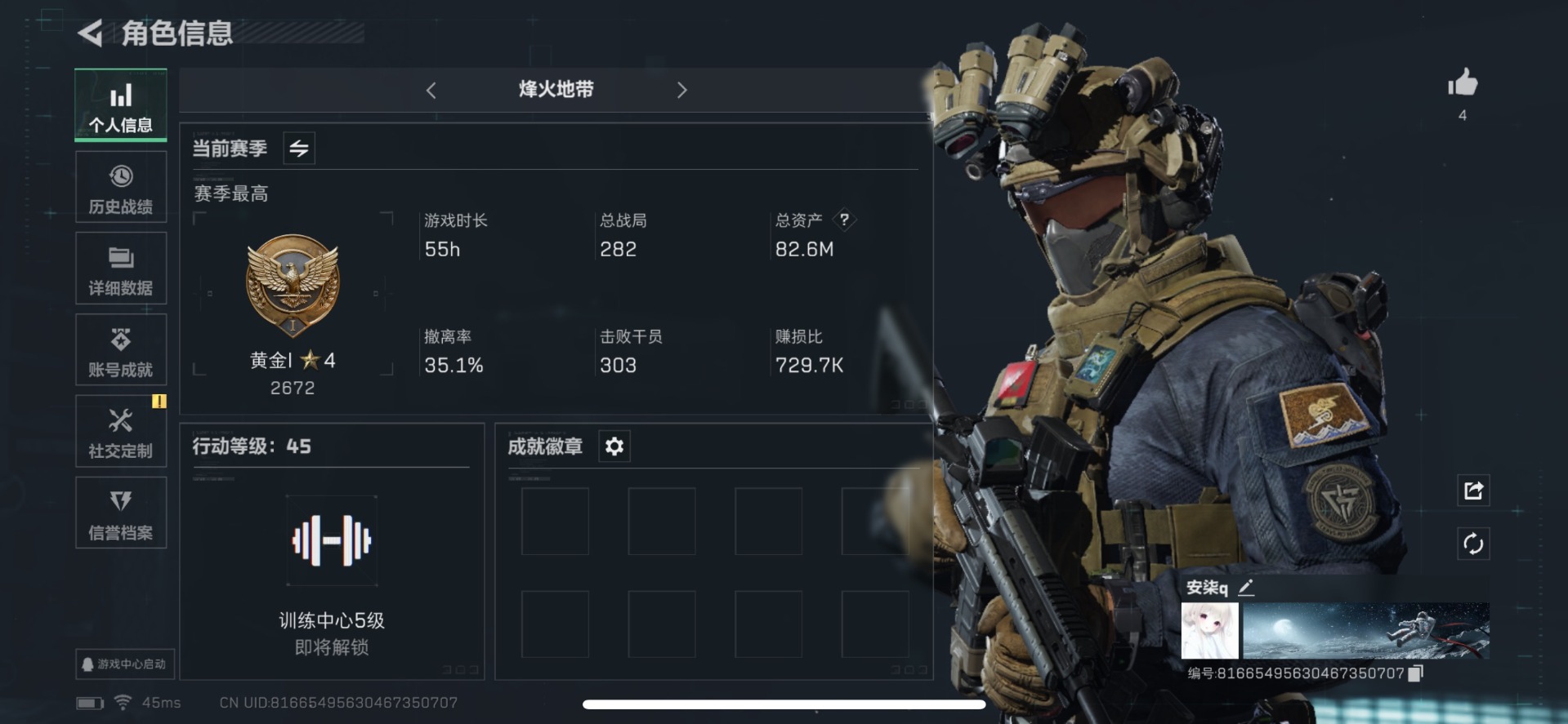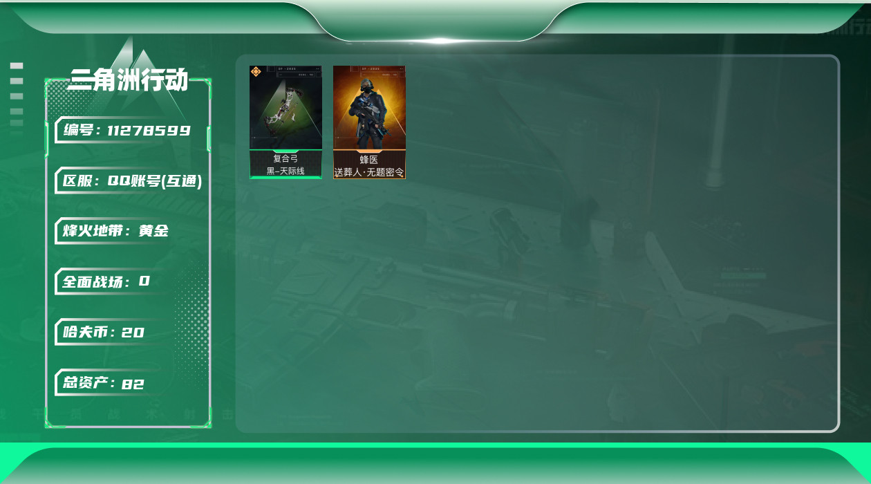 [11278599]总资产:82.6 1干员外观 1传说枪械 高级安全箱(2×3)9.15号到期 可二次 可修改实名 烽火地带段位:黄金 全面战场段位:无段位 哈夫币:20.747 传说武器皮肤:复合弓-黑-天际线 干员外观:蜂医-送葬人·无题密令(S5)