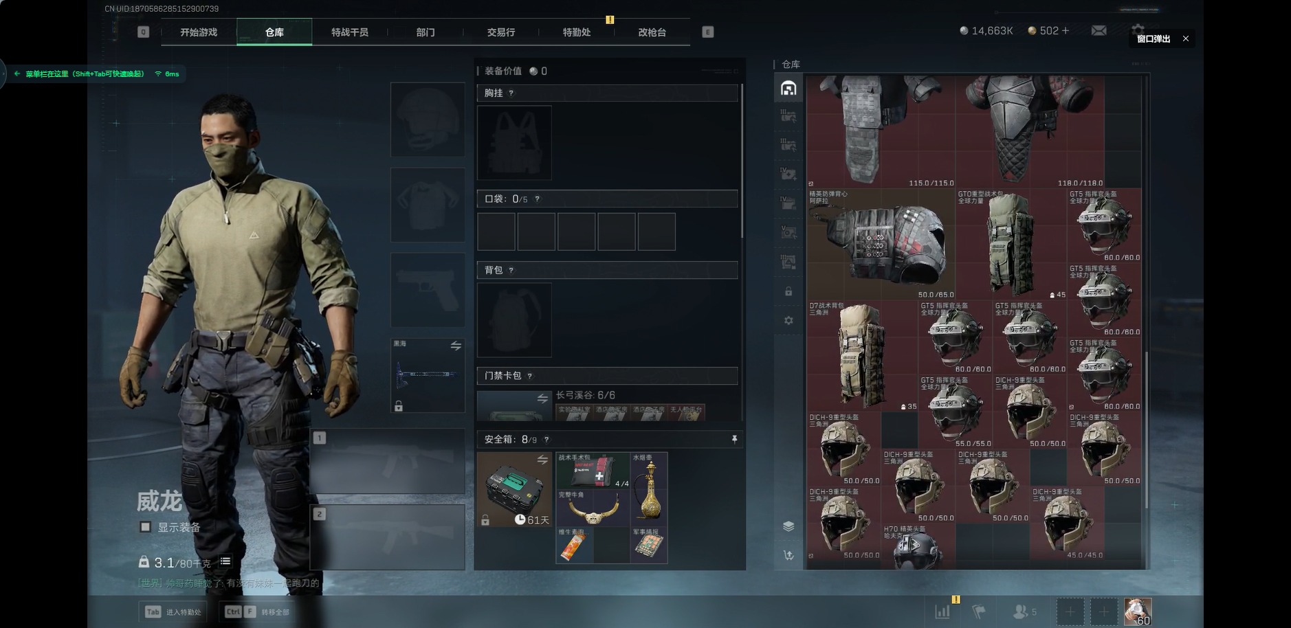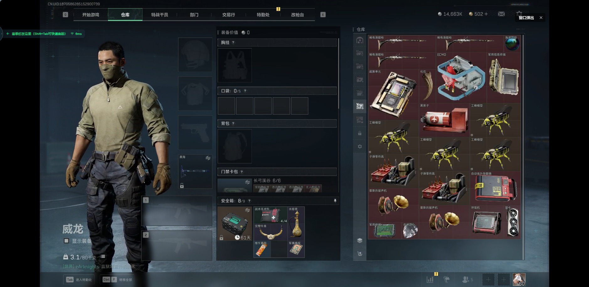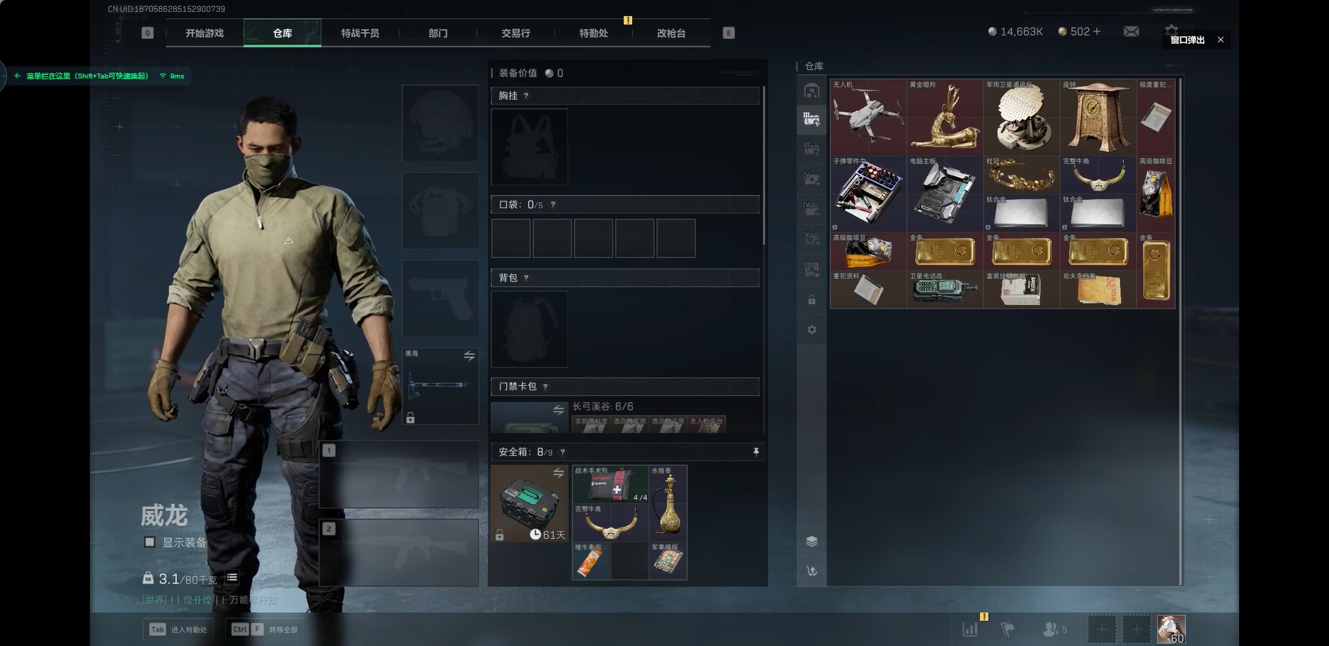 [11252955]可二次 可修改实名 实名:可修改 顶级安全箱(3×3)9.1号到期 总资产:153.6 哈夫币:14.663 传说武器皮肤:近战-黑海,M4A1突击步枪-蚀金玫瑰 史诗武器皮肤:M4A1突击步枪-特勤执行 干员外观:红狼-蚀金玫瑰