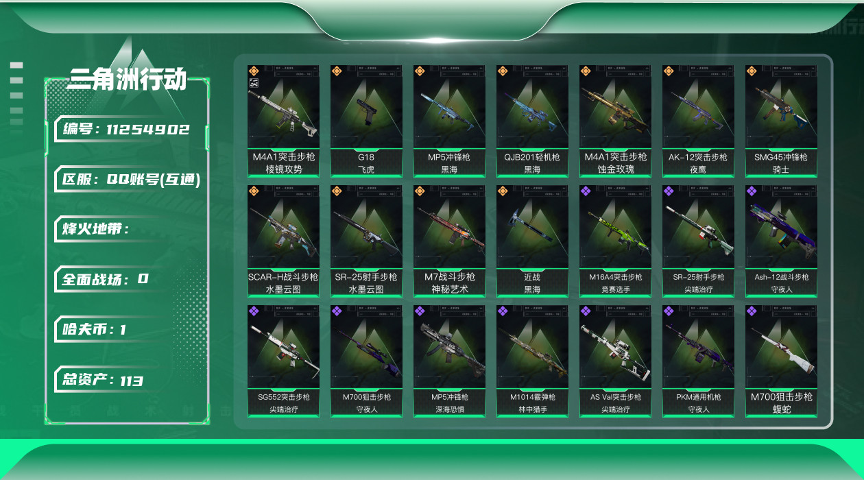 [11254902]可二次 可修改实名 实名:可修改 总资产:113.5 哈夫币:1.329 传说武器皮肤:近战-黑海,M4A1突击步枪-棱镜攻势(典藏),SCAR-H战斗步枪-水墨云图,SR-25射手步枪-水墨云图,AK-12突击步枪-夜鹰,SMG45冲锋枪-骑士,QJB201轻机枪-黑海,MP5冲锋枪-黑海,G18-飞虎,M4A1突击步枪-蚀金玫瑰,M7战斗步枪-神秘艺术 史诗武器皮肤:SR-3M紧凑突击步枪-英雄,AUG突击步枪-蝮蛇,M700狙击步枪-蝮蛇,PKM通用机枪-蝮蛇,G3战斗步枪-战场英杰,SR-25射手步枪-尖端治疗,AS Val突击步枪-尖端治疗,M700狙击步枪-守夜人,SG552突击步枪-尖端治疗,Ash-12战斗步枪-守夜人,MP5冲锋枪-深海恐惧,勇士冲锋枪-深海恐惧,SG552突击步枪-深海恐惧,AKM突击步枪-林中猎手,SVD狙击步枪-暗夜猎手,M16A4突击步枪-竞赛选手,PKM通用机枪-守夜人,M1014霰弹枪-林中猎手,QBZ95-1突击步枪-曙光,沙漠之鹰-曙光,Vector冲锋枪-阿萨拉文明,SVD狙击步枪-阿萨拉工艺,PKM通用机枪-英雄,M700狙击步枪-竞技风,QSZ92G-风林火山,93R-博士,ASh-12战斗步枪-刀锋 干员外观:红狼-蚀金玫瑰,骇爪-水墨云图,威龙-飞虎