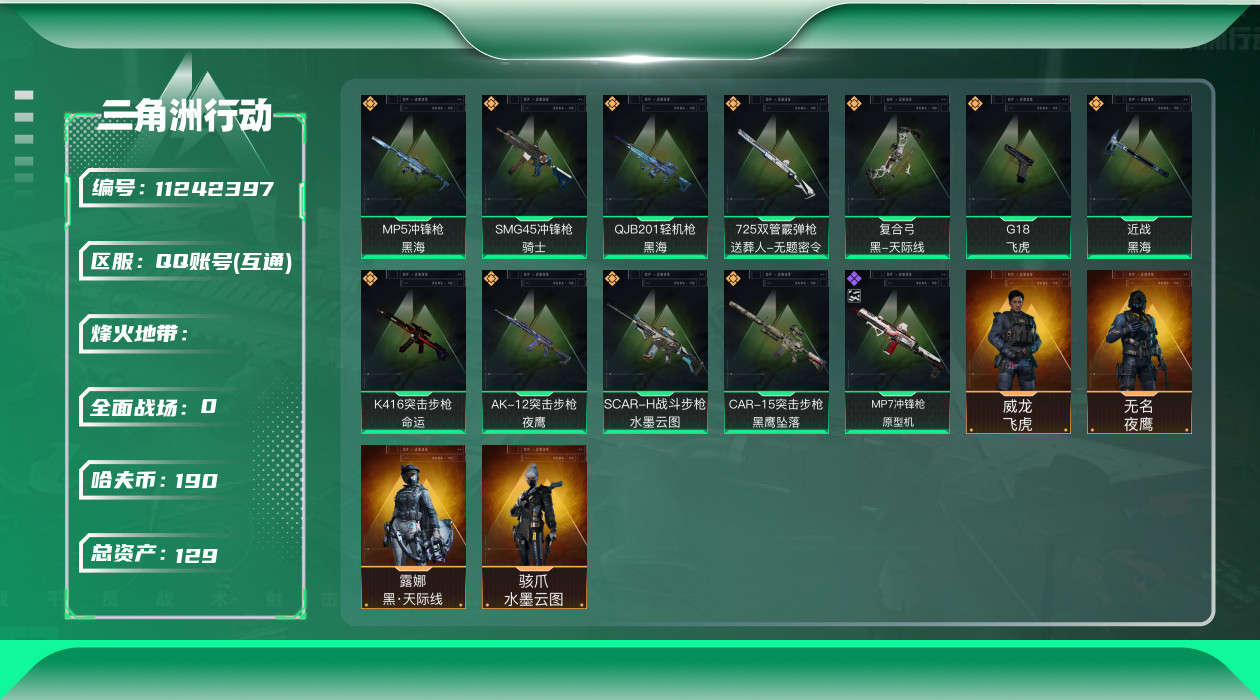 [11242397]可二次 可修改实名 实名:可修改 高级安全箱(2×3)9.15号到期 总资产:129.3 哈夫币:190.804 传说武器皮肤:近战-黑海,K416突击步枪-命运(典藏),SCAR-H战斗步枪-水墨云图,AK-12突击步枪-夜鹰,SMG45冲锋枪-骑士,QJB201轻机枪-黑海,MP5冲锋枪-黑海,复合弓-黑-天际线,725双管霰弹枪-送葬人-无题密令,G18-飞虎,CAR-15突击步枪-黑鹰坠落 史诗武器皮肤:MP7冲锋枪-原型机(典藏) 干员外观:骇爪-水墨云图,无名-夜鹰,威龙-飞虎,露娜-黑·天际线