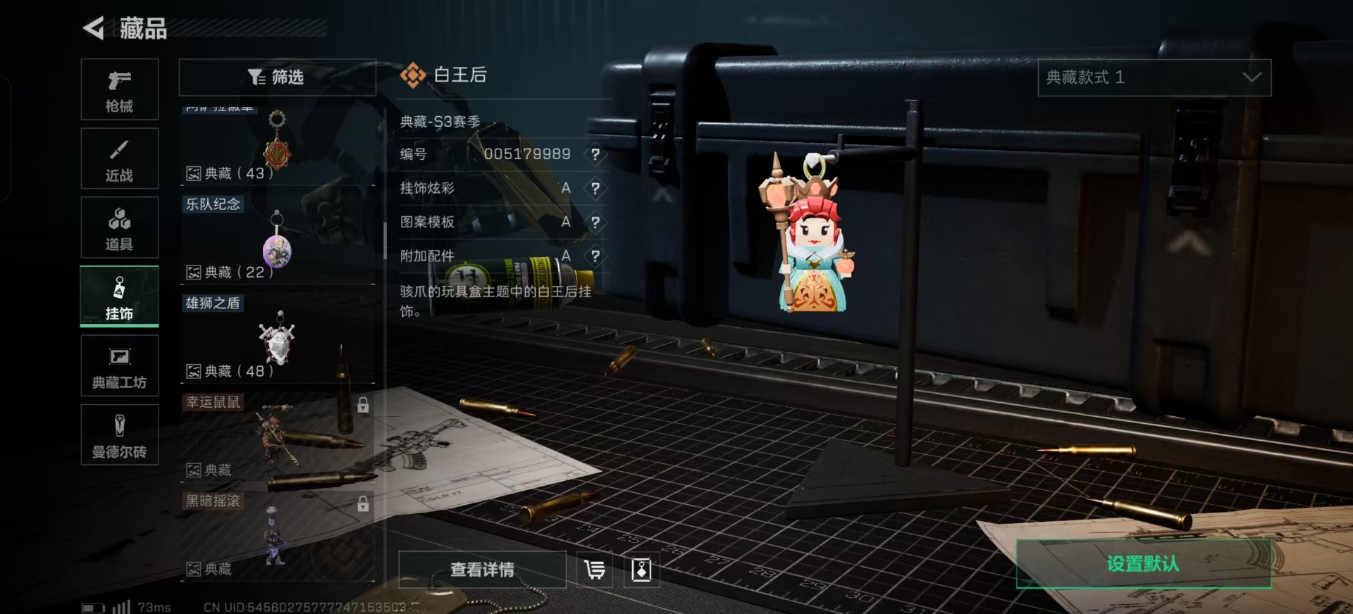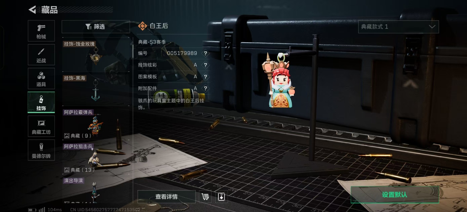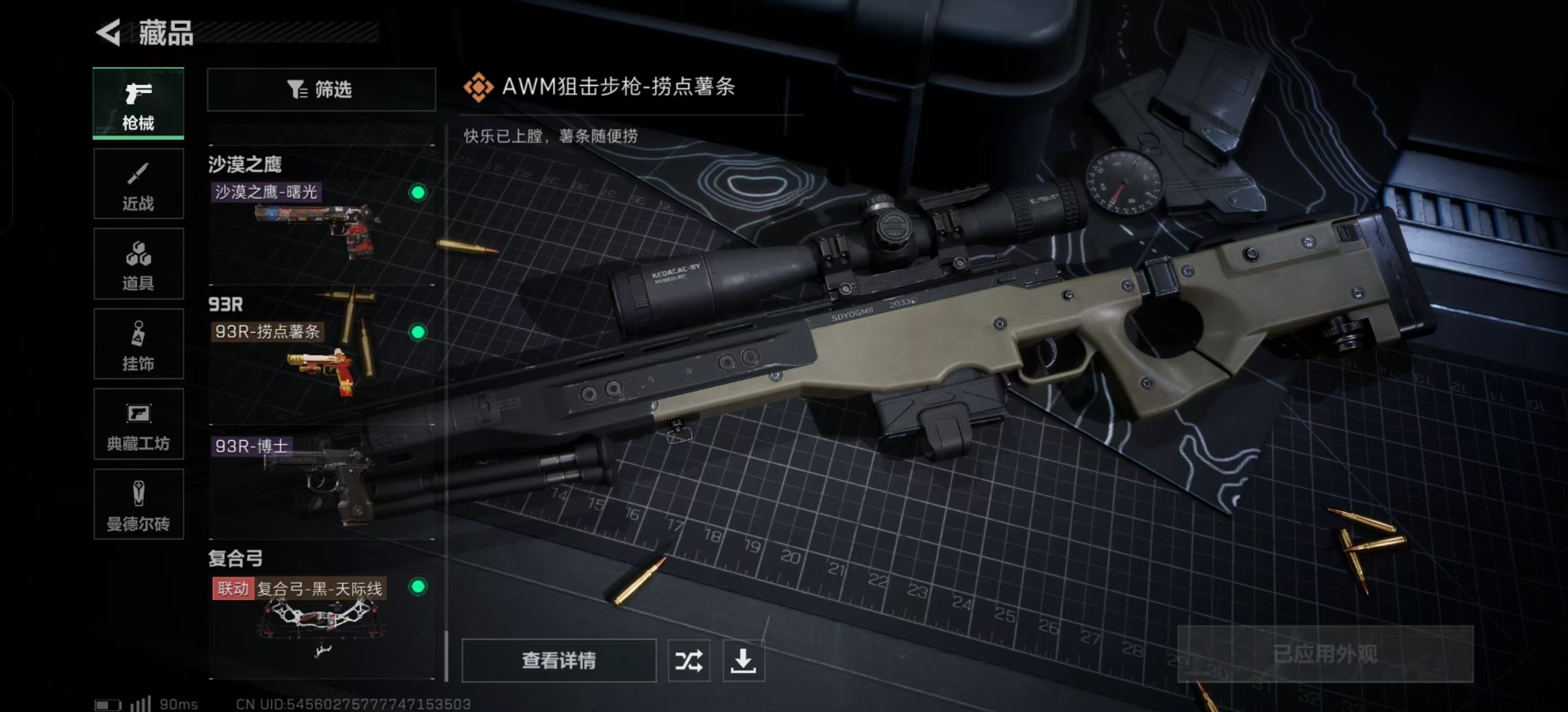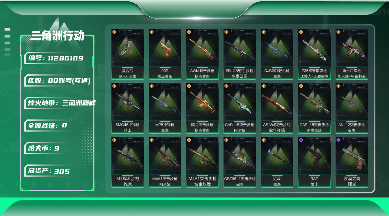 [11286109]总资产:305.7M 6干员外观 1近战传说 19传说枪械 哈夫币:9.955K 可二次 可修改实名 优质装备:近战-黑海,顶级安全箱(3x3) 烽火地带段位:三角洲巅峰 全面战场段位:上等兵 传说武器皮肤:AS Val突击步枪-蛇年祥瑞,SR-25射手步枪-水墨云图,AK-12突击步枪-夜鹰,SMG45冲锋枪-骑士,M4A1突击步枪-阿米娅,CAR-15突击步枪-阿米娅,复合弓-黑-天际线,AWM狙击步枪-捞点薯条,腾龙突击步枪-捞点薯条,93R-捞点薯条,勇士冲锋枪-能天使-午夜邮差,725双管霰弹枪-送葬人-无题密令,MP5冲锋枪-黑海,QJB201轻机枪-黑海,M7战斗步枪-维京,M4A1突击步枪-蚀金玫瑰,QBZ95-1突击步枪-破军,CAR-15突击步枪-黑鹰坠落 史诗武器皮肤:SR-3M紧凑突击步枪-英雄,M700狙击步枪-蝮蛇,G3战斗步枪-战场英杰,PKM通用机枪-守夜人,AS Val突击步枪-尖端治疗,M700狙击步枪-守夜人,SG552突击步枪-尖端治疗,SR-25射手步枪-尖端治疗,PKM通用机枪-荒野求生,勇士冲锋枪-深海恐惧,AKM突击步枪-林中猎手,.357左轮-幸运时刻,SR-3M紧凑突击步枪-荒野求生,M1014霰弹枪-林中猎手,SV-98狙击步枪-林中猎手,PTR-32突击步枪-英雄,SVD狙击步枪-荒野求生,M250通用机枪-囚徒,SV-98狙击步枪-囚徒,腾龙突击步枪-无垢,PSG-1射手步枪-无垢,M700狙击步枪-阿萨拉工艺,M14射手步枪-黑鹰坠落,沙漠之鹰-曙光,Vector冲锋枪-阿萨拉文明,SVD狙击步枪-阿萨拉工艺,PKM通用机枪-英雄,M700狙击步枪-竞技风,93R-博士 干员外观:威龙-铁面判官,红狼-蚀金玫瑰,牧羊人-街头之王,无名-夜鹰,蜂医-送葬人·无题密令(S5),露娜-黑·天际线