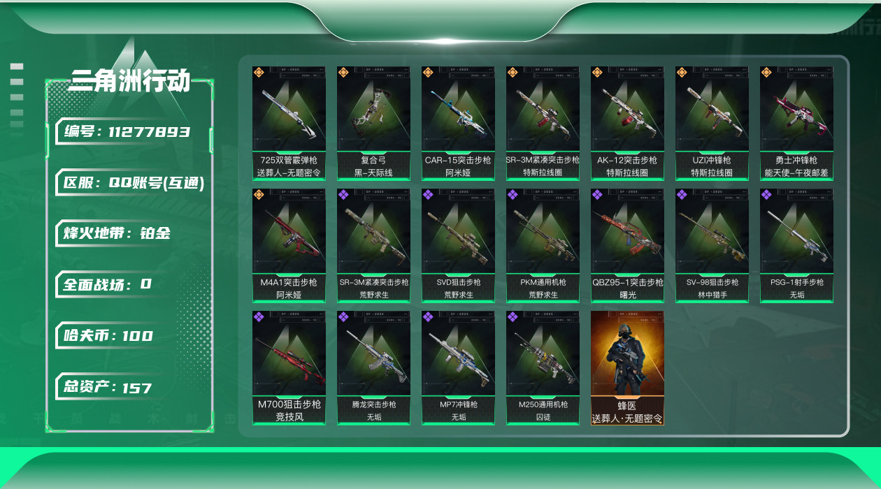 [11277893]总资产:157.1M 1干员外观 8传说枪械 哈夫币:100K 高级安全箱(2×3)9.15号到期 可二次 可修改实名 烽火地带段位:铂金 全面战场段位:无段位 传说武器皮肤:M4A1突击步枪-阿米娅,CAR-15突击步枪-阿米娅,复合弓-黑-天际线,AK-12突击步枪-特斯拉线圈,SR-3M紧凑突击步枪-特斯拉线圈,UZI冲锋枪-特斯拉线圈,勇士冲锋枪-能天使-午夜邮差,725双管霰弹枪-送葬人-无题密令 史诗武器皮肤:PKM通用机枪-荒野求生,SR-3M紧凑突击步枪-荒野求生,SV-98狙击步枪-林中猎手,SVD狙击步枪-荒野求生,M250通用机枪-囚徒,腾龙突击步枪-无垢,MP7冲锋枪-无垢,PSG-1射手步枪-无垢,QBZ95-1突击步枪-曙光,M700狙击步枪-竞技风 干员外观:蜂医-送葬人·无题密令(S5)