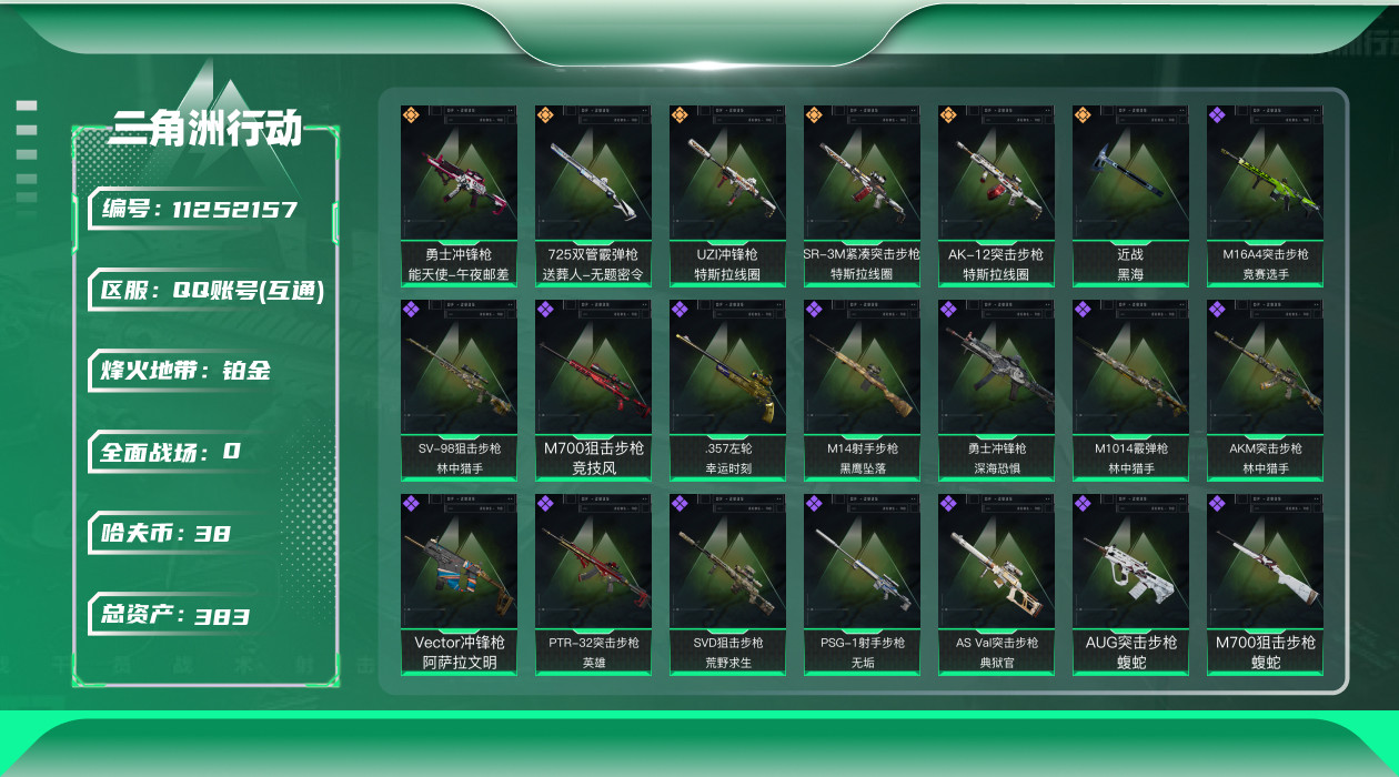 [11252157]总资产:383 1近战传说 6传说枪械 顶级安全箱(3×3)9.15号到期 可二次 可修改实名 优质装备:近战-黑海,顶级安全箱(3x3) 烽火地带段位:铂金 全面战场段位:无段位 哈夫币:38.118 传说武器皮肤:UZI冲锋枪-特斯拉线圈,SR-3M紧凑突击步枪-特斯拉线圈,AK-12突击步枪-特斯拉线圈,725双管霰弹枪-送葬人-无题密令,勇士冲锋枪-能天使-午夜邮差 史诗武器皮肤:AUG突击步枪-蝮蛇,M700狙击步枪-蝮蛇,勇士冲锋枪-深海恐惧,AKM突击步枪-林中猎手,.357左轮-幸运时刻,M16A4突击步枪-竞赛选手,SVD狙击步枪-荒野求生,M1014霰弹枪-林中猎手,SV-98狙击步枪-林中猎手,PTR-32突击步枪-英雄,PSG-1射手步枪-无垢,AS Val突击步枪-典狱官,Vector冲锋枪-阿萨拉文明,M14射手步枪-黑鹰坠落,M700狙击步枪-竞技风