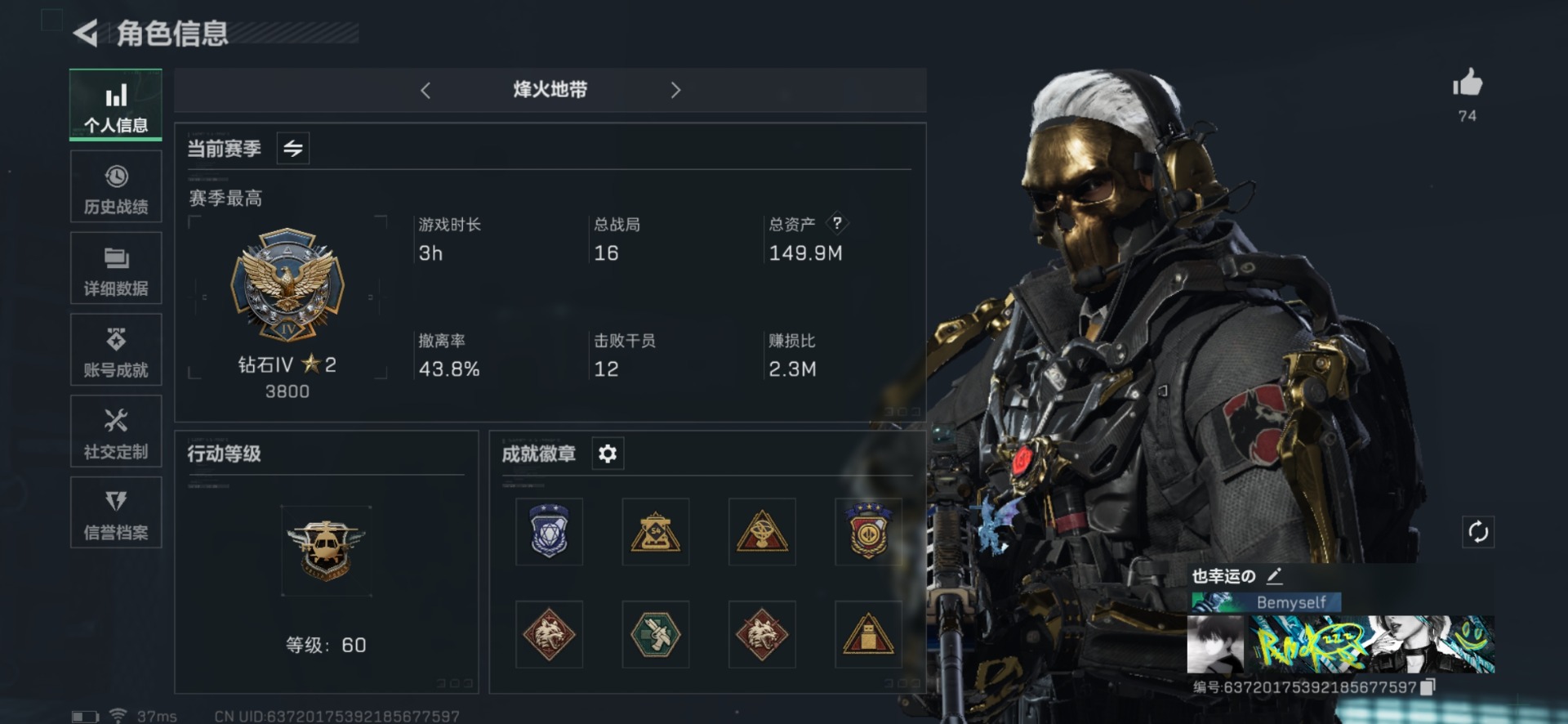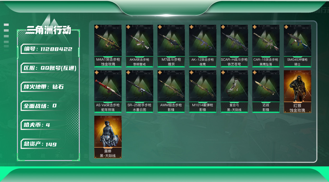 [11288422]总资产:149.9 2干员外观 1近战传说 13传说枪械 可二次 可修改实名 烽火地带段位:钻石 全面战场段位:上等兵 哈夫币:4.225 传说武器皮肤:近战-影锋,AS Val突击步枪-蛇年祥瑞,SR-25射手步枪-水墨云图,AWM狙击步枪-影锋,M1014霰弹枪-影锋,SCAR-H战斗步枪-铁艺苍穹,AK-12突击步枪-夜鹰,SMG45冲锋枪-骑士,复合弓-黑-天际线,AKM突击步枪-黎明警戒,M7战斗步枪-维京,M4A1突击步枪-蚀金玫瑰,CAR-15突击步枪-黑鹰坠落 干员外观:红狼-蚀金玫瑰,露娜-黑·天际线