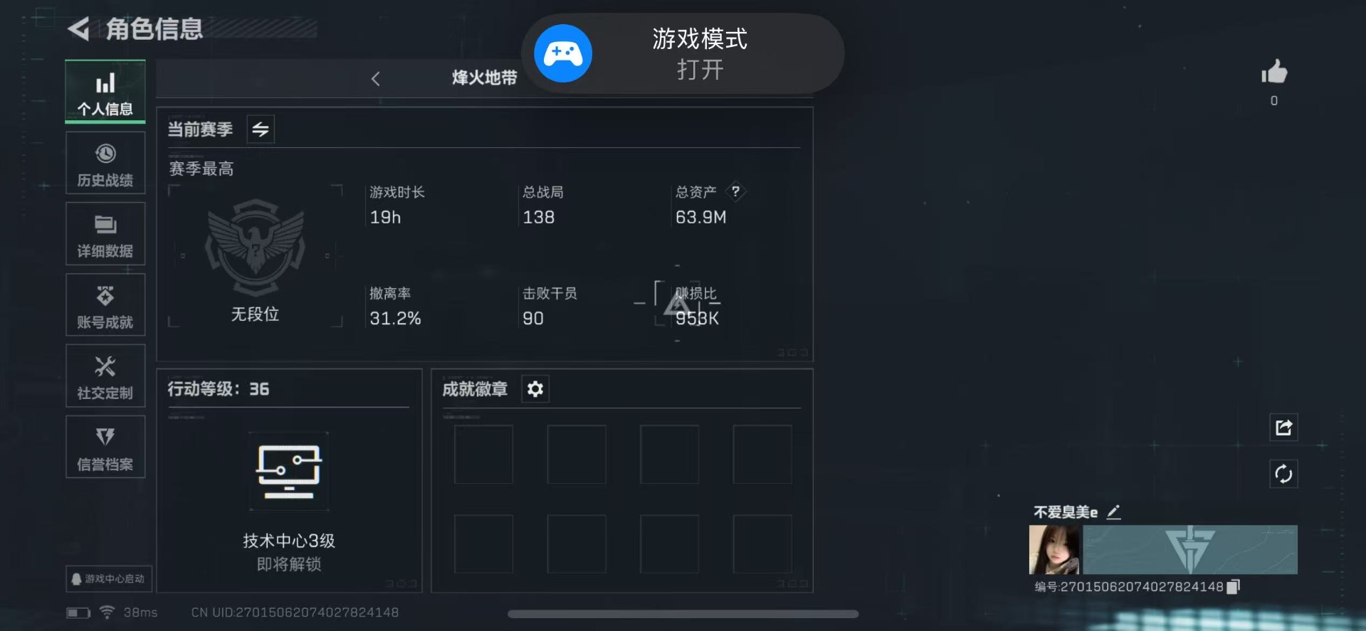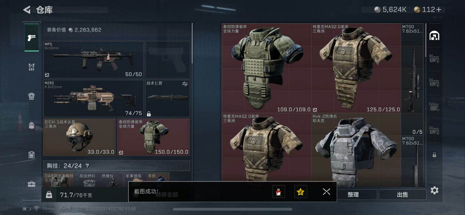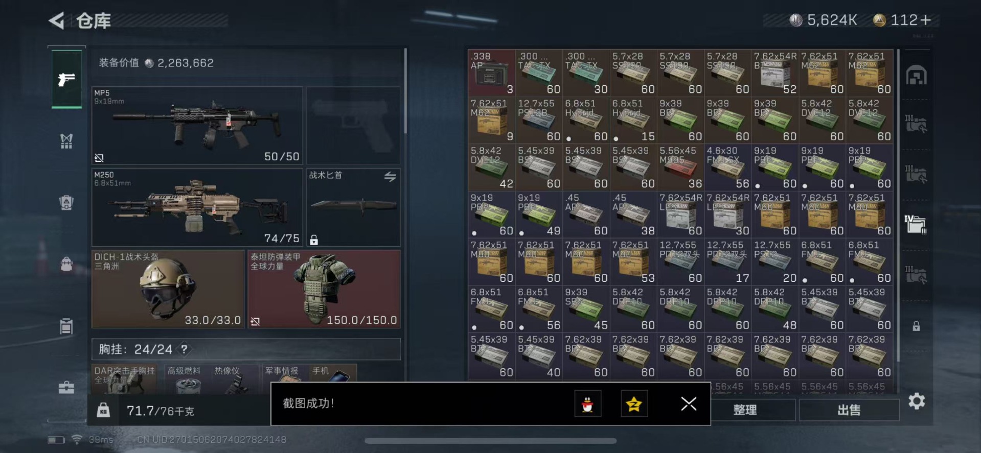 - [11685298]总资产:76 可二次 可修改实名 烽火地带段位:铂金 全面战场段位:列兵 哈夫币:65.137 史诗武器皮肤:AKM突击步枪-林中猎手,SVD狙击步枪-暗夜猎手,M1014霰弹枪-林中猎手,M250通用机枪-囚徒,沙漠之鹰-曙光,PKM通用机枪-英雄