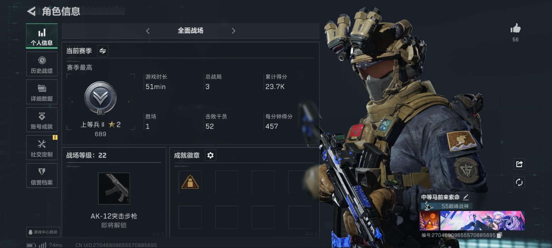 - [12090171]总资产:52.4M 1干员外观 1近战传说 8传说枪械 哈夫币:203.291K 顶级安全箱(3×3)9.15号到期 可二次 可修改实名 优质装备:近战-影锋,顶级安全箱(3x3) 烽火地带段位:钻石 全面战场段位:上等兵 传说武器皮肤:AK-12突击步枪-夜鹰,SMG45冲锋枪-骑士,AWM狙击步枪-捞点薯条,腾龙突击步枪-捞点薯条,93R-捞点薯条,勇士冲锋枪-能天使-午夜邮差,M4A1突击步枪-蚀金玫瑰 史诗武器皮肤:Ash-12战斗步枪-守夜人,M16A4突击步枪-竞赛选手,AS Val突击步枪-尖端治疗,M700狙击步枪-守夜人,SG552突击步枪-尖端治疗,SR-25射手步枪-尖端治疗,MP5冲锋枪-深海恐惧,勇士冲锋枪-深海恐惧,M1014霰弹枪-林中猎手,SV-98狙击步枪-林中猎手,PTR-32突击步枪-英雄,SV-98狙击步枪-囚徒,S12K霰弹枪-曙光,M700狙击步枪-竞技风 干员外观:红狼-蚀金玫瑰