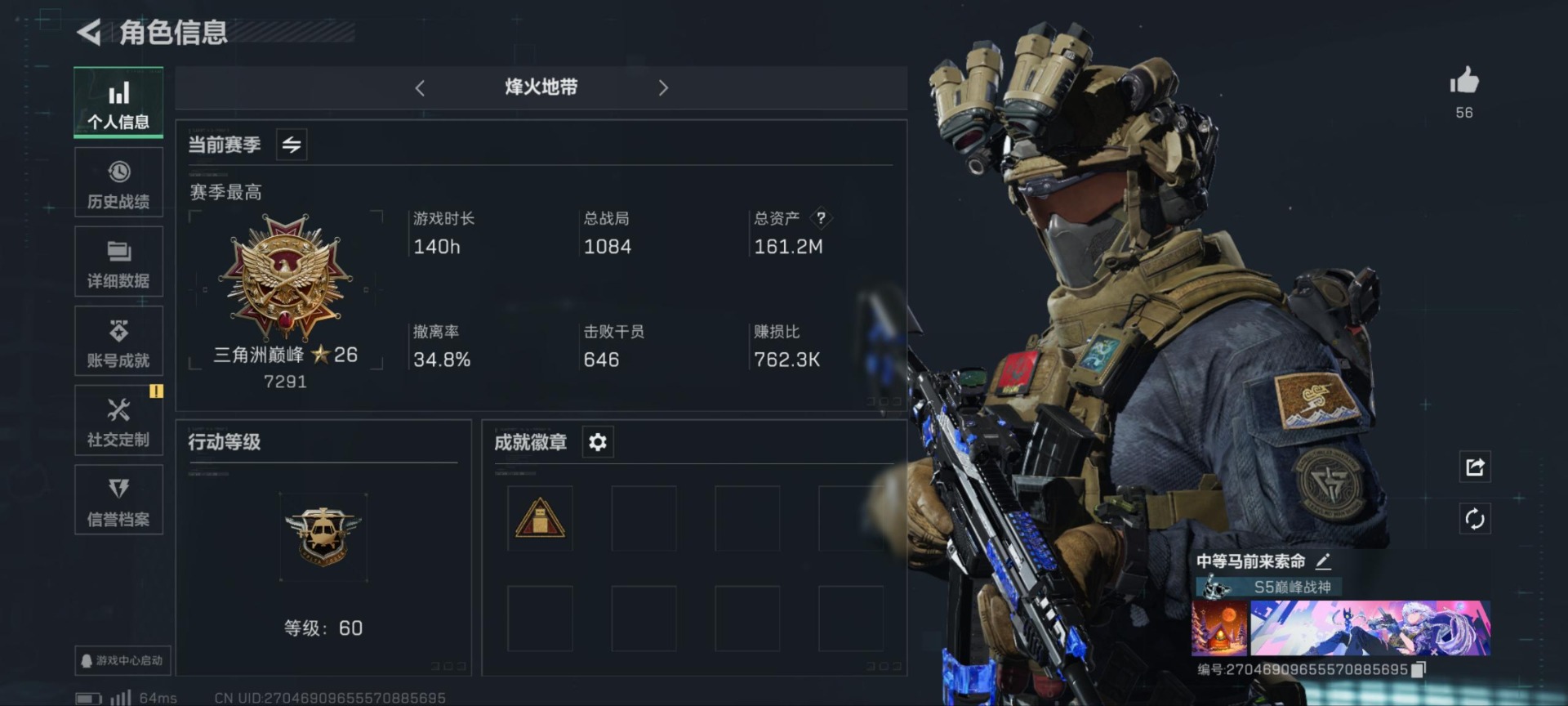 [11294989]总资产:161.2M 5干员外观 2近战传说 16传说枪械 哈夫币:81.990K 高级安全箱(2×3)9.15号到期 可二次 可修改实名 优质装备:近战-影锋,近战-北极星 烽火地带段位:三角洲巅峰 全面战场段位:上等兵 传说武器皮肤:SCAR-H战斗步枪-水墨云图,SCAR-H战斗步枪-铁艺苍穹,AK-12突击步枪-夜鹰,SMG45冲锋枪-骑士,M4A1突击步枪-阿米娅,复合弓-黑-天际线,QCQ171冲锋枪-北极星,AK-12突击步枪-特斯拉线圈,SR-3M紧凑突击步枪-特斯拉线圈,UZI冲锋枪-特斯拉线圈,勇士冲锋枪-能天使-午夜邮差,725双管霰弹枪-送葬人-无题密令,K437突击步枪-北极星,M4A1突击步枪-蚀金玫瑰 史诗武器皮肤:SR-3M紧凑突击步枪-英雄,M4A1突击步枪-特勤执行,AUG突击步枪-特勤执行,Vector冲锋枪-红色彗星,PTR-32战斗步枪-ACE,SKS射手步枪-ACE,AUG突击步枪-蝮蛇,M700狙击步枪-蝮蛇,G3战斗步枪-战场英杰,Ash-12战斗步枪-守夜人,PKM通用机枪-守夜人,SG552突击步枪-尖端治疗,SR-25射手步枪-尖端治疗,PKM通用机枪-荒野求生,勇士冲锋枪-深海恐惧,AKM突击步枪-林中猎手,M1014霰弹枪-林中猎手,PTR-32突击步枪-英雄,M250通用机枪-囚徒,SV-98狙击步枪-囚徒,SCAR-H战斗步枪-囚徒,PSG-1射手步枪-无垢,SVD狙击步枪-阿萨拉工艺,S12K霰弹枪-曙光,PKM通用机枪-英雄,QSZ92G-风林火山 干员外观:红狼-蚀金玫瑰,威龙-壮志凌云,骇爪-水墨云图,无名-夜鹰,露娜-黑·天际线