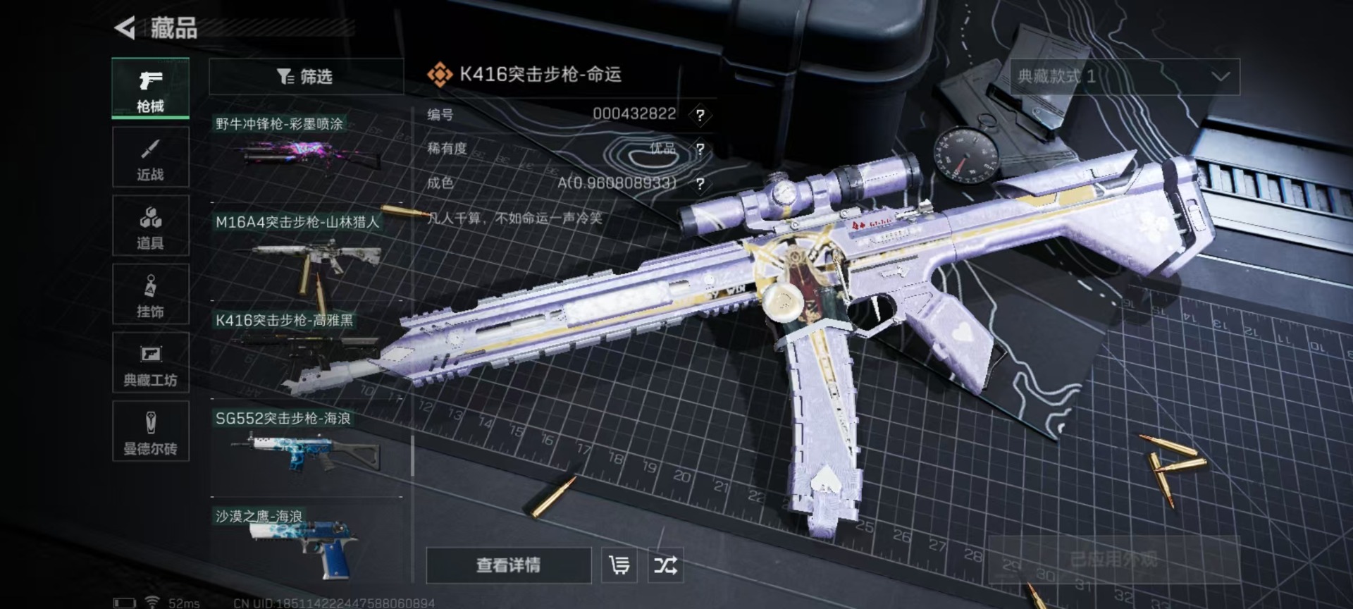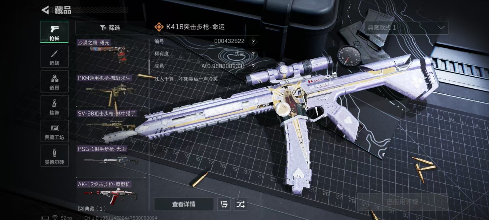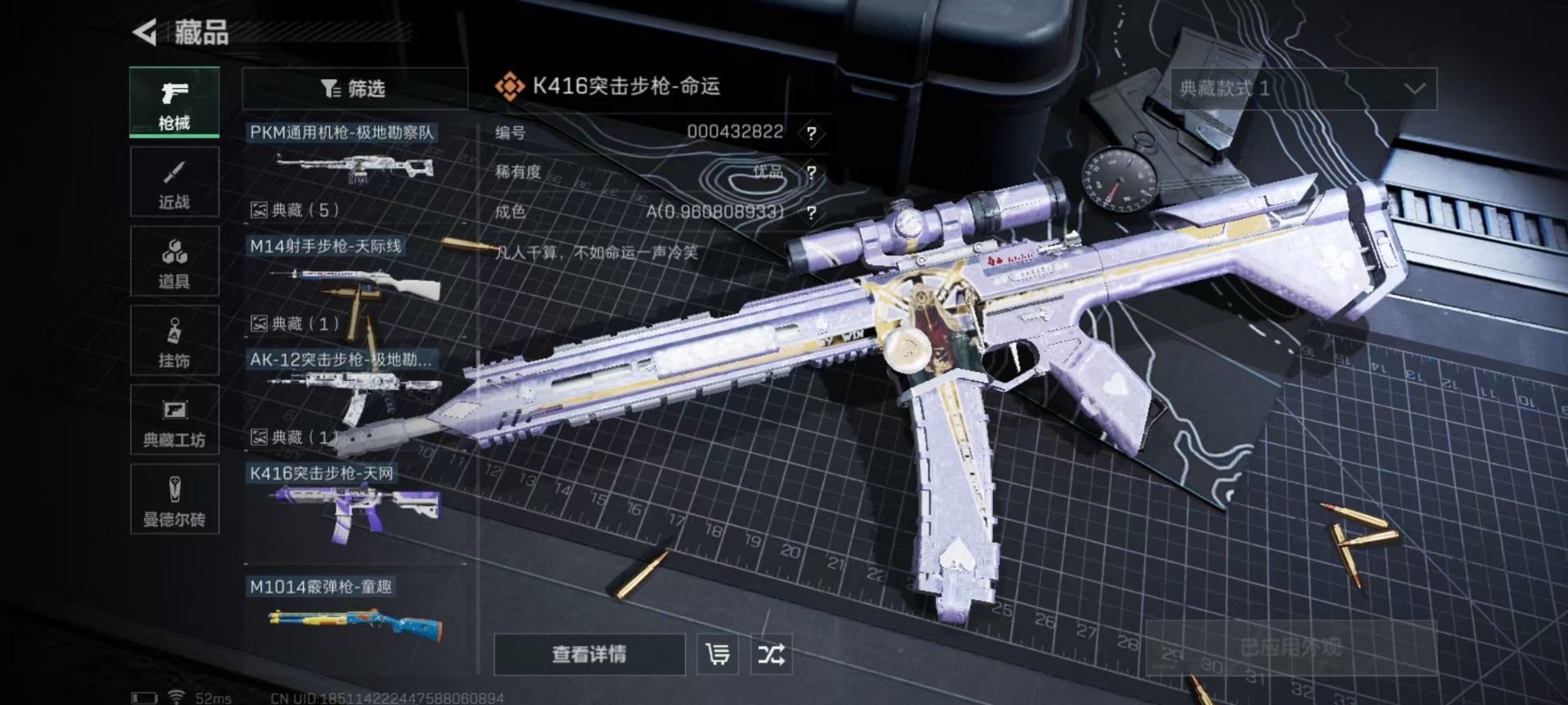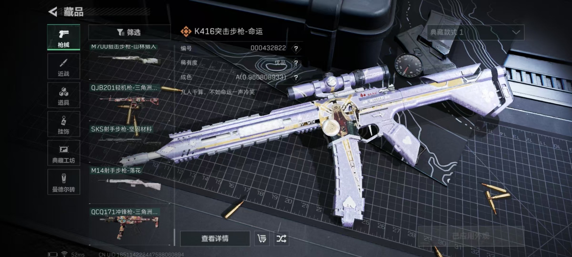 [11279015]总资产:148.9M 1干员外观 9传说枪械 哈夫币:115K 高级安全箱(2×3)9.15号到期 可二次 可修改实名 优质装备:K416突击步枪-命运(典藏) 烽火地带段位:白银 全面战场段位:无段位 传说武器皮肤:SR-25射手步枪-水墨云图,AK-12突击步枪-夜鹰,复合弓-黑-天际线,AK-12突击步枪-特斯拉线圈,SR-3M紧凑突击步枪-特斯拉线圈,UZI冲锋枪-特斯拉线圈,勇士冲锋枪-能天使-午夜邮差,725双管霰弹枪-送葬人-无题密令 史诗武器皮肤:AK-12突击步枪-原型机(典藏),MP7冲锋枪-原型机(典藏),PKM通用机枪-荒野求生,SR-3M紧凑突击步枪-荒野求生,AKM突击步枪-林中猎手,M1014霰弹枪-林中猎手,SV-98狙击步枪-林中猎手,PSG-1射手步枪-无垢,沙漠之鹰-曙光 干员外观:露娜-黑·天际线