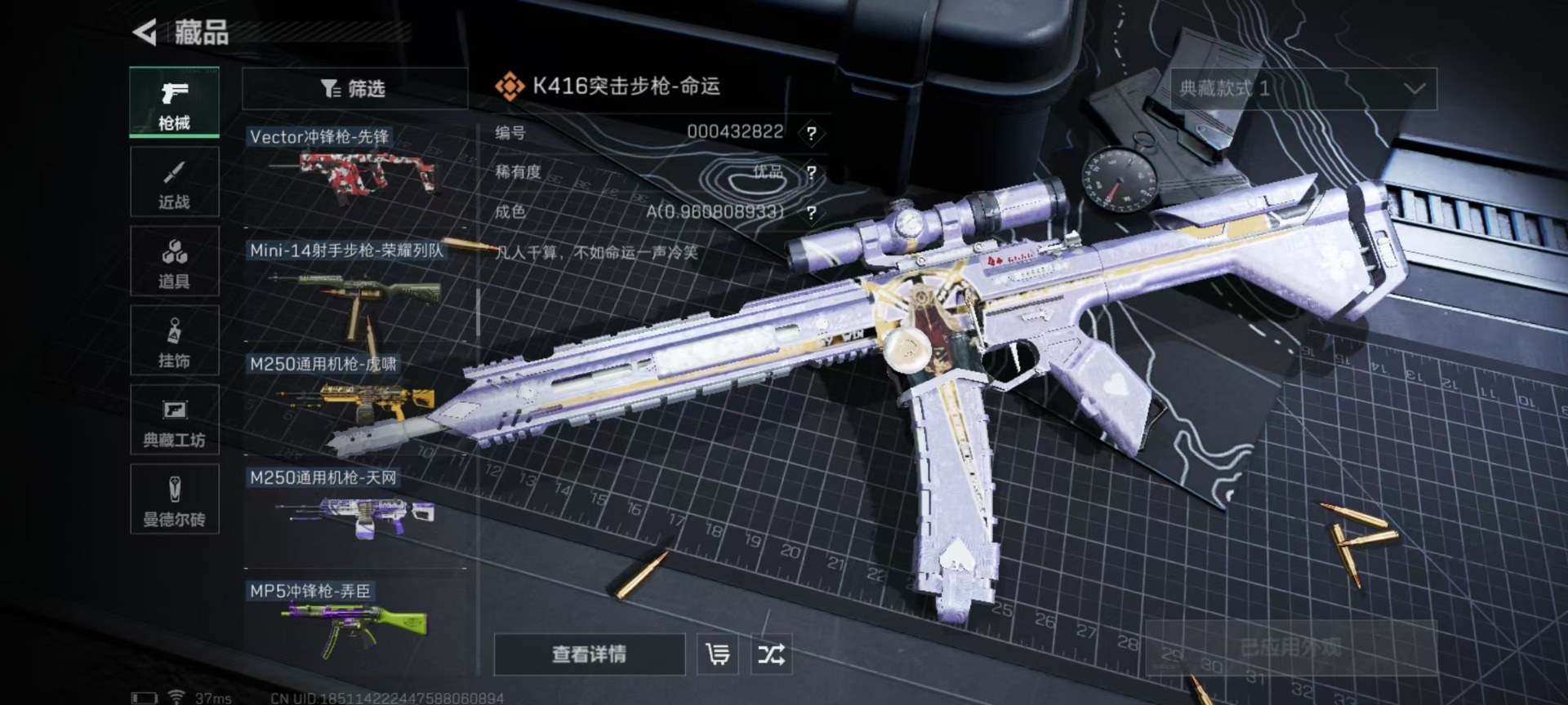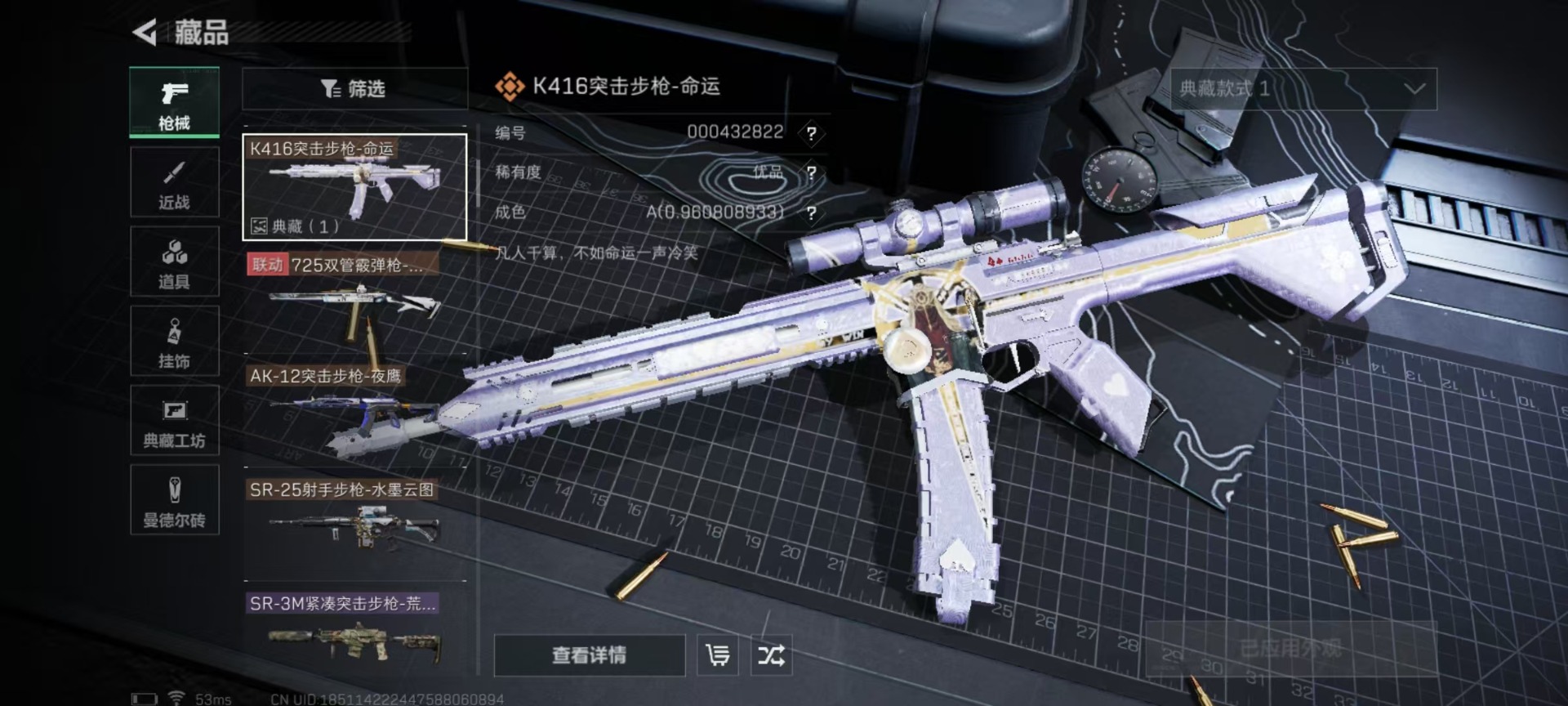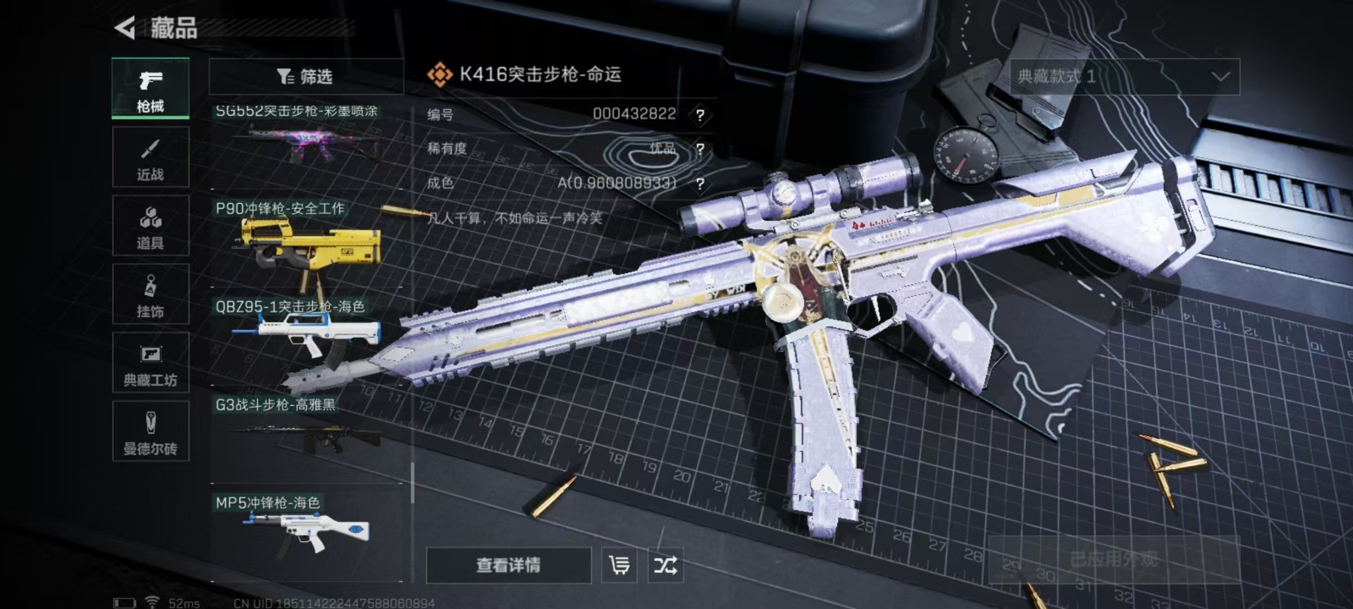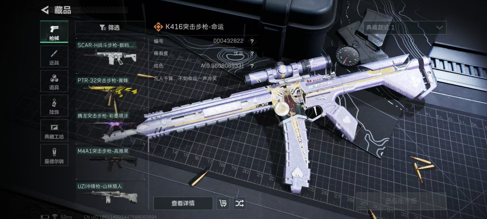 [11279015]总资产:148.9M 1干员外观 9传说枪械 哈夫币:115K 高级安全箱(2×3)9.15号到期 可二次 可修改实名 优质装备:K416突击步枪-命运(典藏) 烽火地带段位:白银 全面战场段位:无段位 传说武器皮肤:SR-25射手步枪-水墨云图,AK-12突击步枪-夜鹰,复合弓-黑-天际线,AK-12突击步枪-特斯拉线圈,SR-3M紧凑突击步枪-特斯拉线圈,UZI冲锋枪-特斯拉线圈,勇士冲锋枪-能天使-午夜邮差,725双管霰弹枪-送葬人-无题密令 史诗武器皮肤:AK-12突击步枪-原型机(典藏),MP7冲锋枪-原型机(典藏),PKM通用机枪-荒野求生,SR-3M紧凑突击步枪-荒野求生,AKM突击步枪-林中猎手,M1014霰弹枪-林中猎手,SV-98狙击步枪-林中猎手,PSG-1射手步枪-无垢,沙漠之鹰-曙光 干员外观:露娜-黑·天际线
