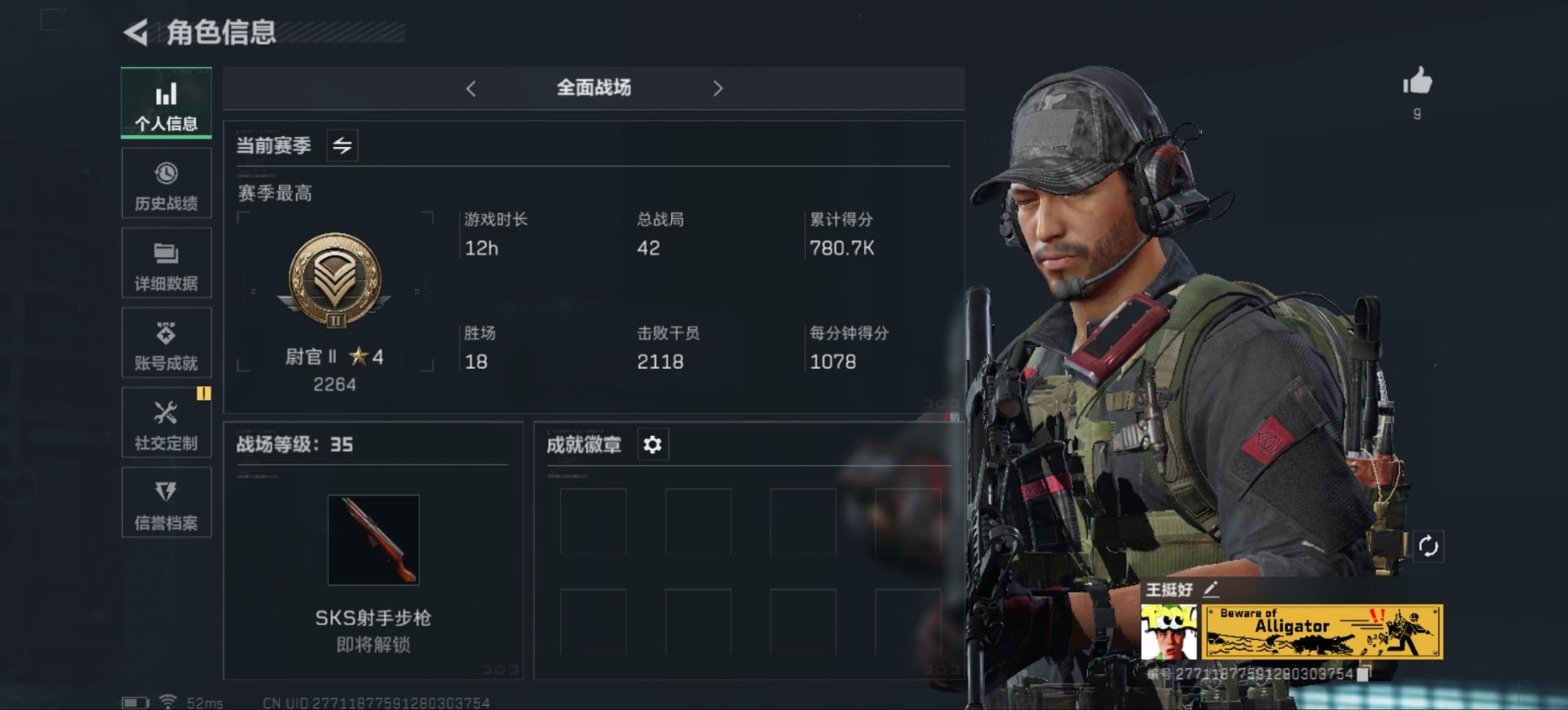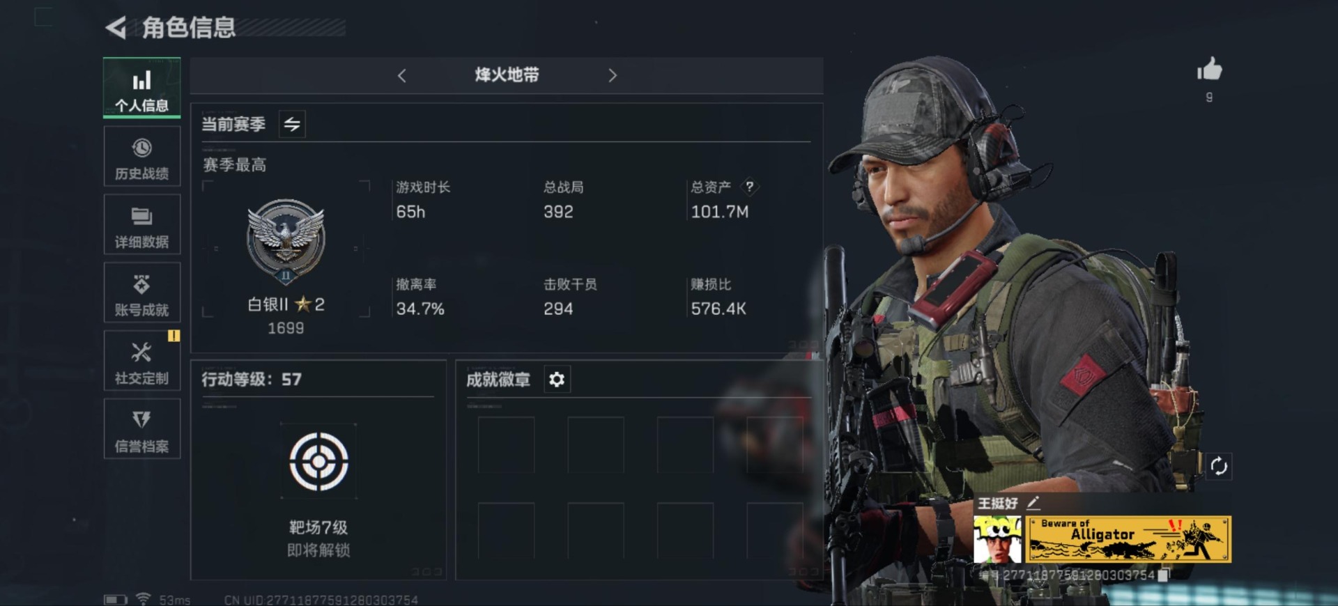 [11289362]总资产:101.7M 6传说枪械 哈夫币:86.359K 进阶安全箱(2×2)9.15号到期 可二次 可修改实名 烽火地带段位:白银 全面战场段位:尉官 传说武器皮肤:M16A4突击步枪-狩猎时刻,M4A1突击步枪-阿米娅,复合弓-黑-天际线,Vector冲锋枪-狩猎时刻,G3战斗步枪-狩猎时刻,勇士冲锋枪-能天使-午夜邮差