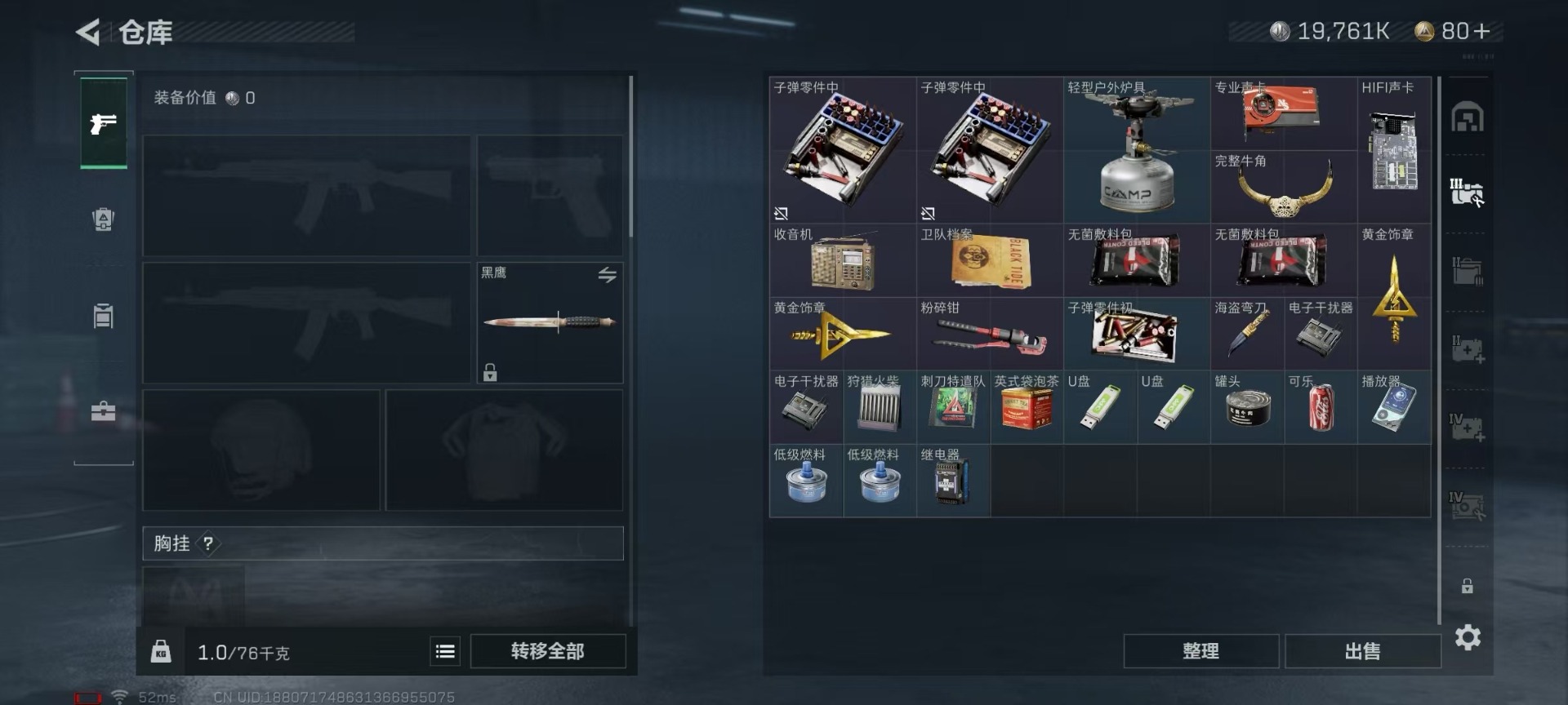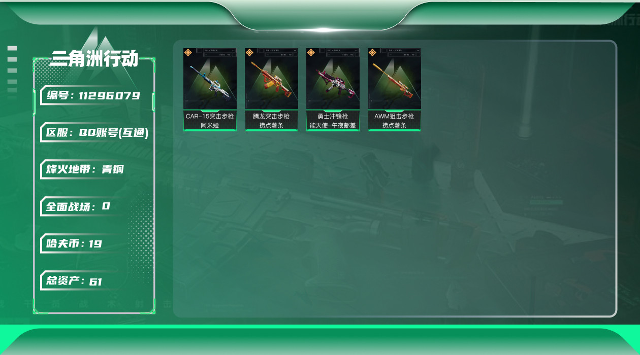 [11296079]总资产:61.4 4传说枪械 可二次 可修改实名 烽火地带段位:青铜 全面战场段位:无段位 哈夫币:19.761 传说武器皮肤:CAR-15突击步枪-阿米娅,AWM狙击步枪-捞点薯条,腾龙突击步枪-捞点薯条,勇士冲锋枪-能天使-午夜邮差