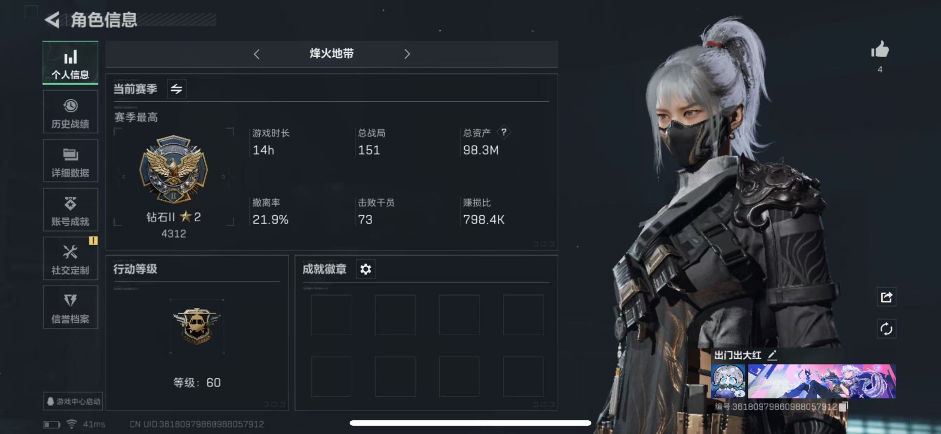 [11254237]可二次 可修改实名 实名:可修改 总资产:98.3 哈夫币:3.408 传说武器皮肤:近战-北极星,SCAR-H战斗步枪-水墨云图,AK-12突击步枪-夜鹰,QCQ171冲锋枪-北极星,K437突击步枪-北极星,M4A1突击步枪-蚀金玫瑰,CAR-15突击步枪-黑鹰坠落 干员外观:骇爪-水墨云图,无名-夜鹰