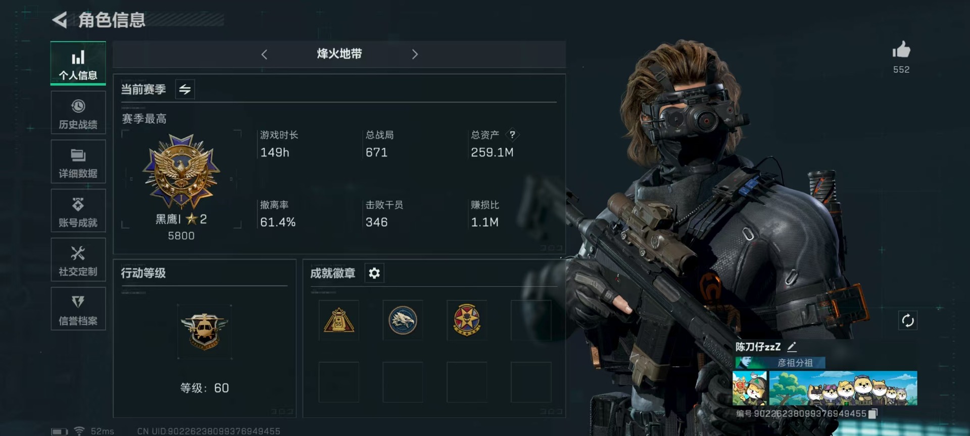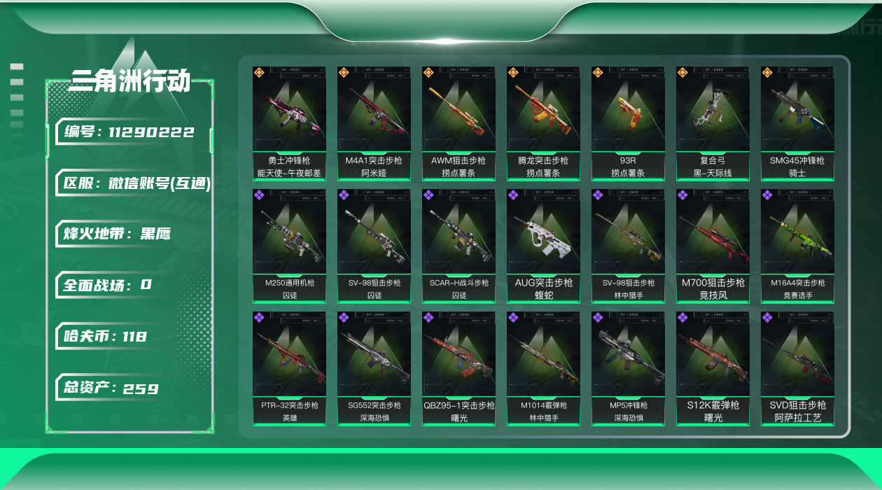 [11290222]总资产:259.1M 1干员外观 7传说枪械 哈夫币:118K 顶级安全箱(3×3)9.15号到期 可二次 可修改实名 优质装备:顶级安全箱(3x3) 烽火地带段位:黑鹰 全面战场段位:上等兵 传说武器皮肤:SMG45冲锋枪-骑士,M4A1突击步枪-阿米娅,复合弓-黑-天际线,AWM狙击步枪-捞点薯条,腾龙突击步枪-捞点薯条,93R-捞点薯条,勇士冲锋枪-能天使-午夜邮差 史诗武器皮肤:AUG突击步枪-蝮蛇,MP5冲锋枪-深海恐惧,勇士冲锋枪-深海恐惧,SG552突击步枪-深海恐惧,AKM突击步枪-林中猎手,M16A4突击步枪-竞赛选手,M1014霰弹枪-林中猎手,SV-98狙击步枪-林中猎手,PTR-32突击步枪-英雄,M250通用机枪-囚徒,SV-98狙击步枪-囚徒,SCAR-H战斗步枪-囚徒,QBZ95-1突击步枪-曙光,SVD狙击步枪-阿萨拉工艺,S12K霰弹枪-曙光,M700狙击步枪-竞技风 干员外观:露娜-黑·天际线