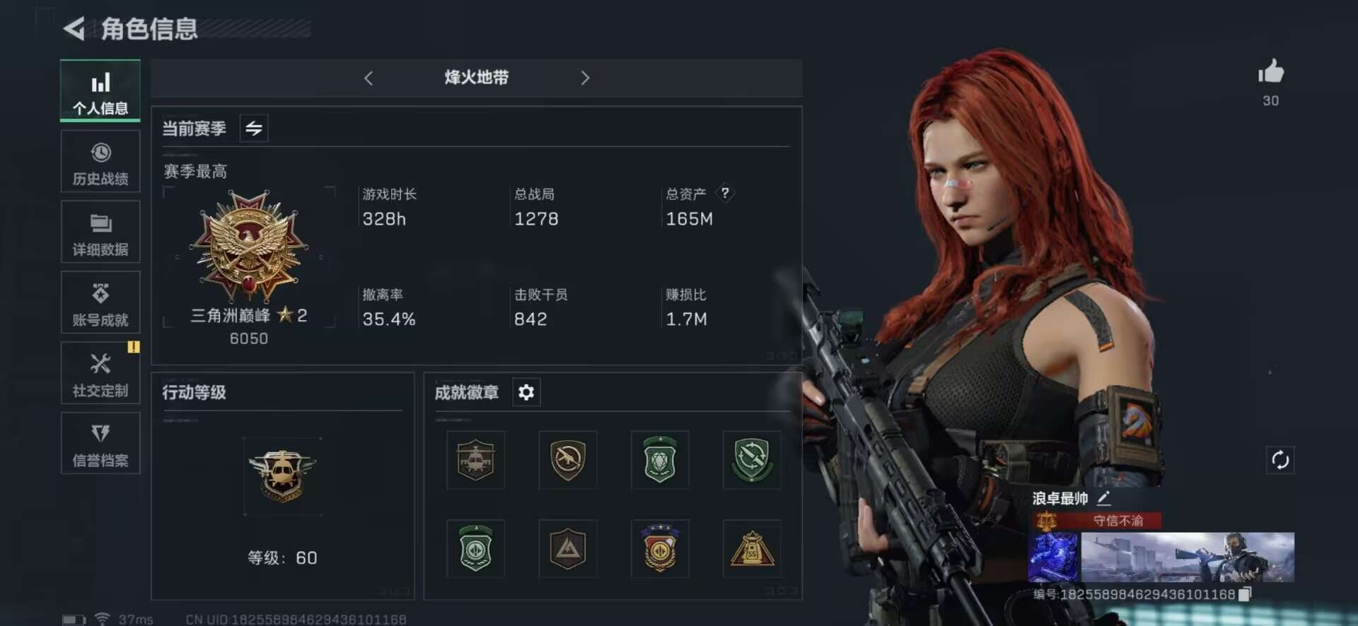 - [11877332]总资产:79M 3干员外观 2近战传说 15传说枪械 哈夫币:3.451K 可二次 可修改实名 优质装备:近战-黑海,近战-北极星,K416突击步枪-命运(典藏),Vector冲锋枪-美杜莎,SCAR-H战斗步枪-电玩高手 烽火地带段位:无段位 全面战场段位:无段位 传说武器皮肤:腾龙突击步枪-黎明警戒,K437突击步枪-极速狂飙,G18-黎明警戒,AKM突击步枪-黎明警戒,M14射手步枪-工业审判,复合弓-黑-天际线,K437突击步枪-北极星,QCQ171冲锋枪-北极星,725双管霰弹枪-送葬人-无题密令,M4A1突击步枪-蚀金玫瑰 干员外观:红狼-蚀金玫瑰,骇爪-水墨云图,威龙-飞虎