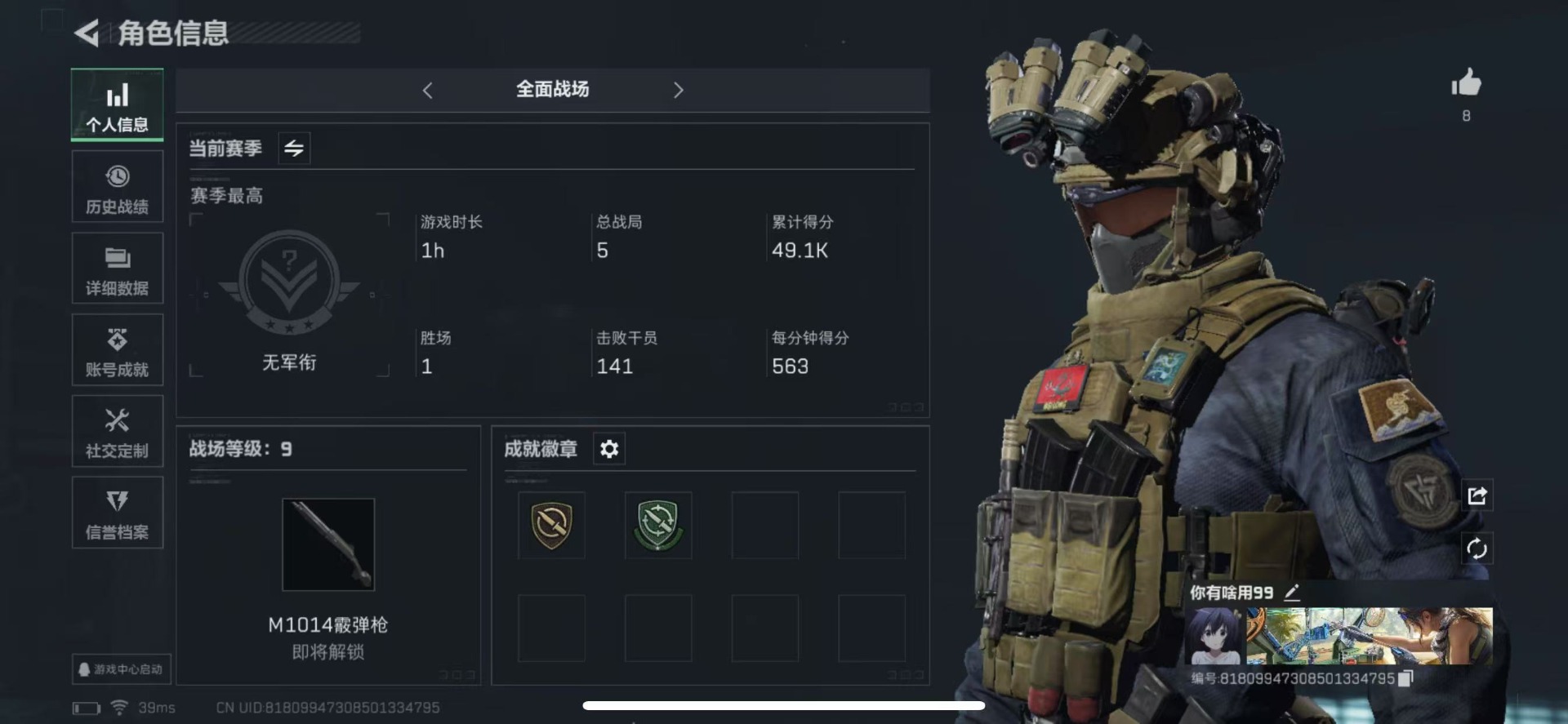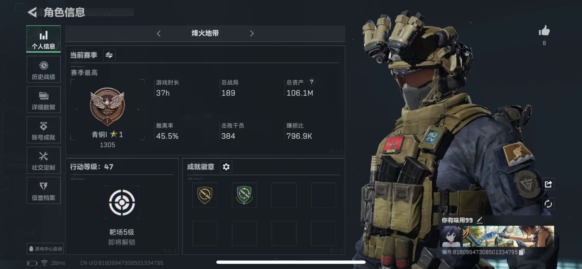 [11292385]总资产:106.1 1传说枪械 进阶安全箱(9.17到期) 可二次 可修改实名 烽火地带段位:青铜 全面战场段位:无段位 哈夫币:58.290 传说武器皮肤:CAR-15突击步枪-阿米娅 史诗武器皮肤:AUG突击步枪-蝮蛇,SG552突击步枪-深海恐惧,AKM突击步枪-林中猎手,M1014霰弹枪-林中猎手,SV-98狙击步枪-林中猎手,M700狙击步枪-竞技风