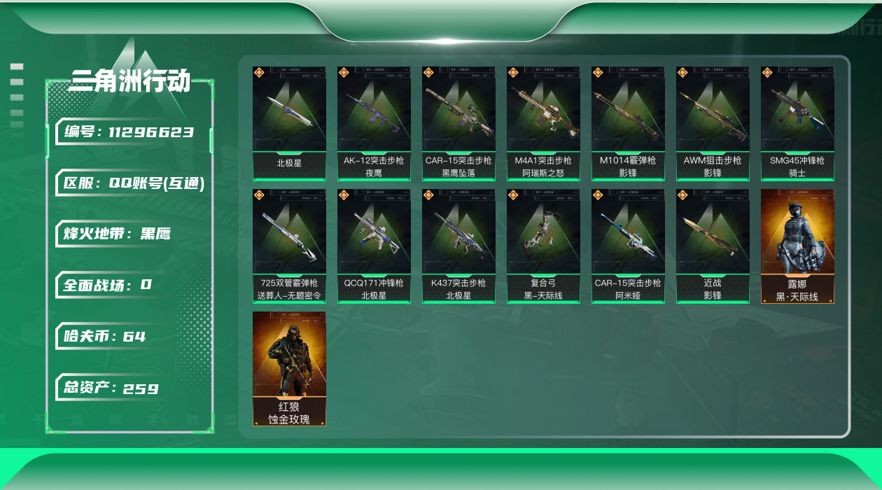 [11296623]可二次 可修改实名 实名:可修改 顶级安全箱(9.17到期) 烽火地带段位:黑鹰 全面战场段位:无段位 总资产:259.1 哈夫币:64.299 传说武器皮肤:近战-影锋,近战-北极星,AWM狙击步枪-影锋,M1014霰弹枪-影锋,AK-12突击步枪-夜鹰,SMG45冲锋枪-骑士,复合弓-黑-天际线,CAR-15突击步枪-阿米娅,725双管霰弹枪-送葬人-无题密令,QCQ171冲锋枪-北极星,K437突击步枪-北极星,M4A1突击步枪-阿瑞斯之怒,CAR-15突击步枪-黑鹰坠落 干员外观:红狼-蚀金玫瑰,露娜-黑·天际线