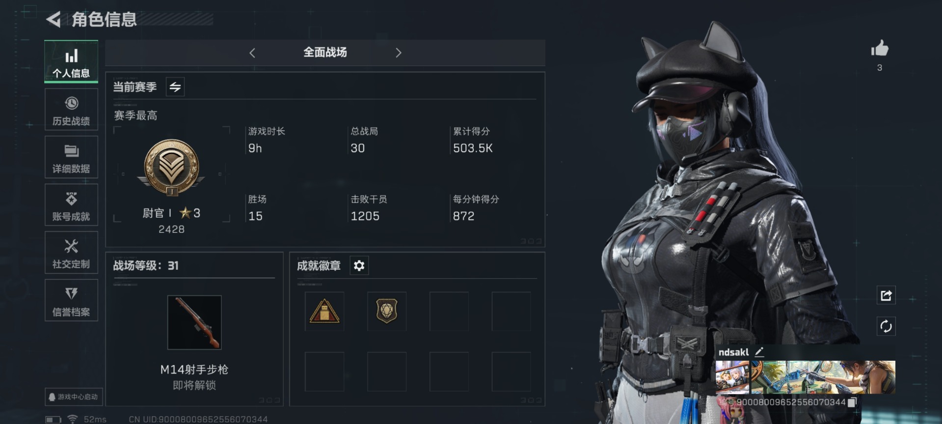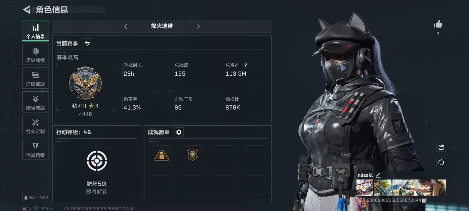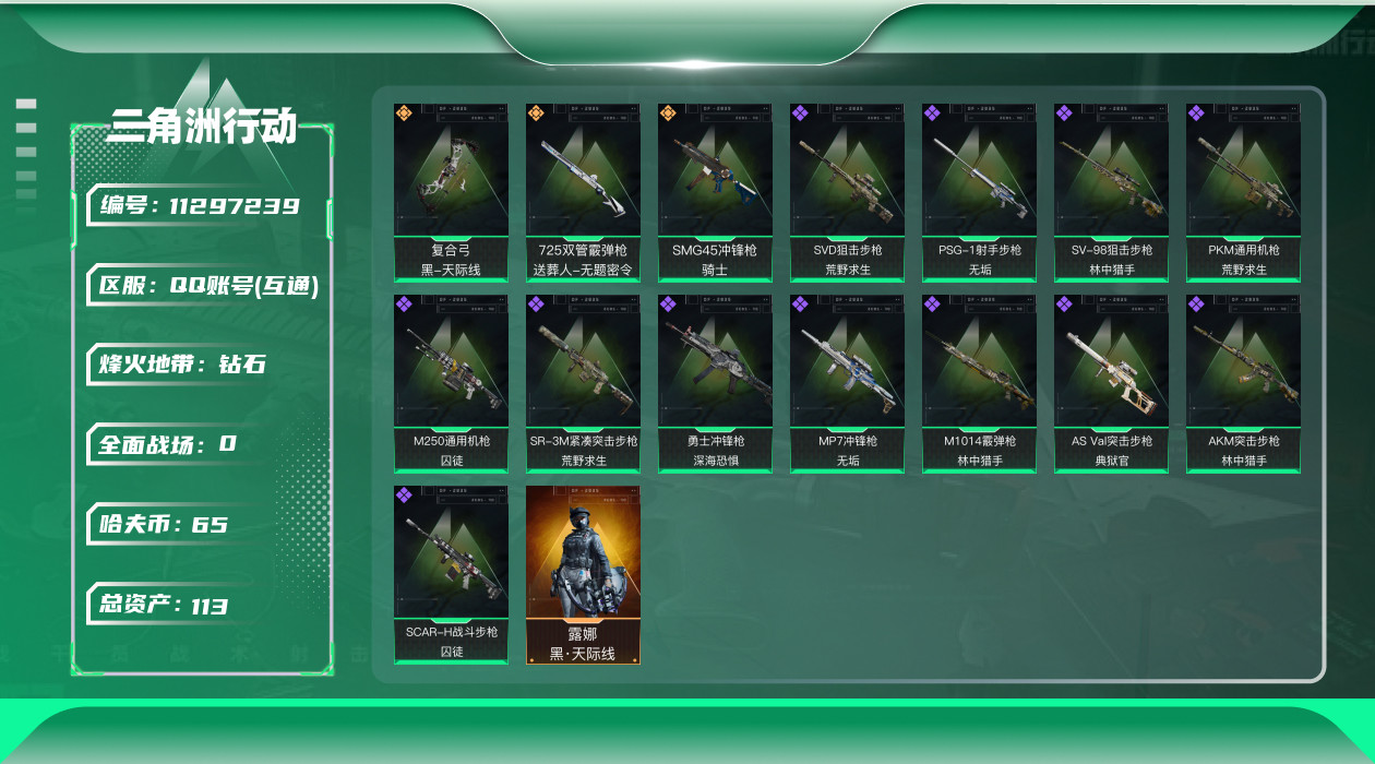 [11297239]总资产:113.9 1干员外观 3传说枪械 高级安全箱(9.17到期) 可二次 可修改实名 烽火地带段位:钻石 全面战场段位:尉官 哈夫币:65.140 传说武器皮肤:SMG45冲锋枪-骑士,复合弓-黑-天际线,725双管霰弹枪-送葬人-无题密令 史诗武器皮肤:PKM通用机枪-荒野求生,SR-3M紧凑突击步枪-荒野求生,勇士冲锋枪-深海恐惧,AKM突击步枪-林中猎手,SVD狙击步枪-荒野求生,M1014霰弹枪-林中猎手,SV-98狙击步枪-林中猎手,PSG-1射手步枪-无垢,AS Val突击步枪-典狱官,M250通用机枪-囚徒,SCAR-H战斗步枪-囚徒,MP7冲锋枪-无垢 干员外观:露娜-黑·天际线